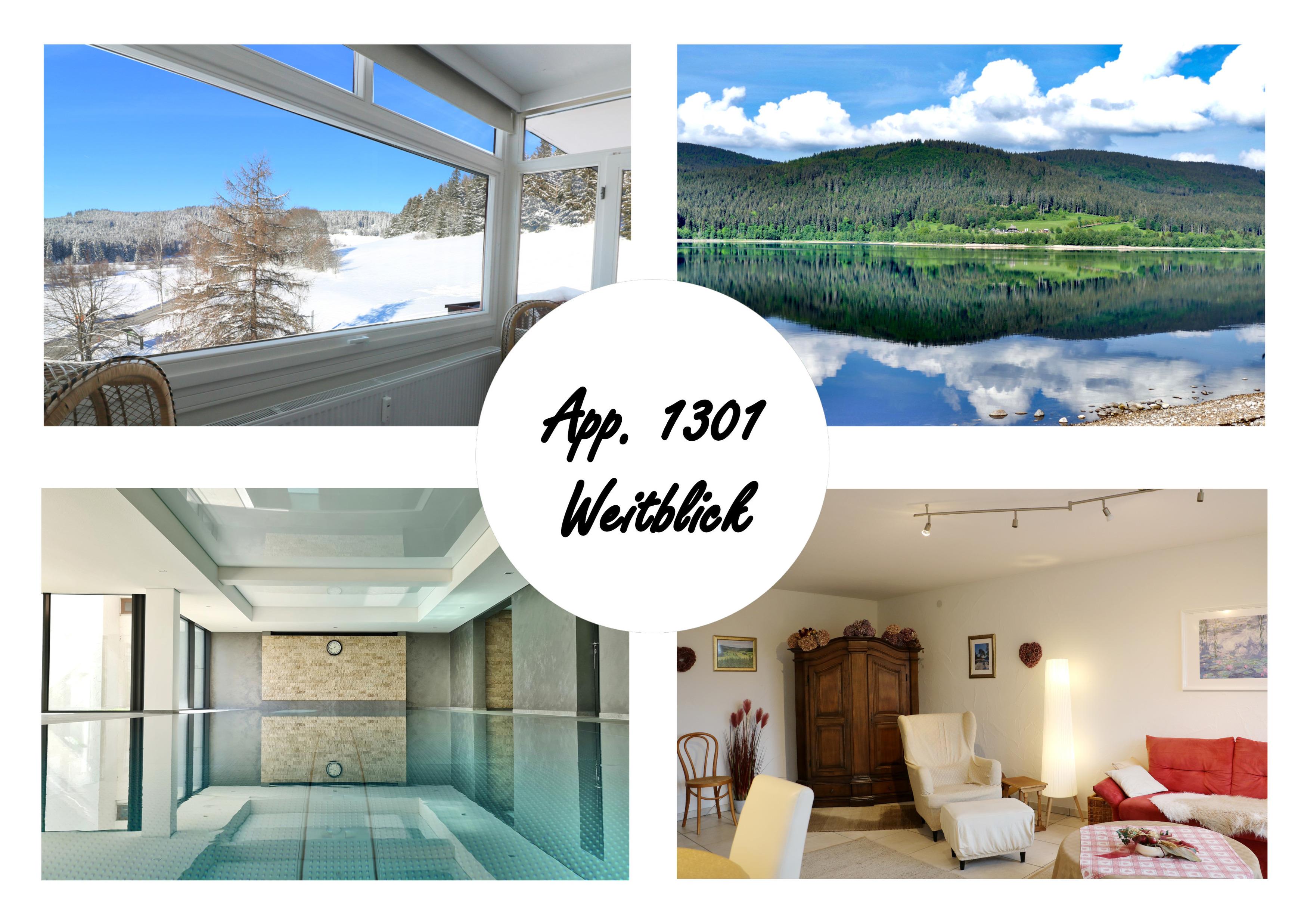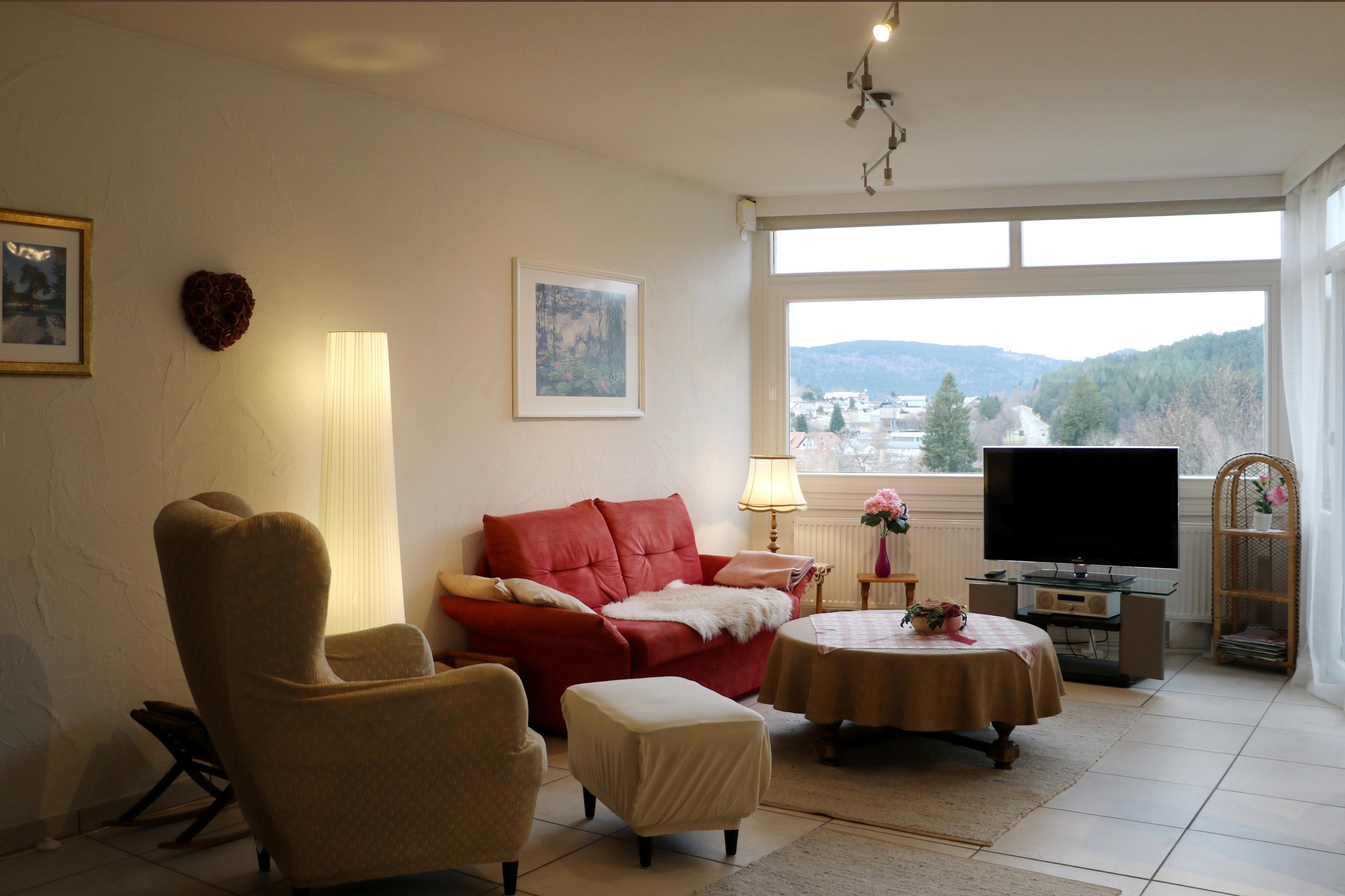 Welcome to our cozy apartment 1301 - Weitblick in the spa hotel Schluchsee. Enjoy the beautiful view towards Schluchsee and Feldberg in the spacious living room.