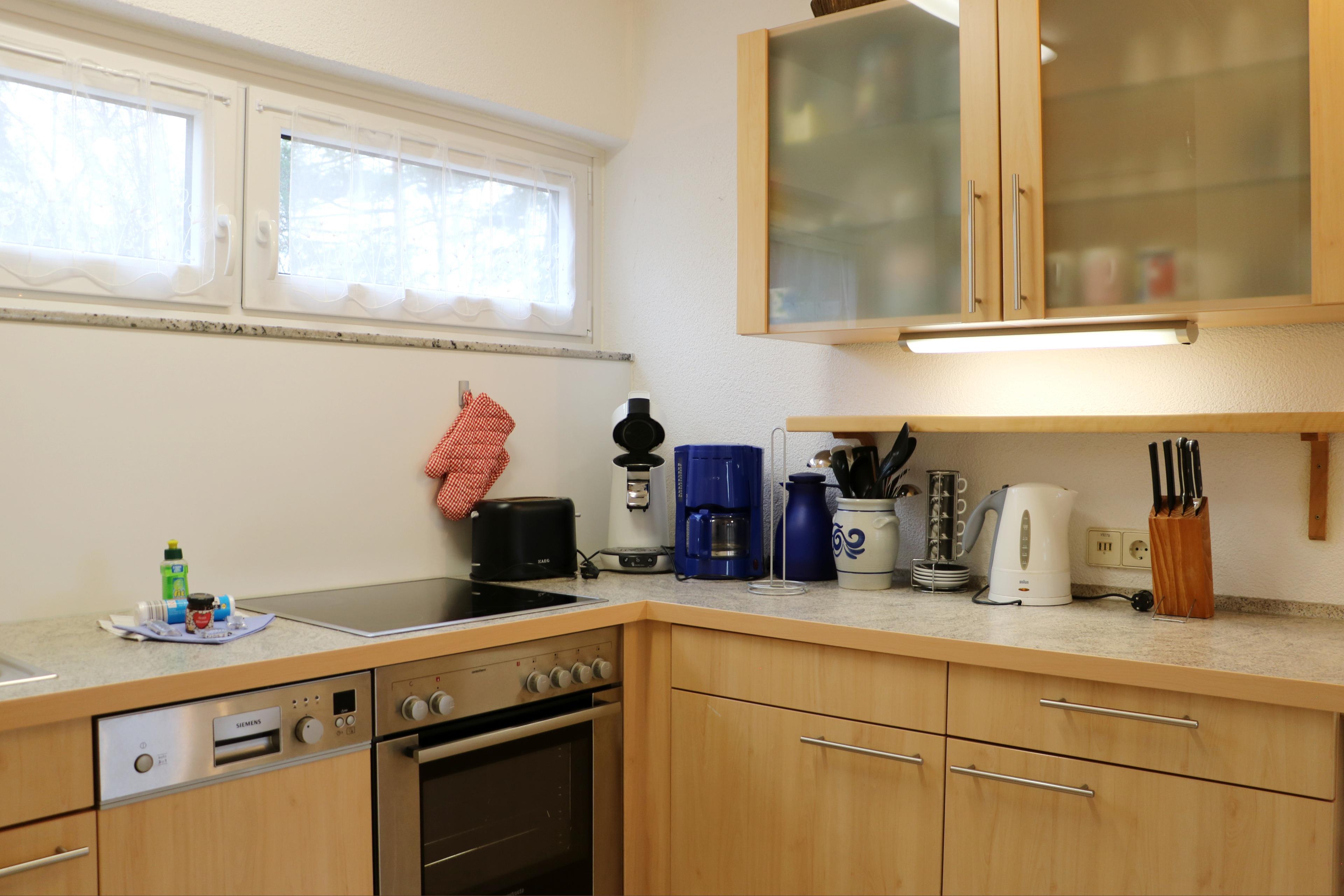 - a fully equipped kitchen with fridge incl. freezer, cooker with 4 hobs, oven, kettle, toaster, microwave, filter coffee machine, pad coffee machine and basic kitchen equipment