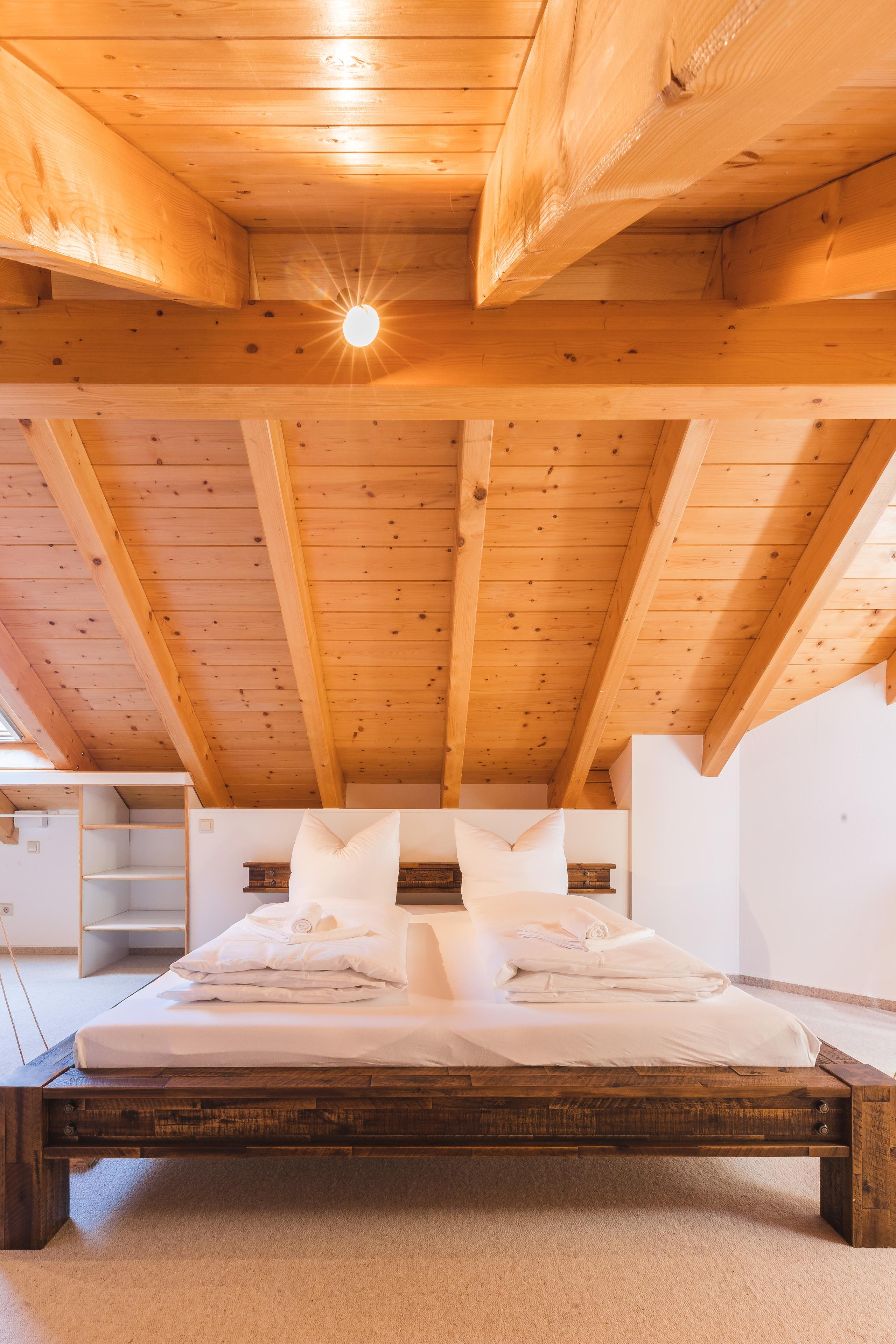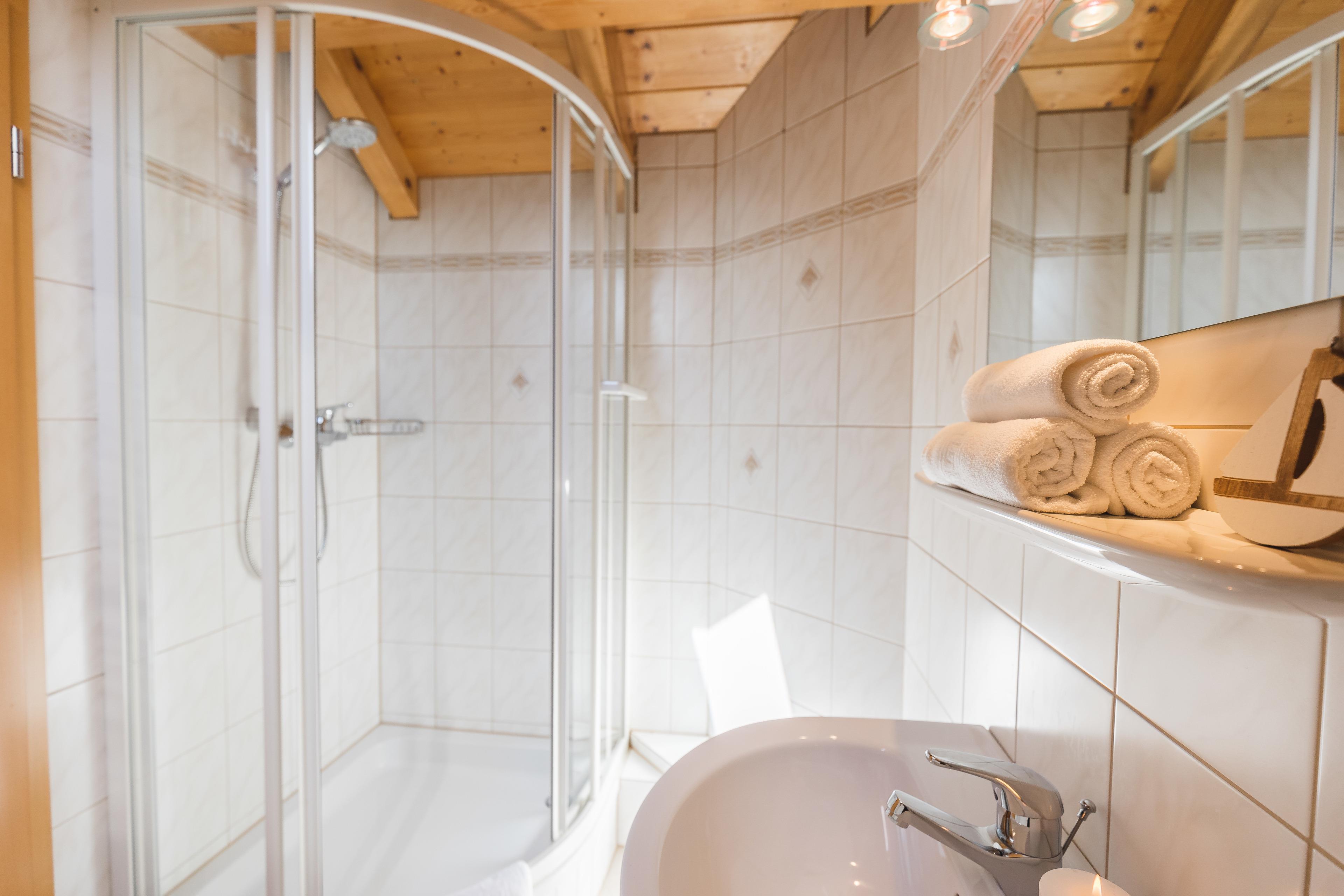 Im Dachgeschoss bildet eine großzügige Galerie das dritte Schlafzimmer mit Doppelbett (Liegefläche 1,80 x 2,00 m), Schrank, Regalen, und einem kleinen Schreibtisch im Schwarzwald-Design. Der helle Raum mit großzügigen Dachfenstern ist offen gestaltet und bietet durch einen Luftraum den Blick nach unten ins Wohnzimmer. Angrenzend befindet sich ein weiteres Badezimmer mit Dusche,