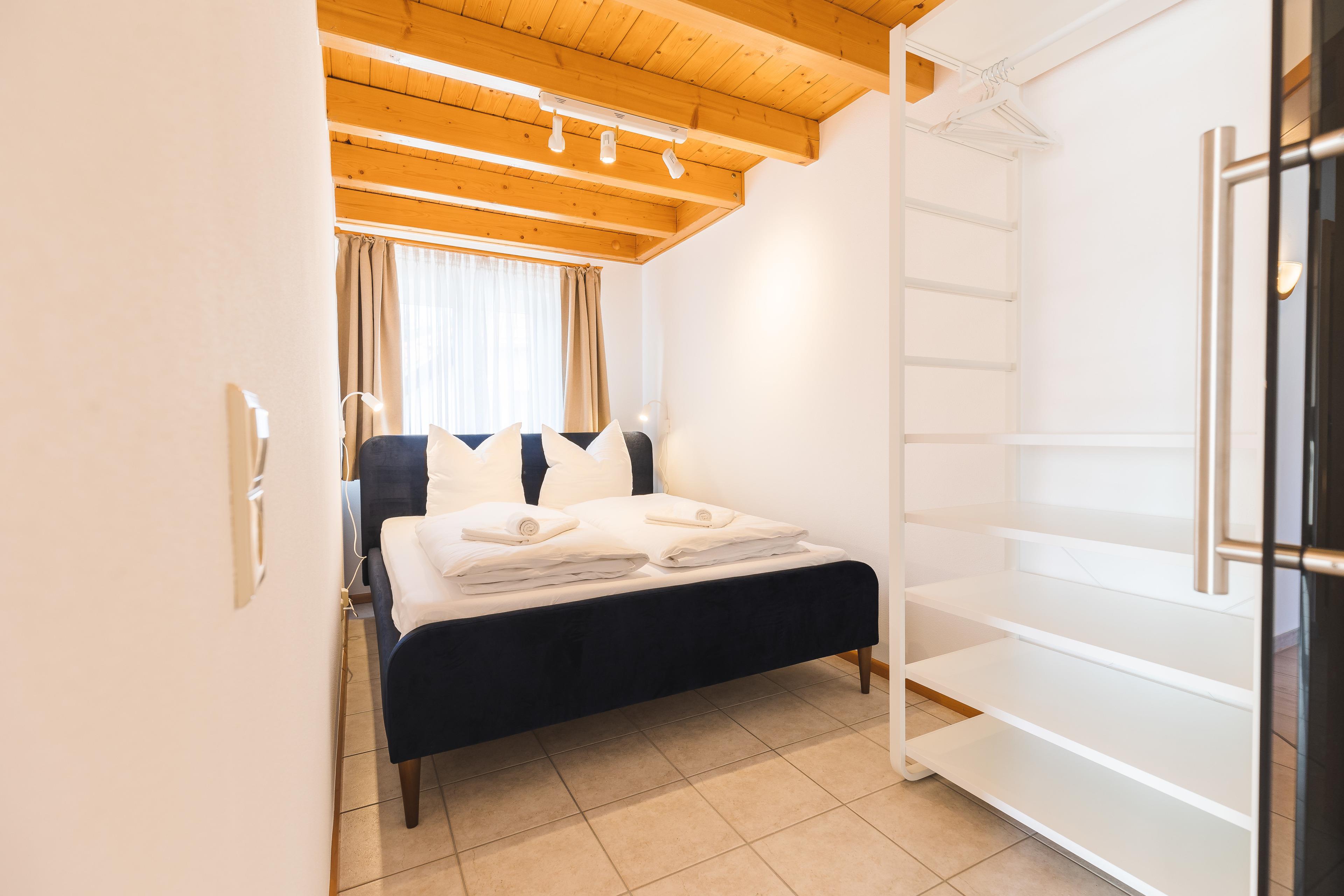 Nebenan befindet sich das zweite Schlafzimmer, welches über ein Doppelbett (Liegefläche 1,60 x 2,00 m), ein offenes Regalsystem und eine Schiebetür verfügt. Im 1.OG befindet sich zudem ein separates Badezimmer mit Waschbecken und WC.
