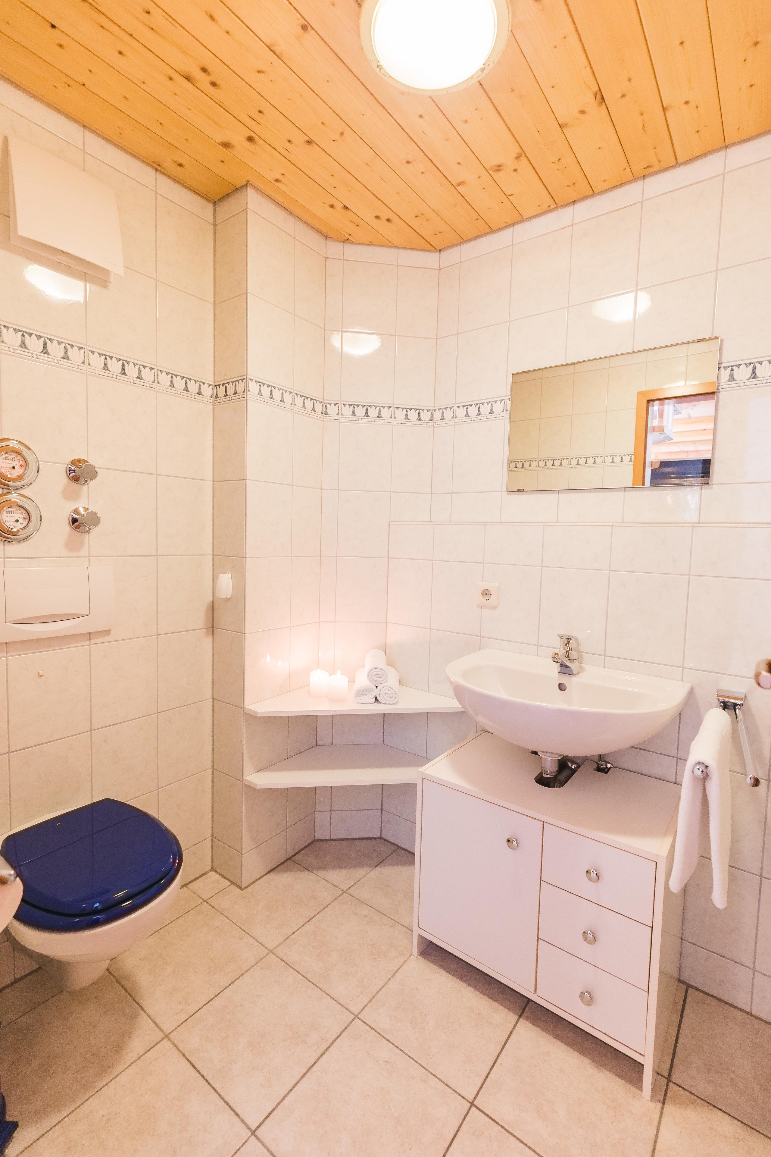 In the attic, a spacious gallery forms the third bedroom with a double bed (lying surface 1.80 x 2.00 m), wardrobe, shelves, and a small desk in Black Forest design. The bright room with generous skylights has an open design and offers a view down into the living room through an air space. Adjacent is another bathroom with shower,