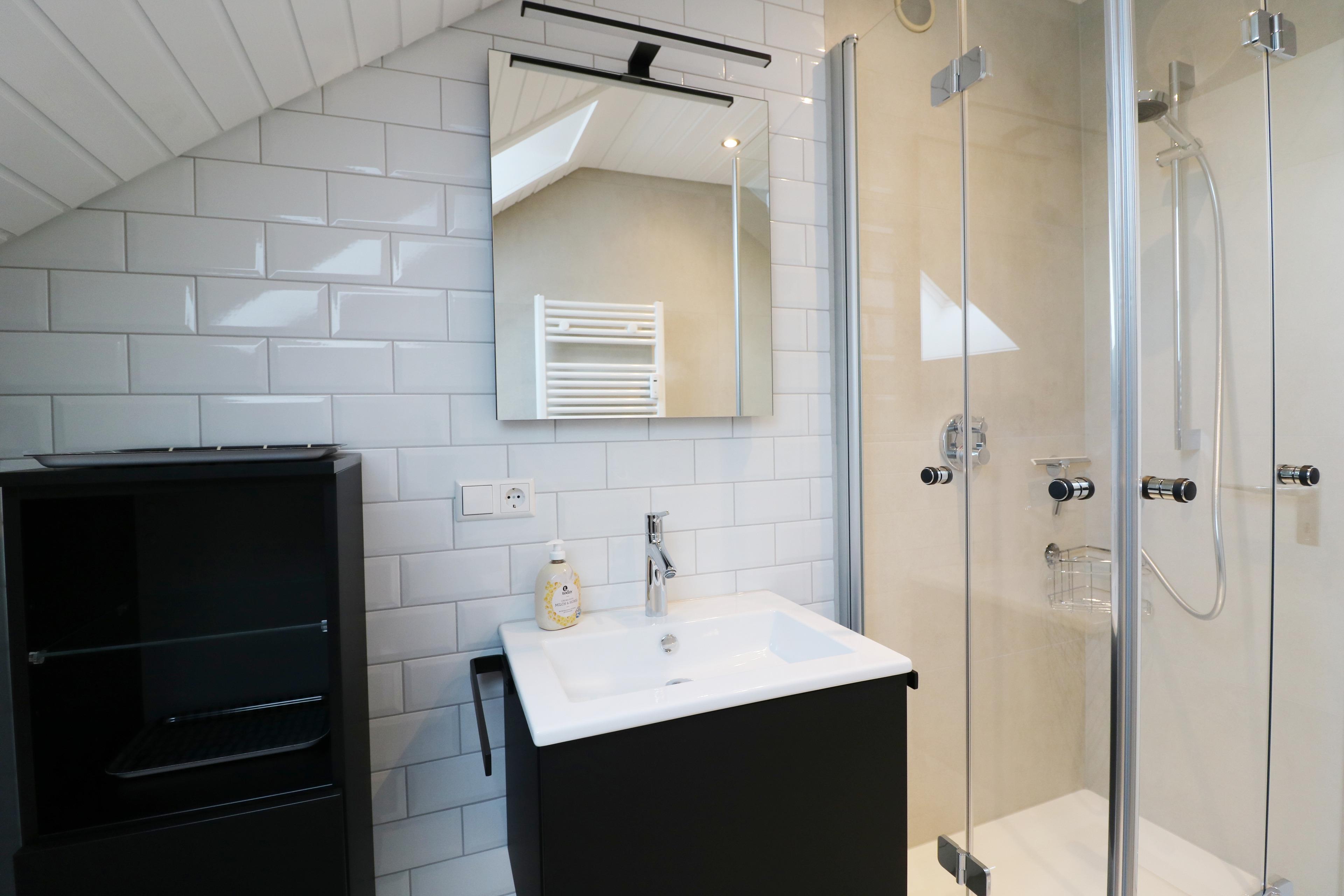 - ein Bad mit Dusche, Waschbecken, WC und Haartrockner
