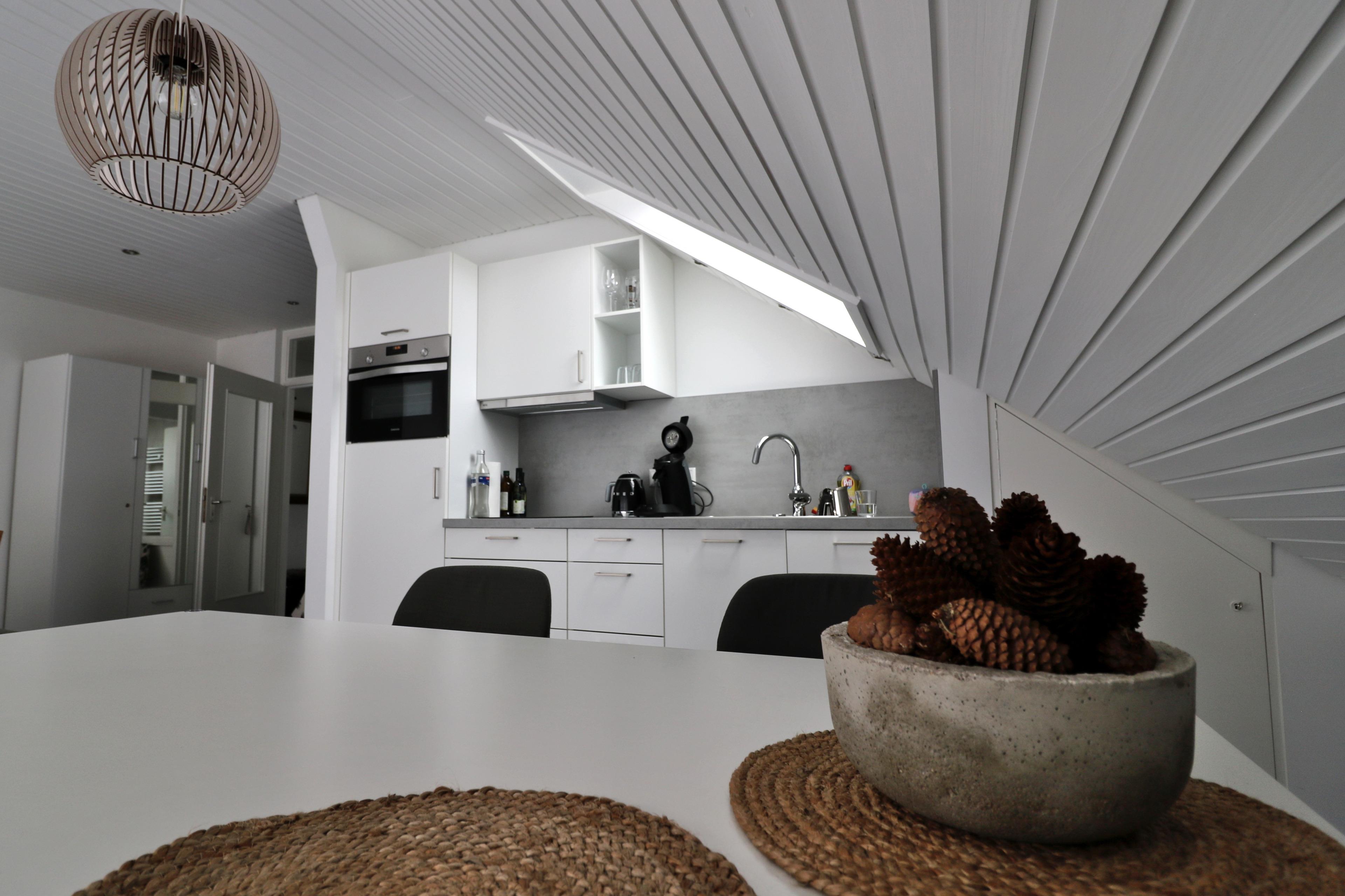 - eine vollausgestattete Küchenzeile mit Kühlschrank mit Gefrierfach, Herd mit 2 Kochfeldern, Backofen, Wasserkocher, Senso-Pad-Kaffeemaschine, Spülmaschine und Küchengrundausstattung