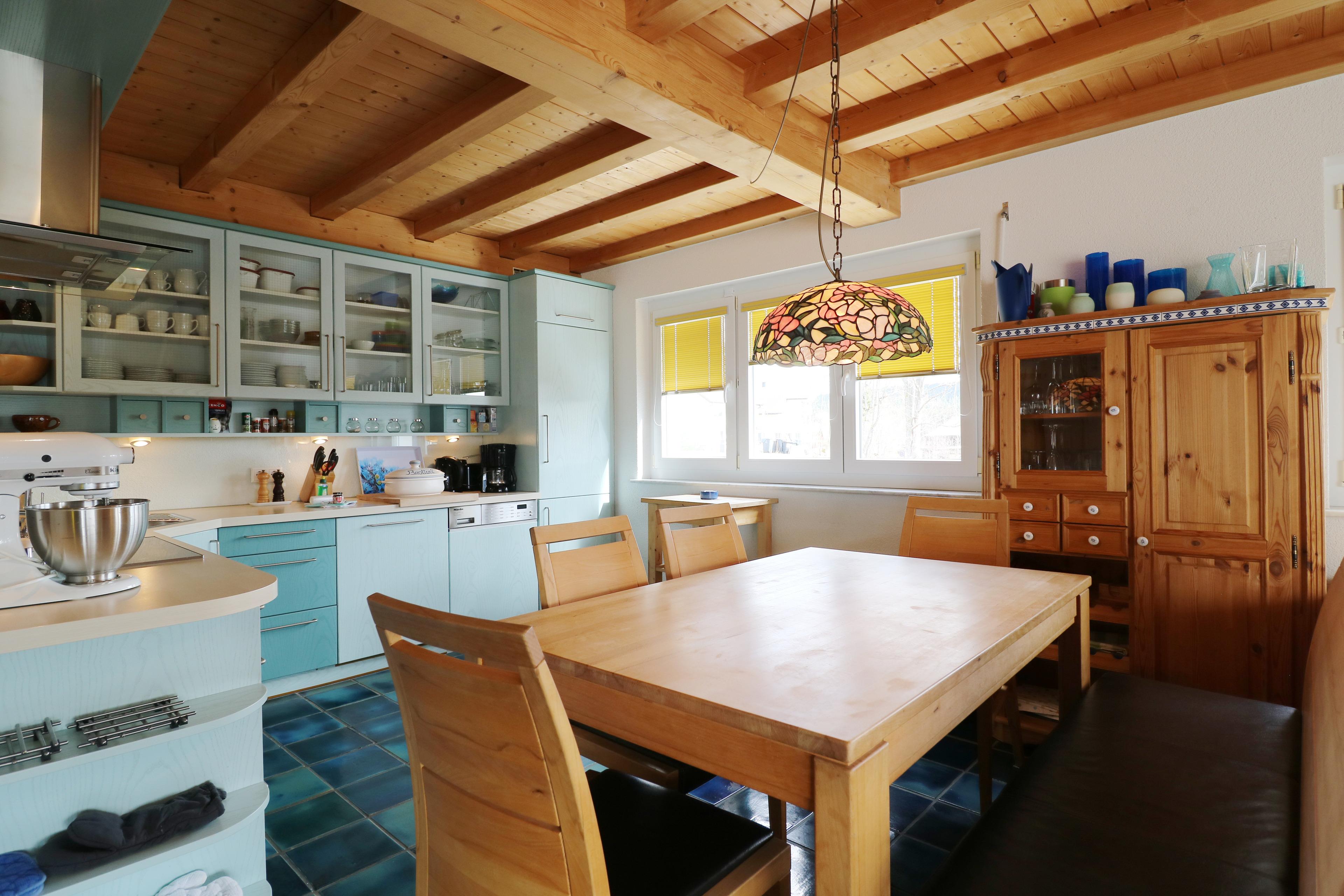 Die vollausgestattete Küche verfügt über einen Herd mit 4 Kochfeldern, Geschirrspüler, Kühlschrankkombination mit Gefrierschrank, Backofen, Filter-Kaffeemaschine, Toaster, Wasserkocher, Küchenmaschine und Küchengrundausstattung.
