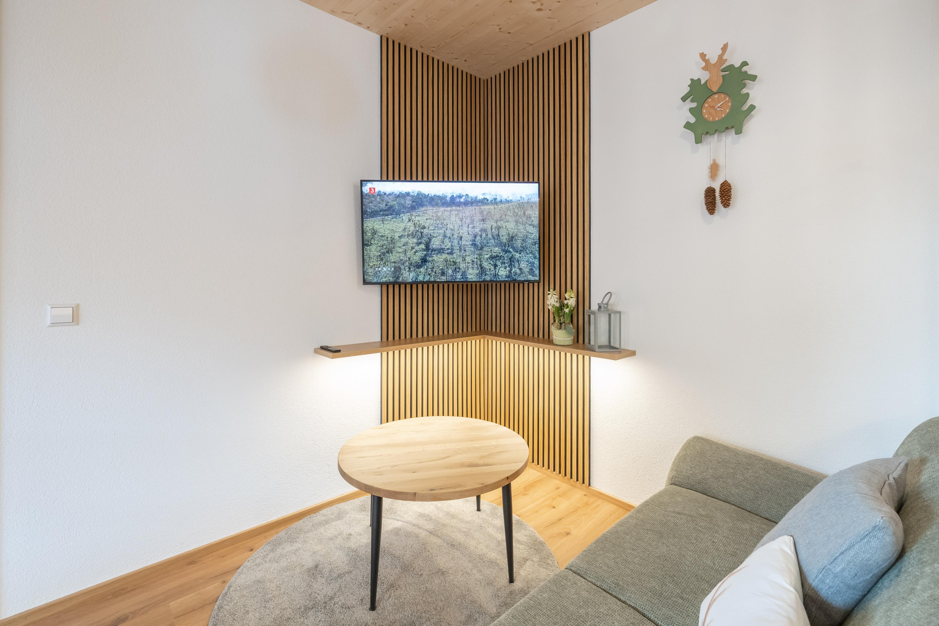- ein Wohnzimmer mit einem Sofa, Essplatz und TV