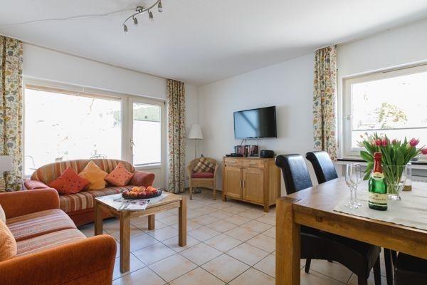 Dieses Apartment ist ebenerdig mit direktem Zugang zur Liegewiese mit Grillkamin mit Sonnenliegen und einem Kneipp-Tretbecken. Eine überdachte Terrasse lädt zum Entspannen ein. Eine moderne Küche mit Mikro, Herd mit Backofen, Geschirrspüler, Wasser- und Eierkocher, Kühlschrank mit Gefrierfach, Staubsauger usw., ein Ess- Wohnzimmer, 2 Schlafzimmern, einer ebenerdigen Dusche mit WC, Fön und verstellbarem Kosmetikspiegel, W-LAN, Sat-TV und einem großen Flachbildschirm ist für dieses Haus eine Selbstverständlichkeit. Ein Haustier ist auf Anfrage herzlich Willkommen.
