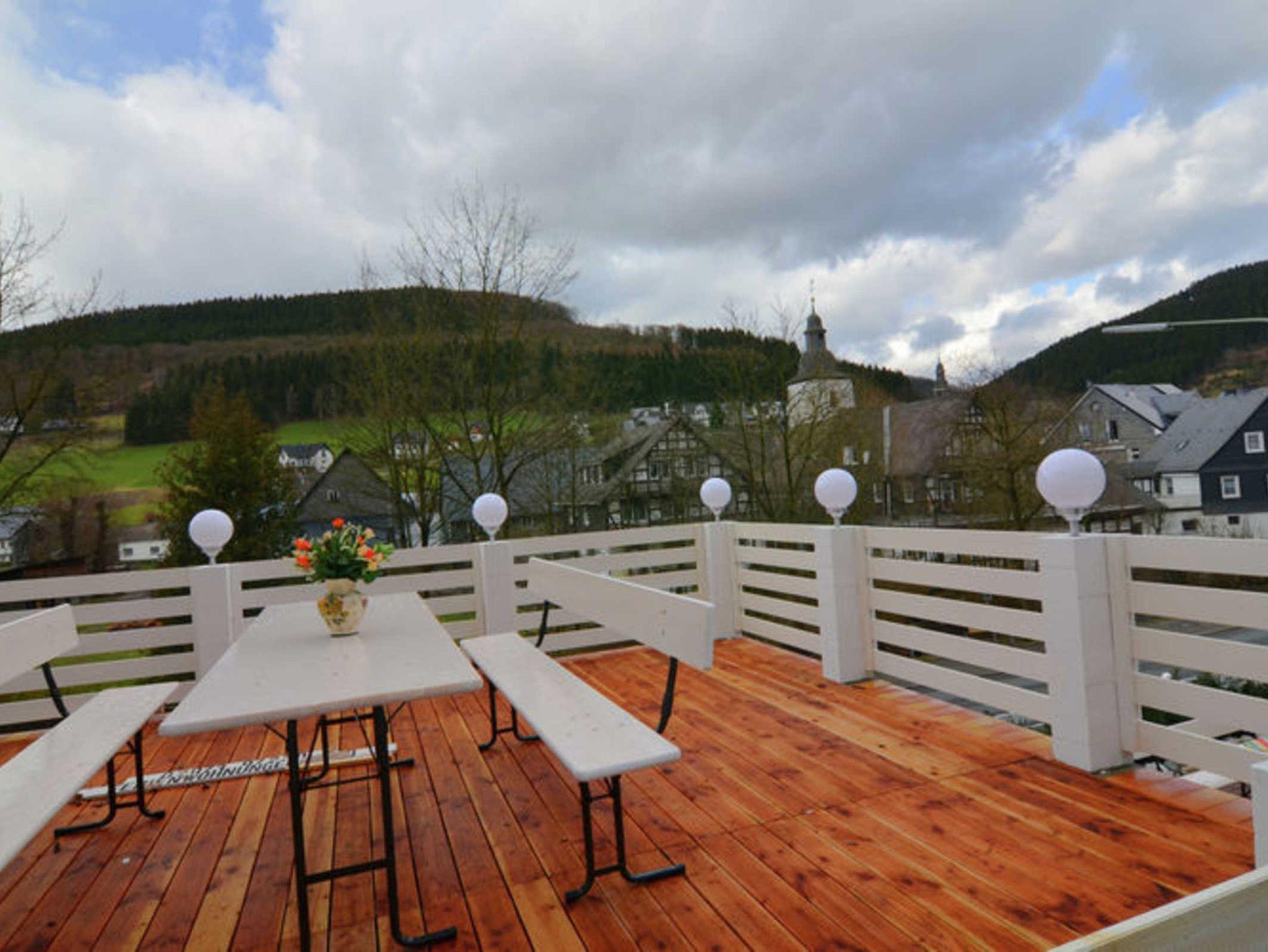 Unser Ferienhaus liegt in Oberkirchen, ein Stadtteil von Schmallenberg. In diesem Ferienhaus befinden sich 5 Wohnungen . Die einzelnen Wohnungen verfügen über 2 Schlafzimmer mit Doppelbett, ein Badezimmer (mit Dusche und WC) und ein Wohnesszimmer (mit TV-Sat) mit einer gut ausgestatteten Miniküche. Dazu befinden sich im Keller des Hauses ein Abstellraum für Skiausrüstung, Fahrräder etc. Ganz neu und frisch renoviert steht unseren Gästen nun auf Wunsch gegen Aufpreis auch ein Geimeinschaftsraum zum geselligen Beisammensein zur Verfügung. Dieser verfügt über eine voll ausgestattete Küche, einen Essbereich, TV und Musikbox. Bei allen offenen Fragen können Sie gerne telefonisch zu den üblichen Öffnungszeiten Kontakt zu unserem Vermietungsbüro aufnehmen.. Die Außenanlage besteht aus einer großen Terasse, die auf drei Ebenen aufgeteilt und mit Sitzecken ausgestattet ist. Dazu stellen wir Ihnen einen Grill und Sonnenliegen, sowie drei Parkplätze direkt am Haus und zwei Stellplätze 100m vom Haus entfernt zur kostenlosen Nutzung.