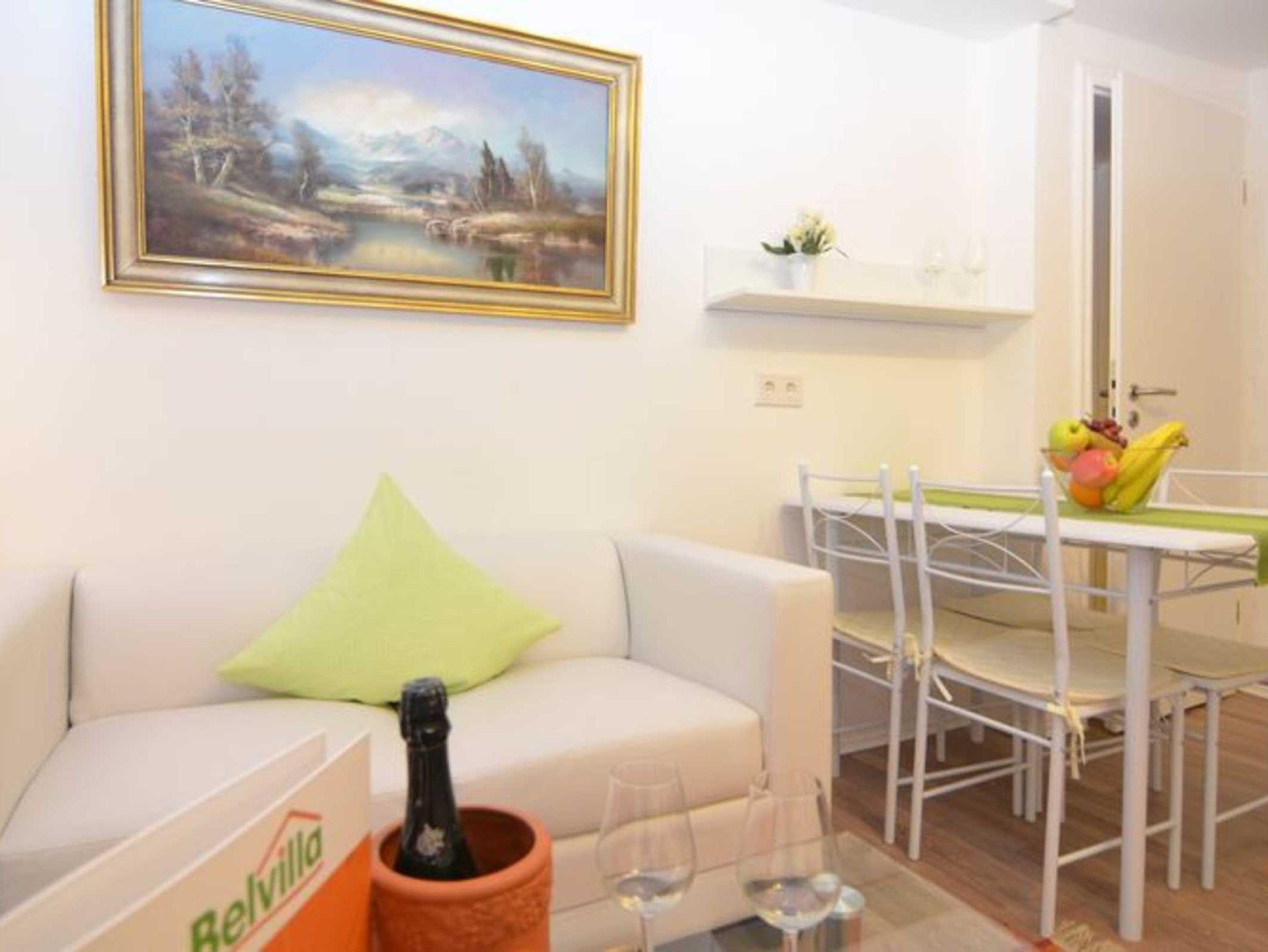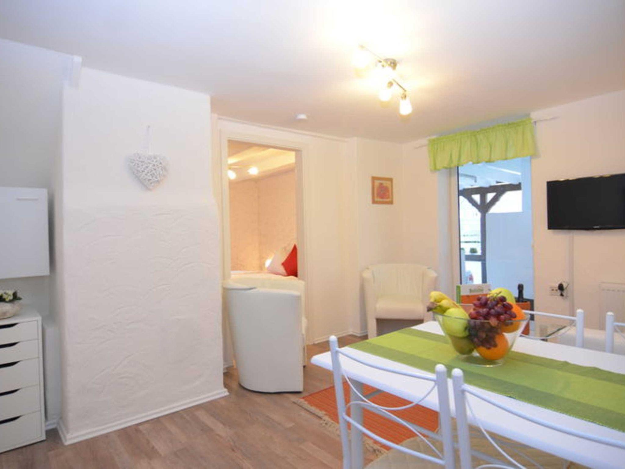 Ferienwohnung mit 2 Doppelbetten für 4 Personen. Minikücke und Wohnzimmer inkl. Ausstattung. Badezimmer mit Dusche. Handtücher, Strom und Heizung sind im Preis inbegriffen.