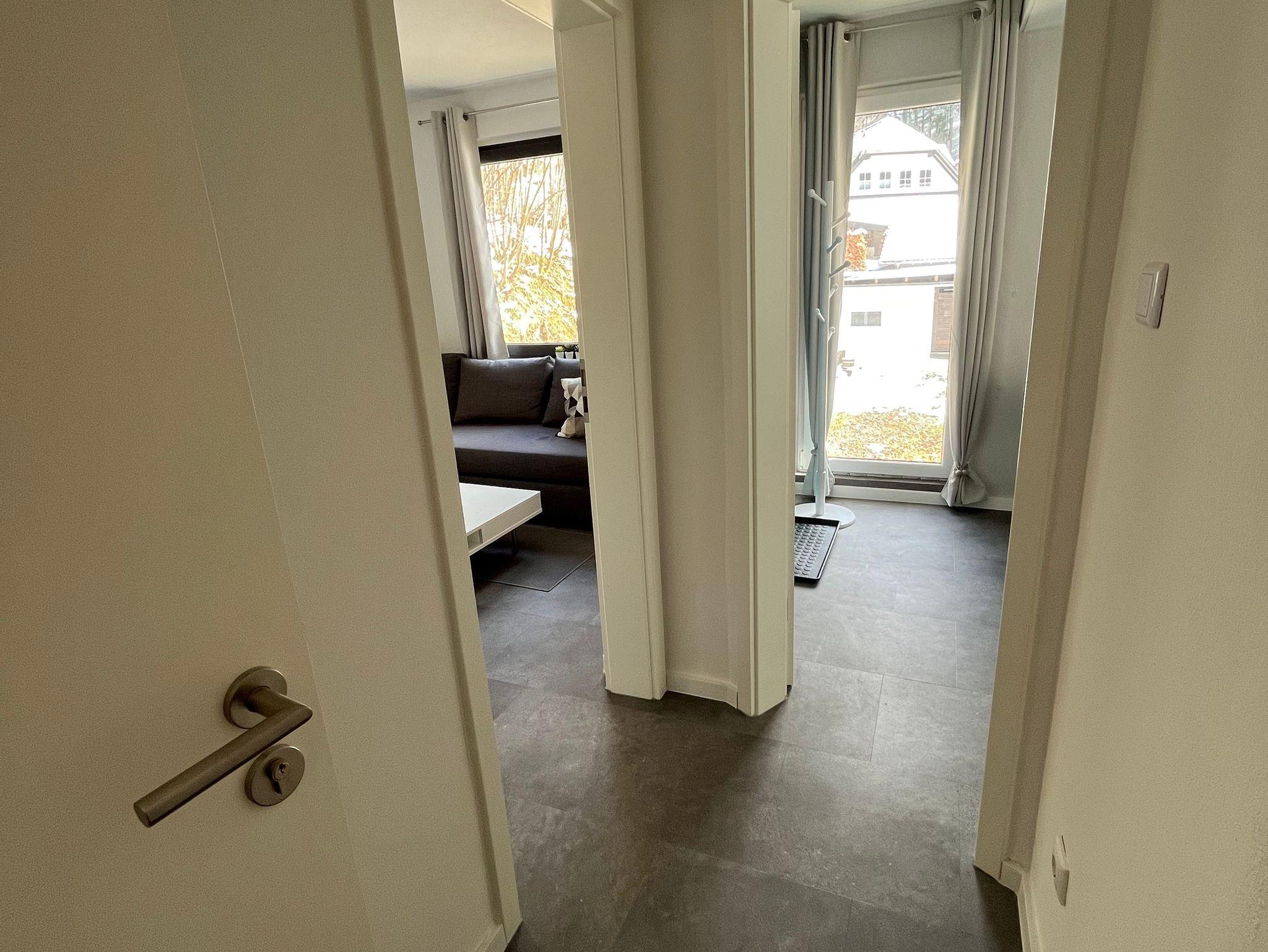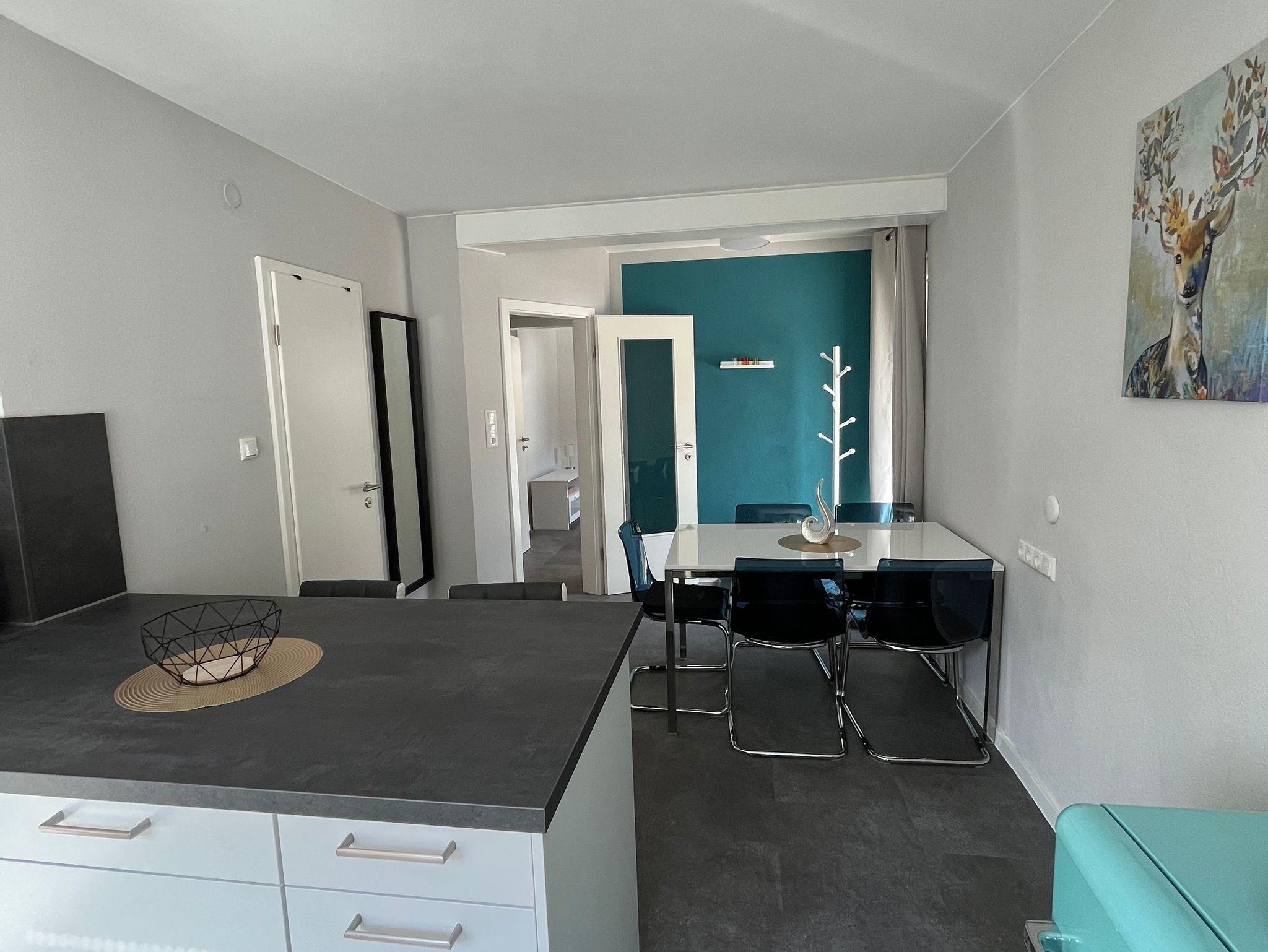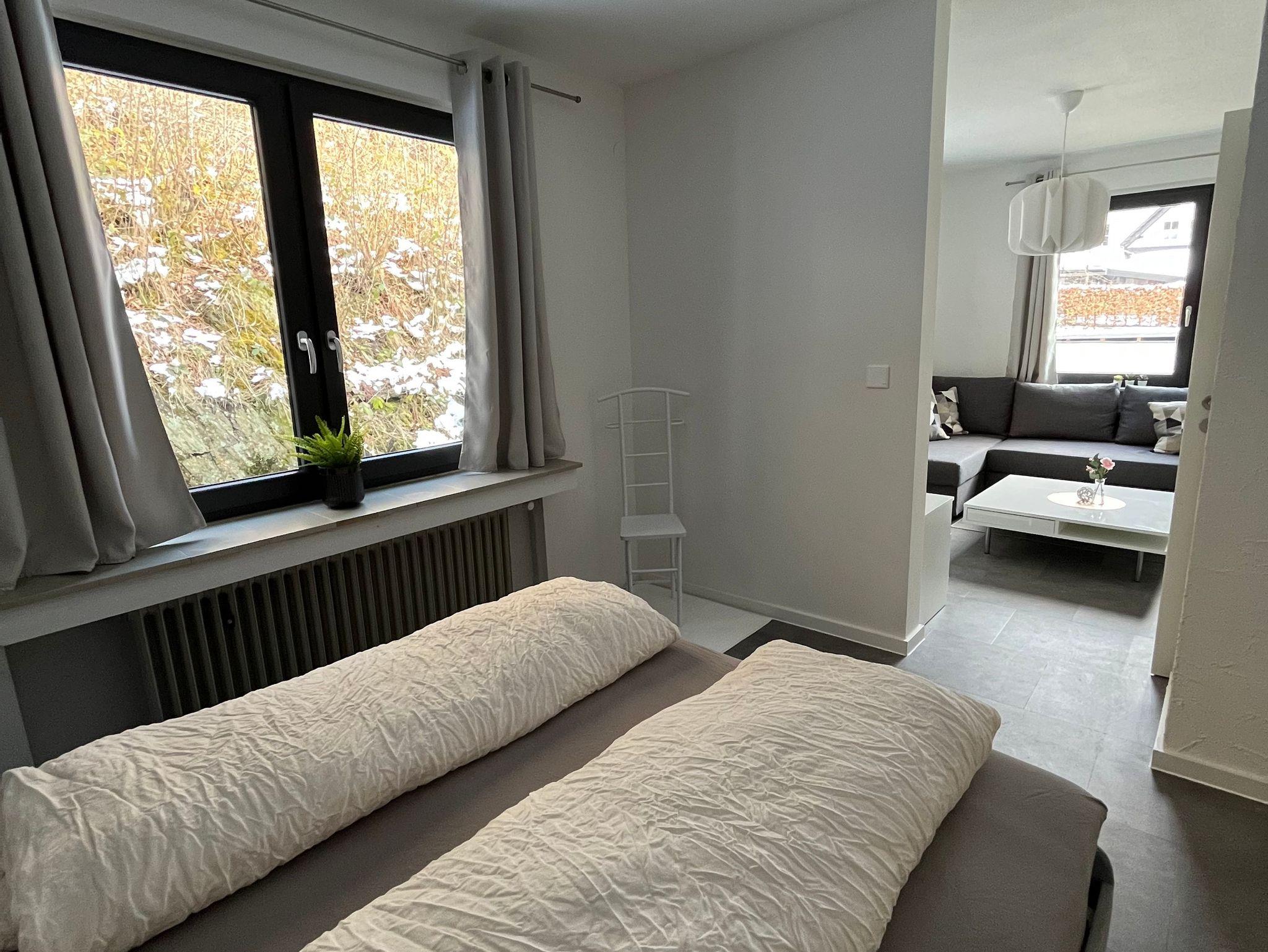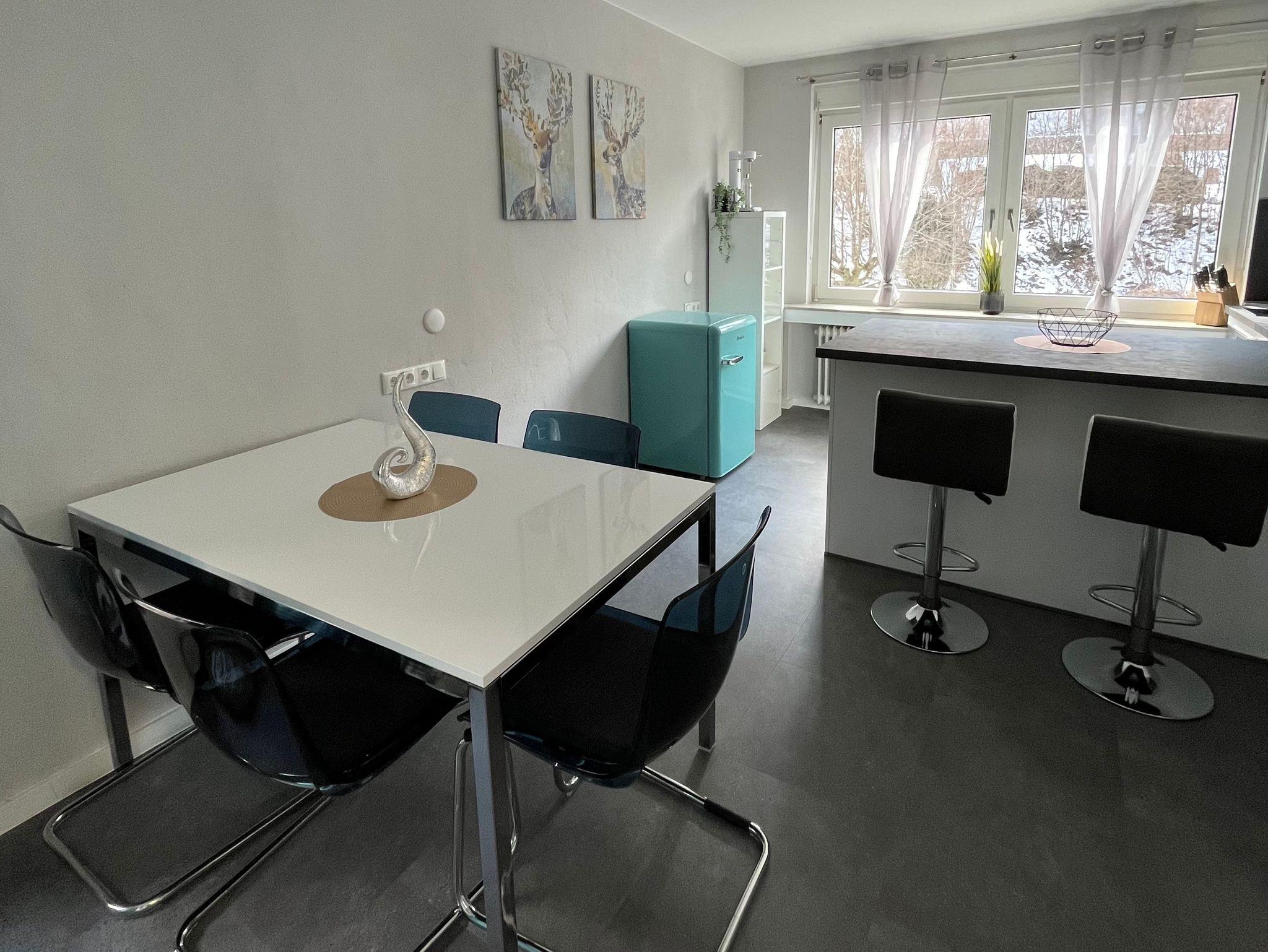 Die gemütliche, modern ausgestattete Ferienwohnung Dachs für zwei Personen verfügt über eine offene Küche, eine Essgelegenheit, Bad mit WC und Dusche, und ein Wohnzimmer mit angrenzendem Schlafzimmer.