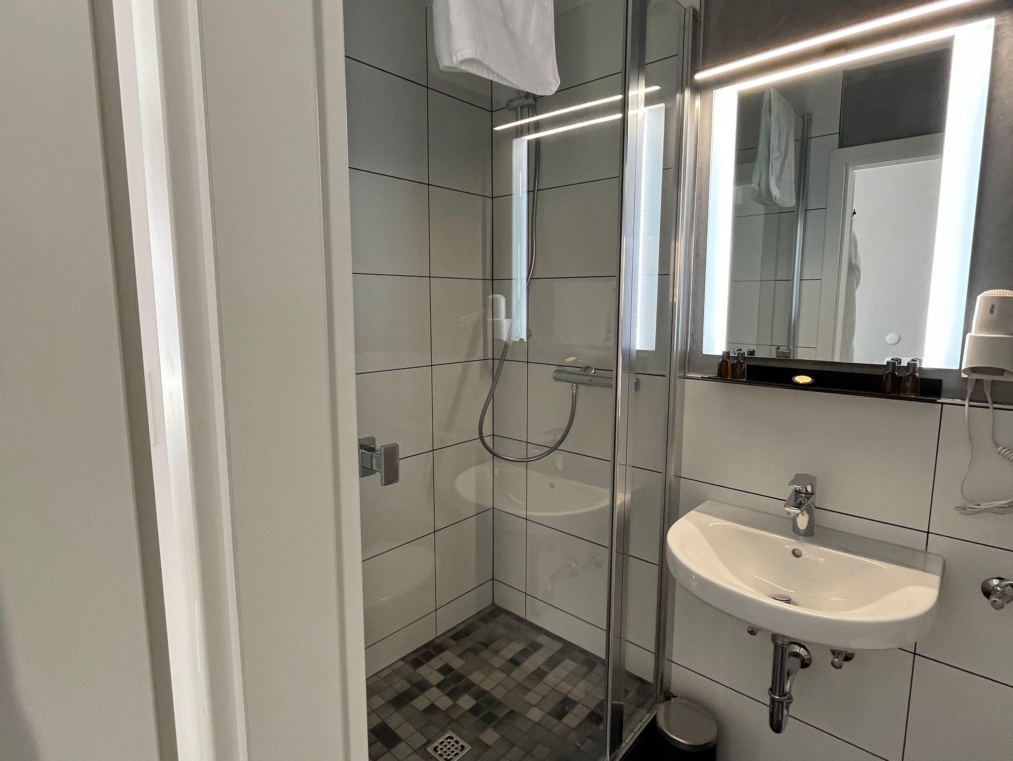 Das Bad verfügt über eine geräumige Dusche, sowie ein WC und ein Waschbecken.