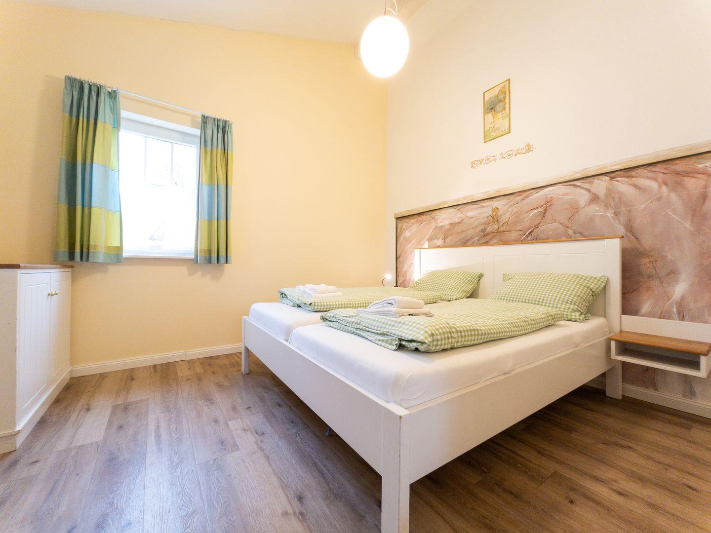 90 qm, Terrasse, 3 Schlafräume (das Elternschlafzimmer mit Doppelbett, das Kinderzimmer mit 2 Einzelbetten und im EG ein Zimmer mit 160 cm breitem Bett), Wohnküche, Bad mit Dusche und Wanne, zusätzliches WC im Erdgeschoss