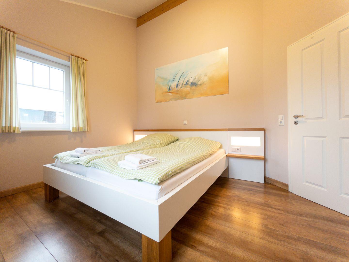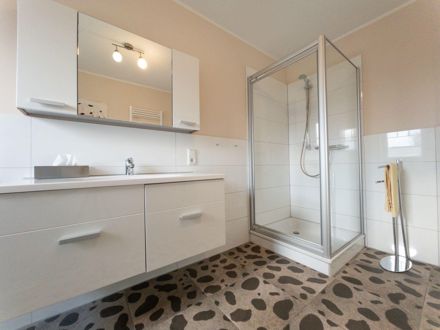 110 qm, Terrasse, 3 Schlafräume (ein Schlafzimmer im Erdgeschoss), Wohnküche, ein Bad mit Dusche und Wanne, ein weiteres Bad mit Dusche im EG.