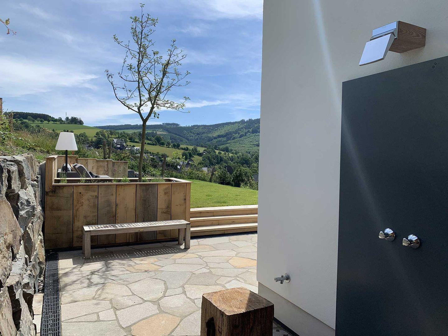 Saunaliebhaber finden eine herrliche Außensauna vor, direkt am Hang und davor eine uneinsehbare Außendusche.