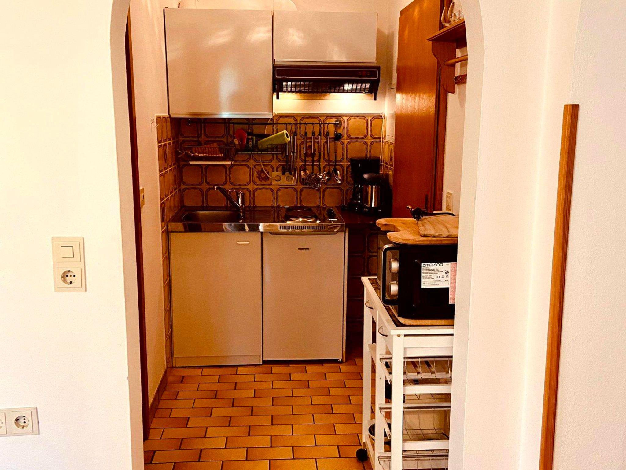 Die Küche der Ferienwohnung ist komplett ausgestattet mit einem Herd mit zwei Kochplatten, Kühlschrank mit kleinem Gefrierfach, Spüle, Kochtöpfen, Bratpfannen, Geschirr, Kaffeemaschine, Eierkocher und Toaster.
