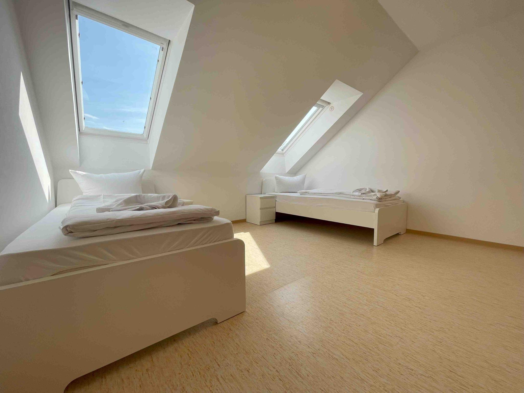 The furnished 65 m² attic flat in Stamsried has two bedrooms, each with two single beds, and is suitable for up to four people. It is possible for a fifth person to sleep on the sofa.