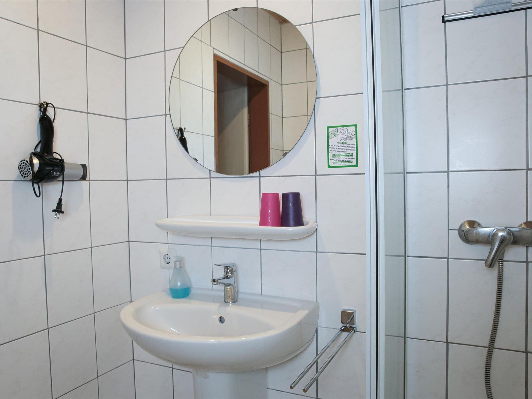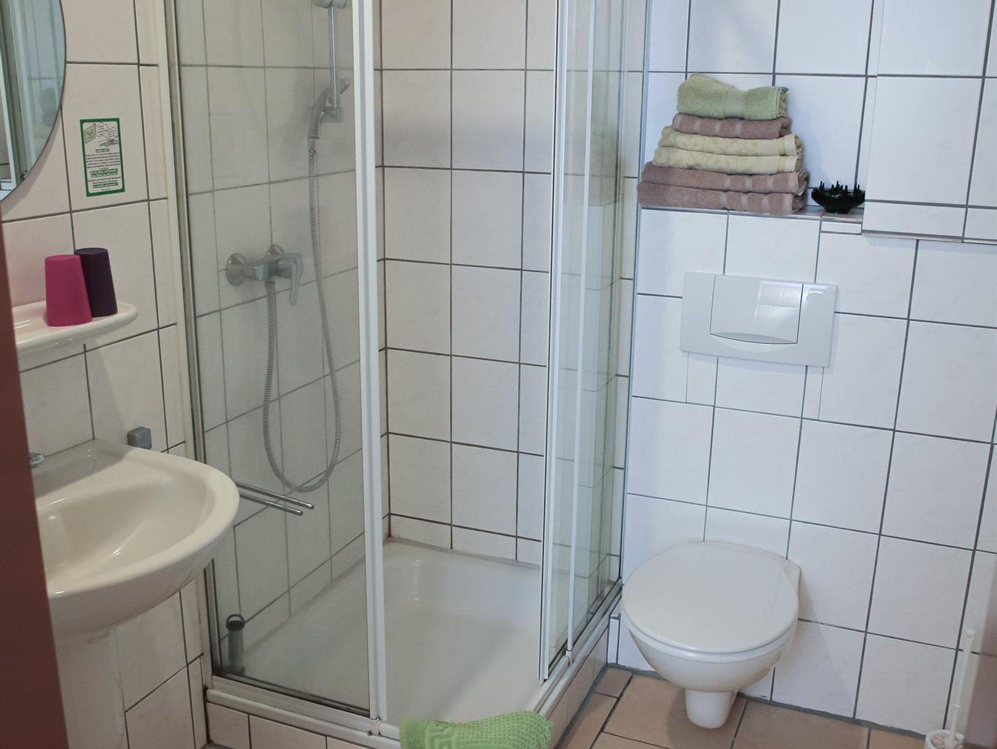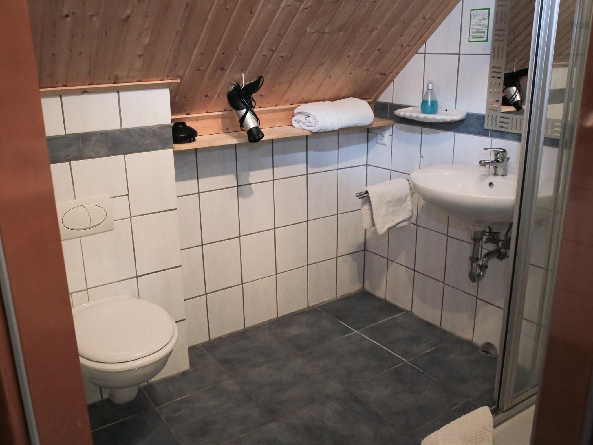 Doppelzimmer im Obergeschoss, Bad mit Dusche und WC, inklusive Frühstück.