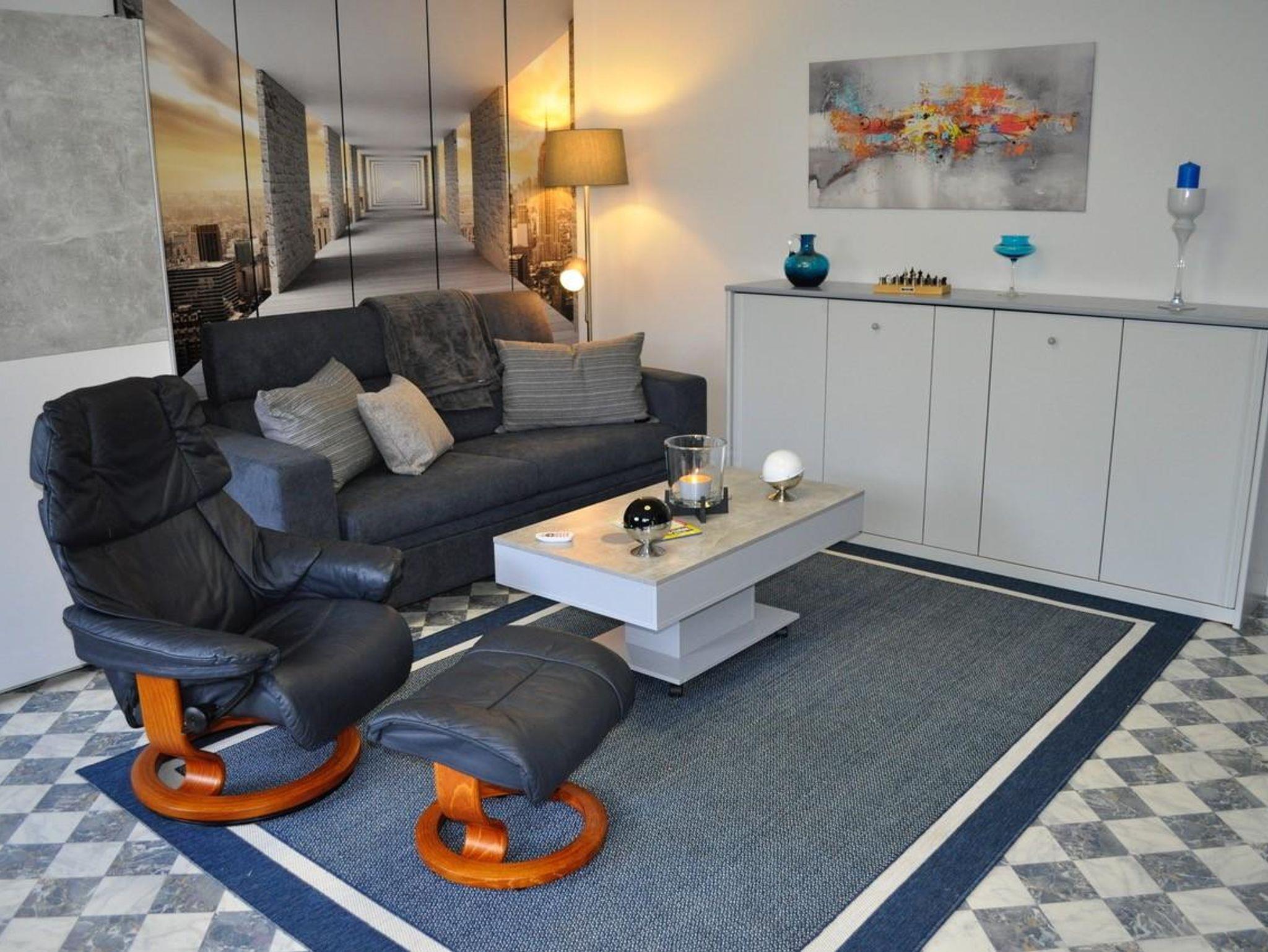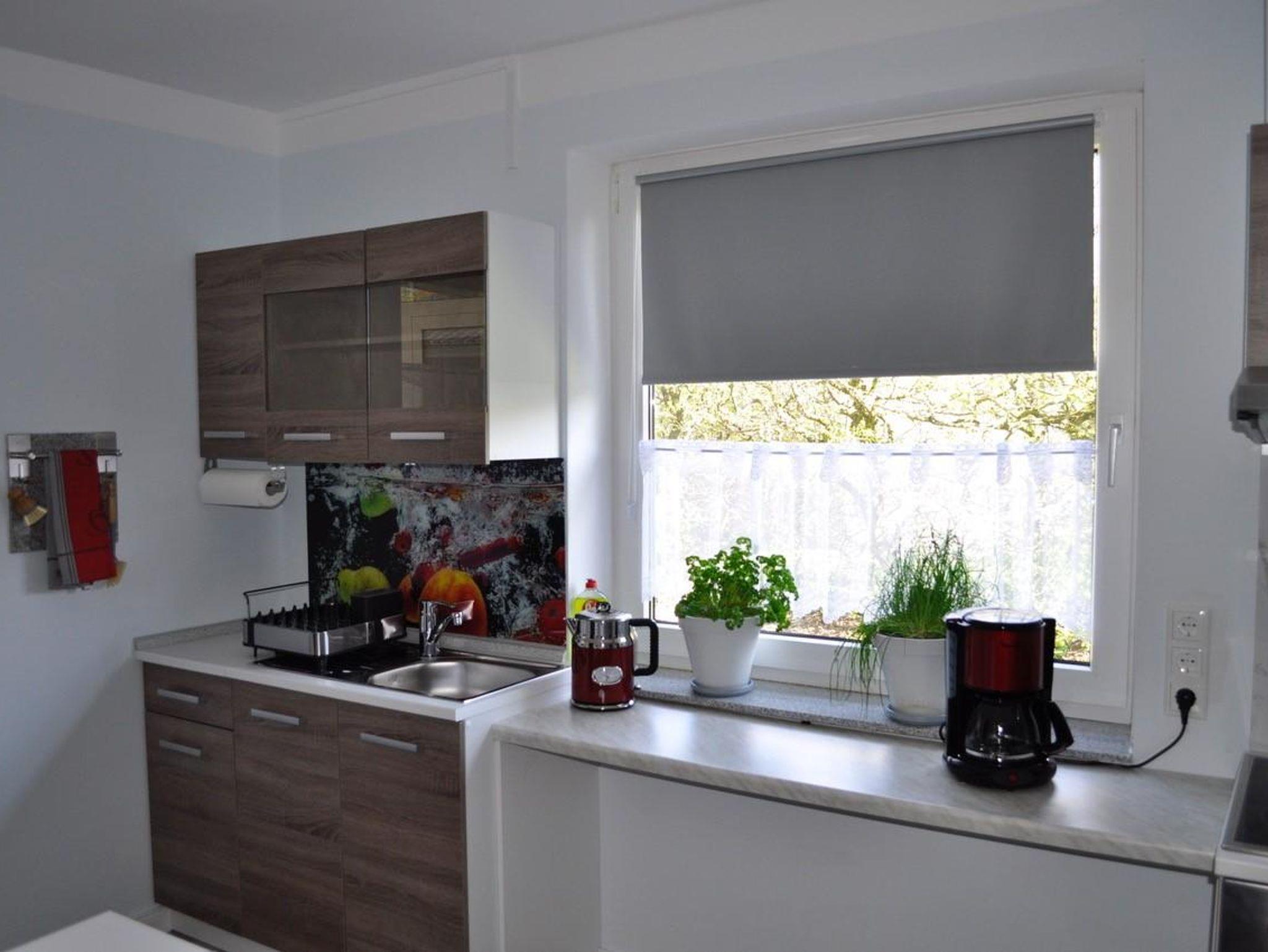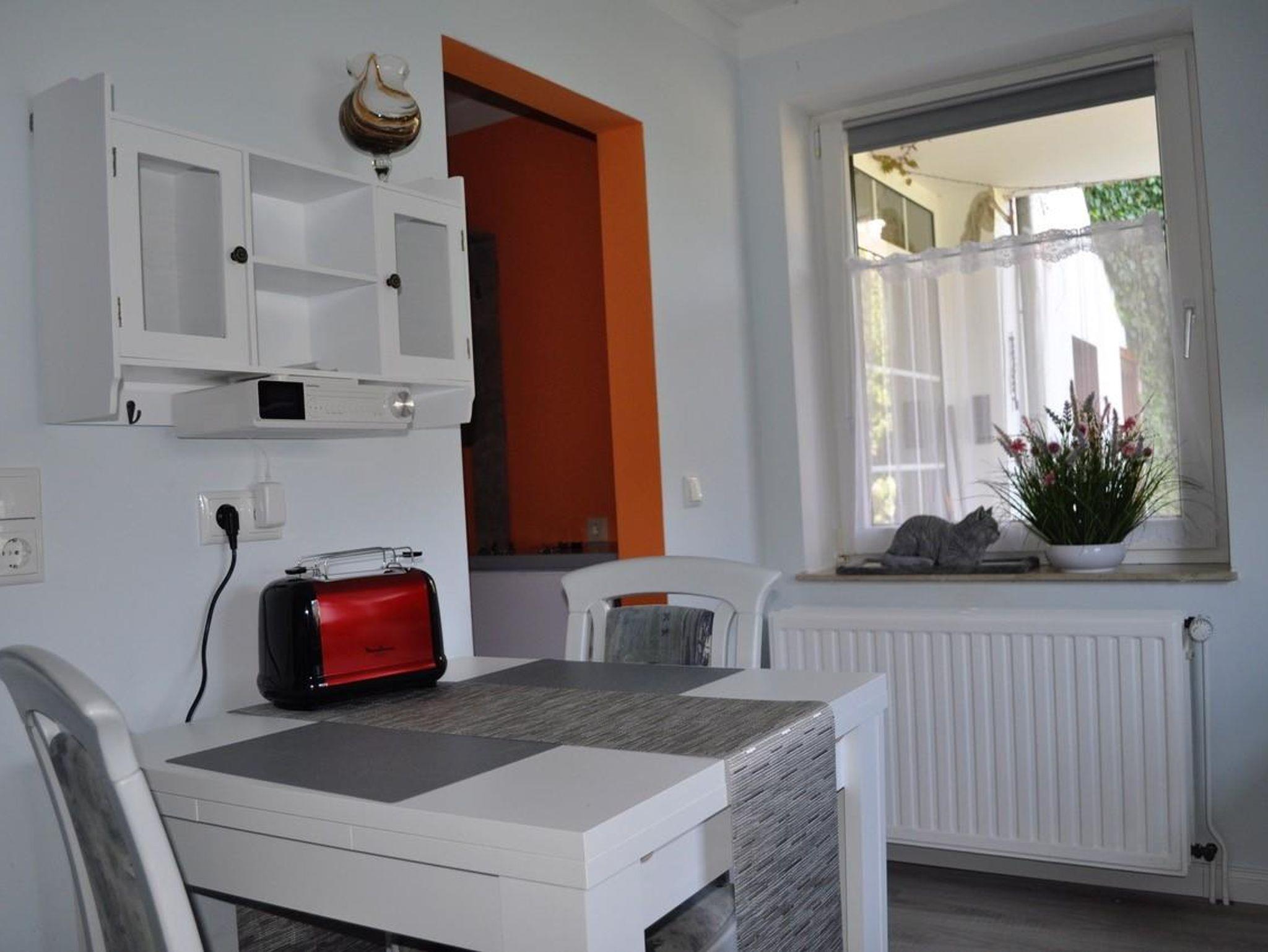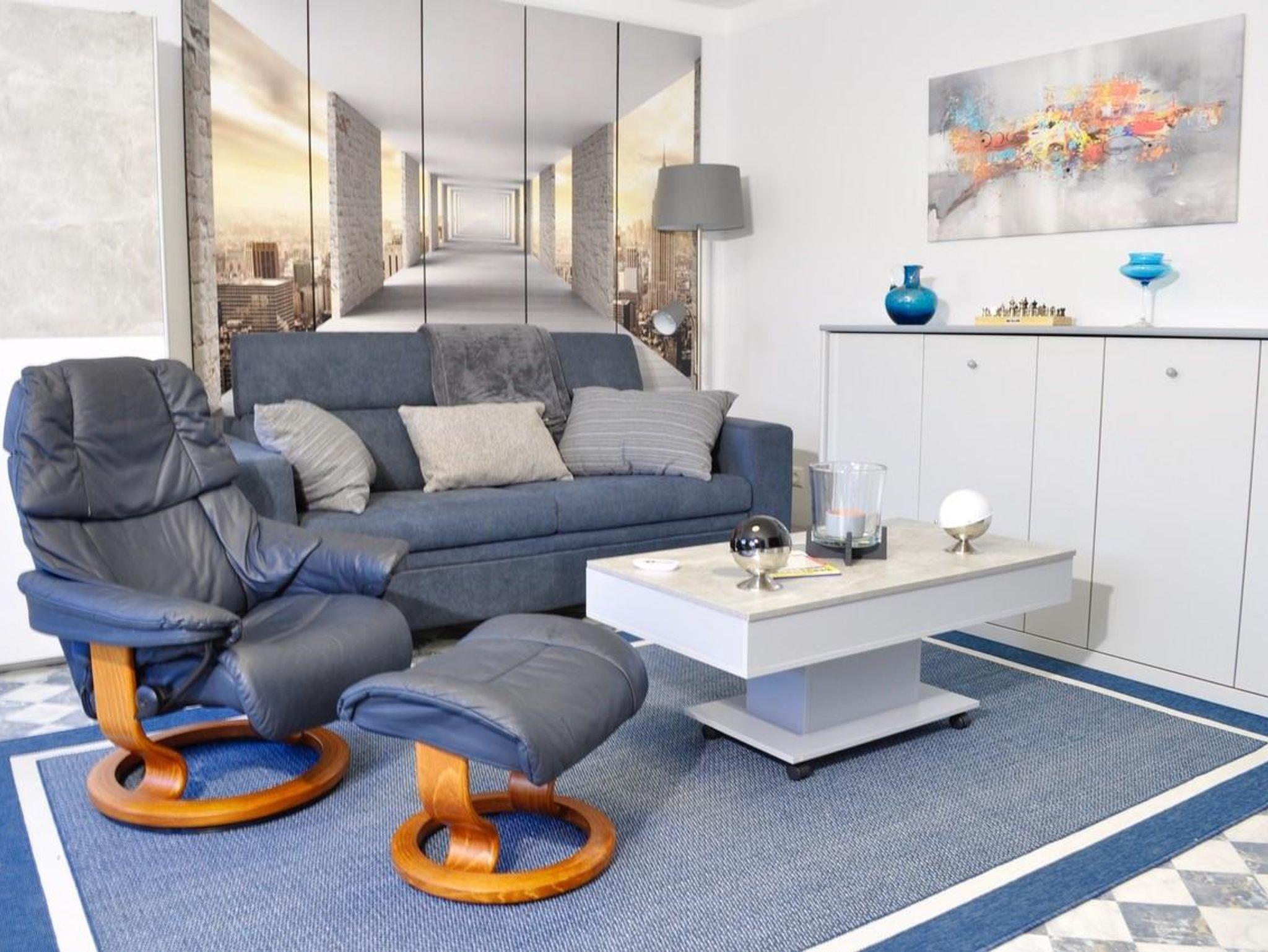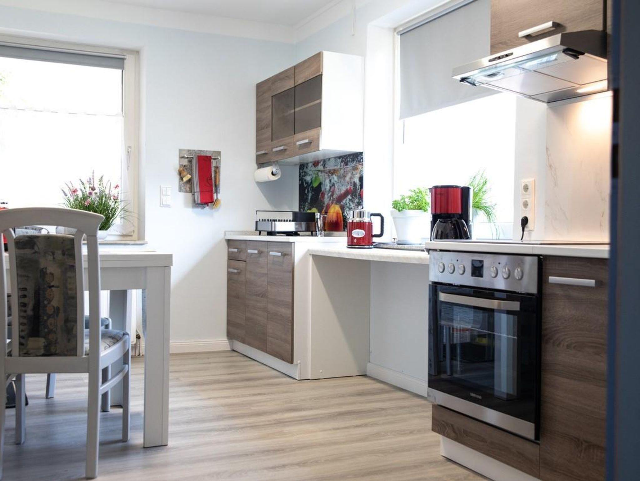 Die hell und modern eingerichtete Ferienwohnung verfügt über einen Wohn-Schlafraum, eine komplett ausgestattete Küche sowie ein Bad mit ebenerdiger Dusche und WC.