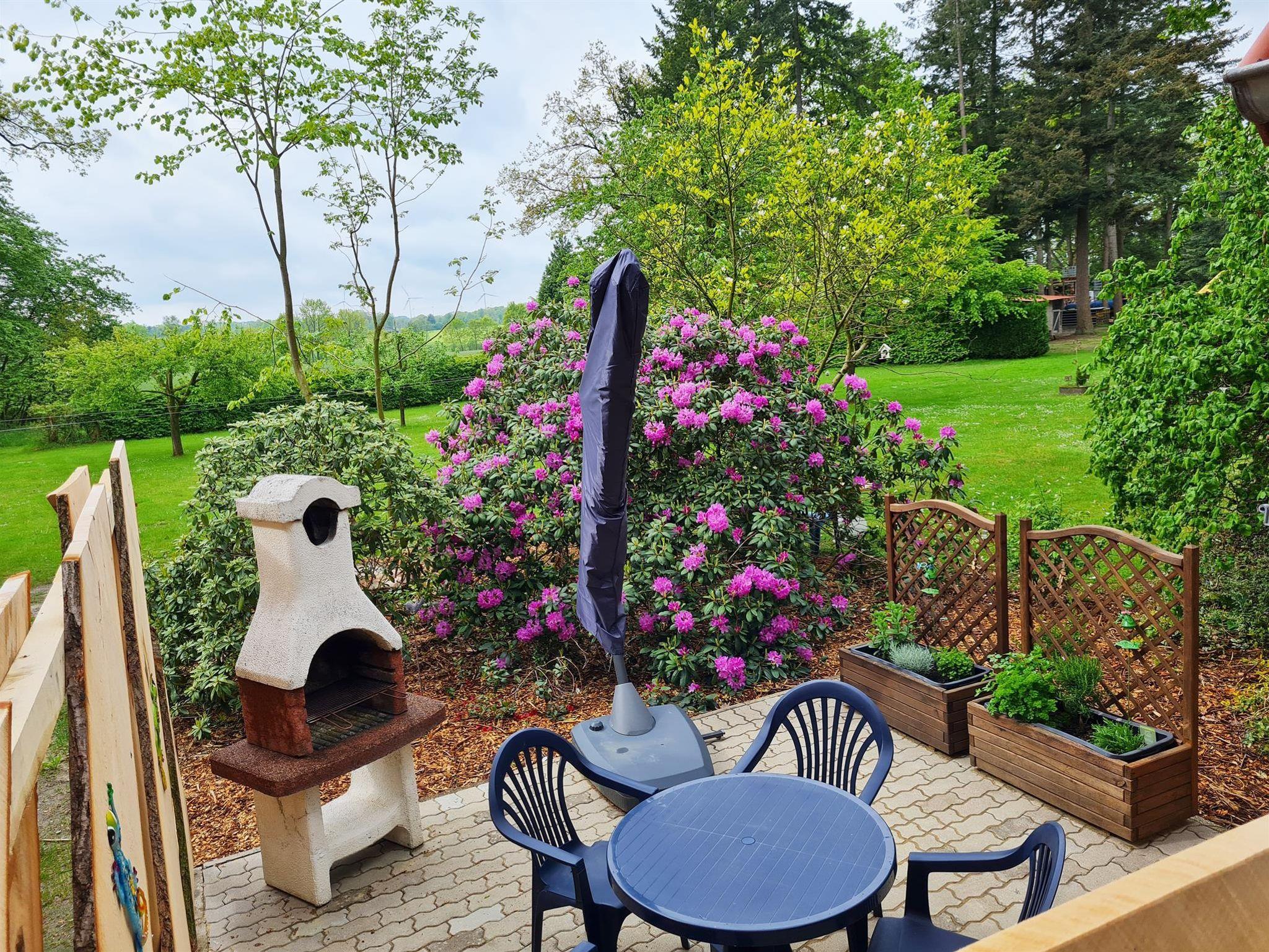 Die Ferienwohnung befindet sich auf einem parkähnlichen Grundstück, umrahmt von Tannen, Eichen und Buchen in ruhiger, ländlicher Lage. Dennoch ist die nächste Einkaufsmöglichkeit keinen Kilometer entfernt.