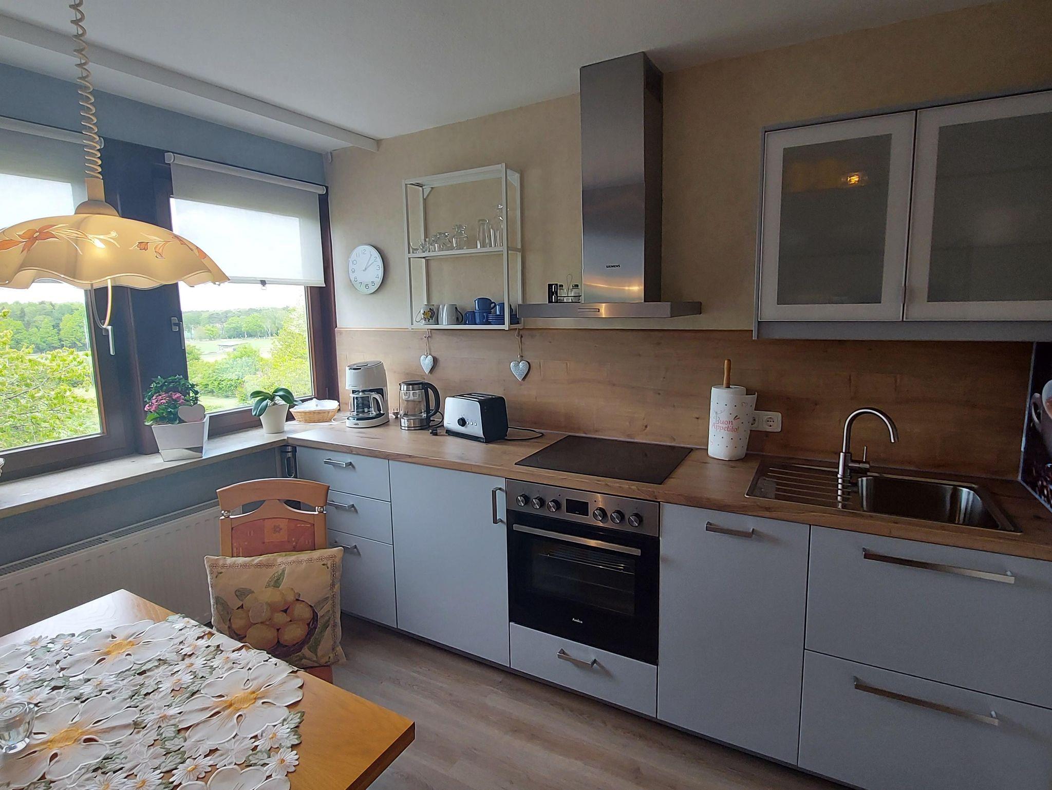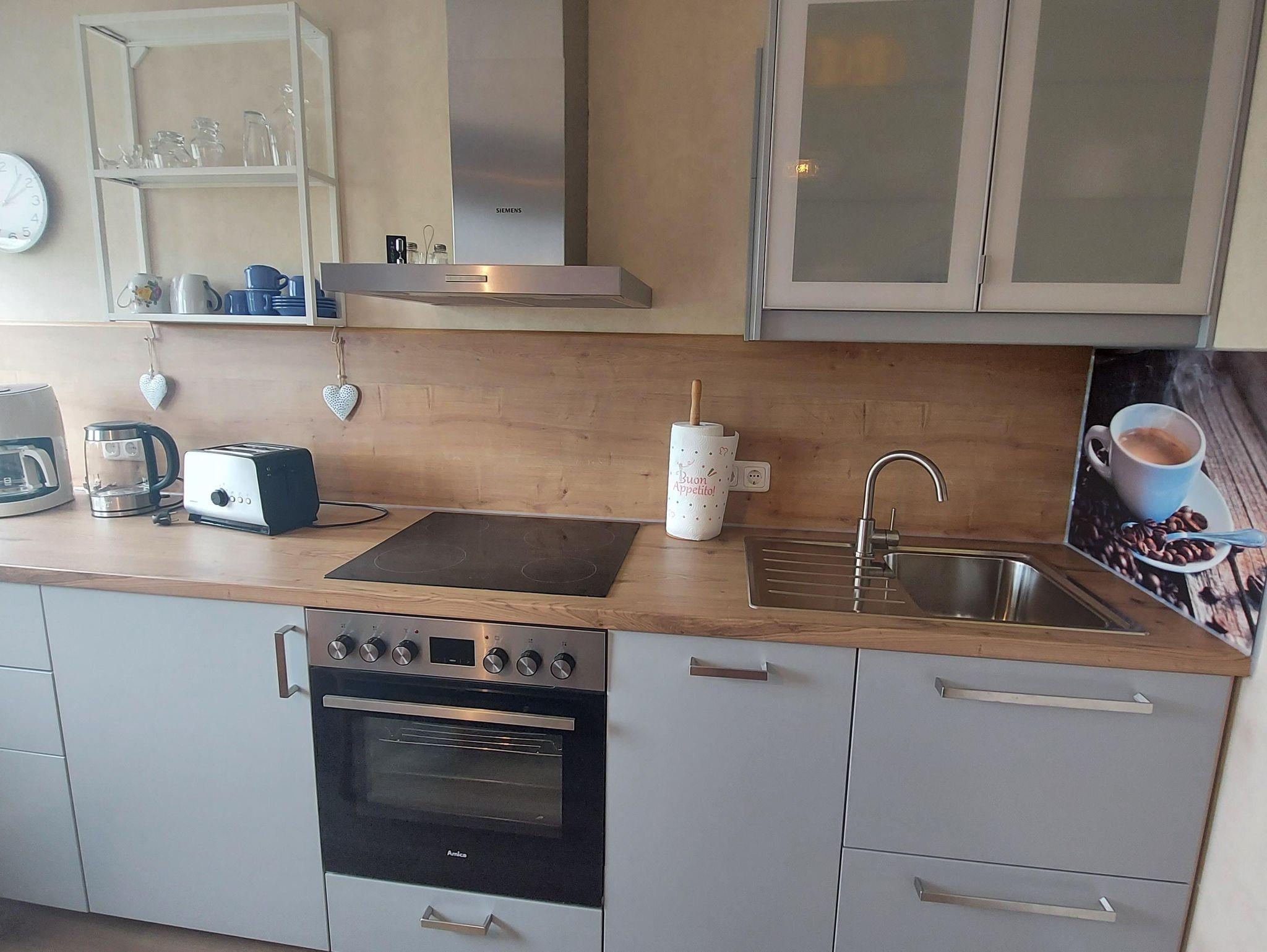 Die Ferienwohnung verfügt über eine zum Wohn-Schlafraum angrenzende Küche sowie ein Bad mit Dusche.