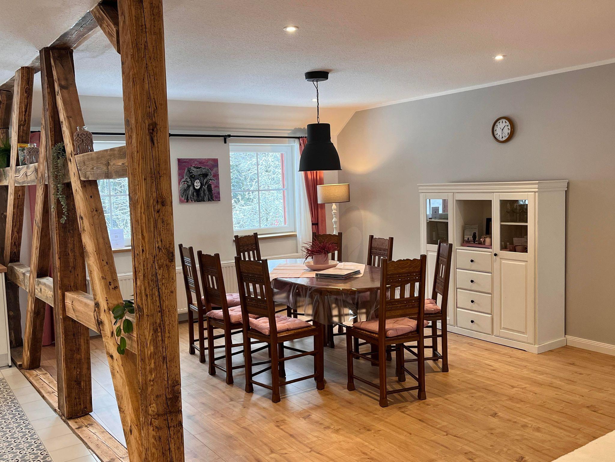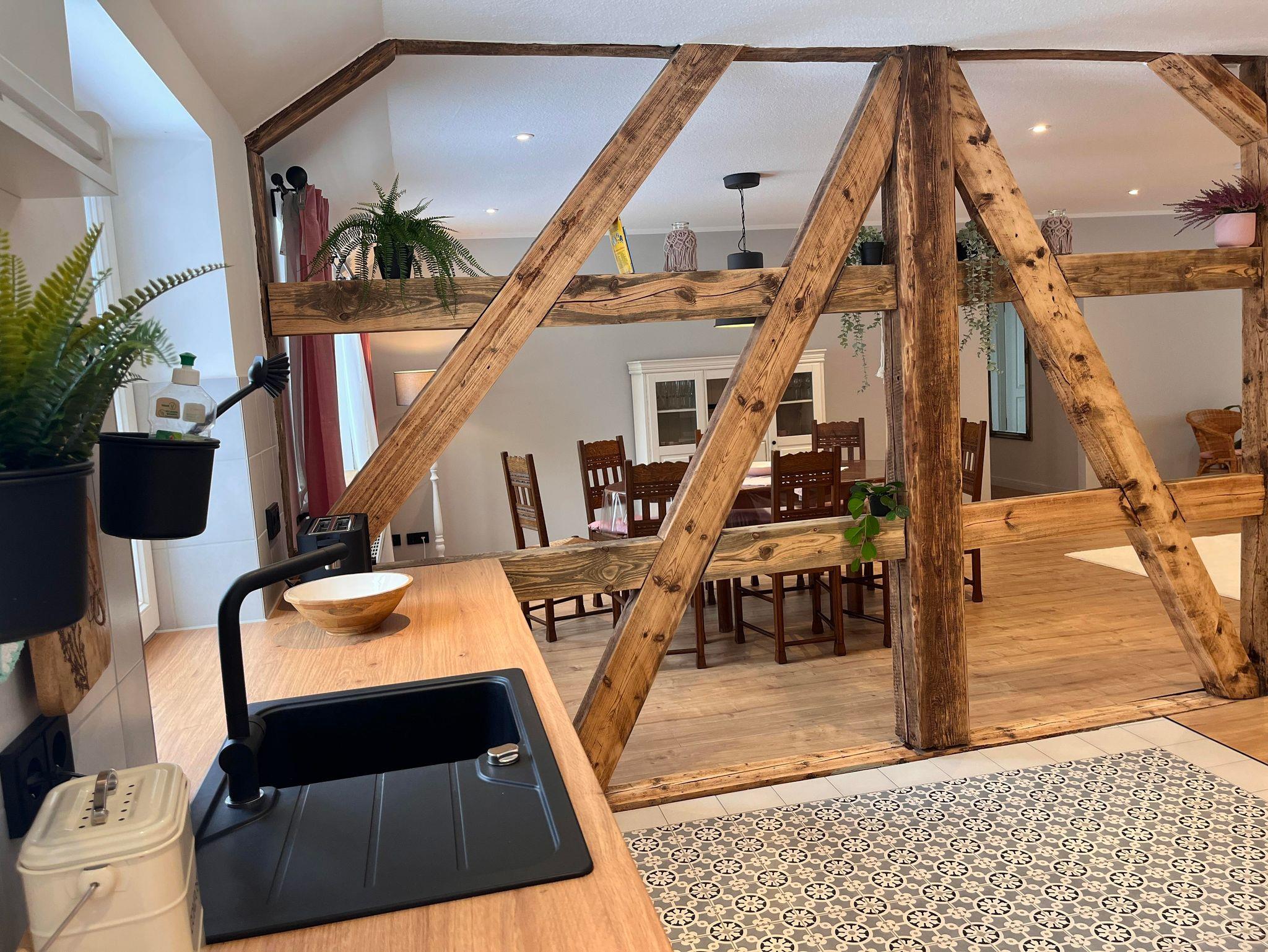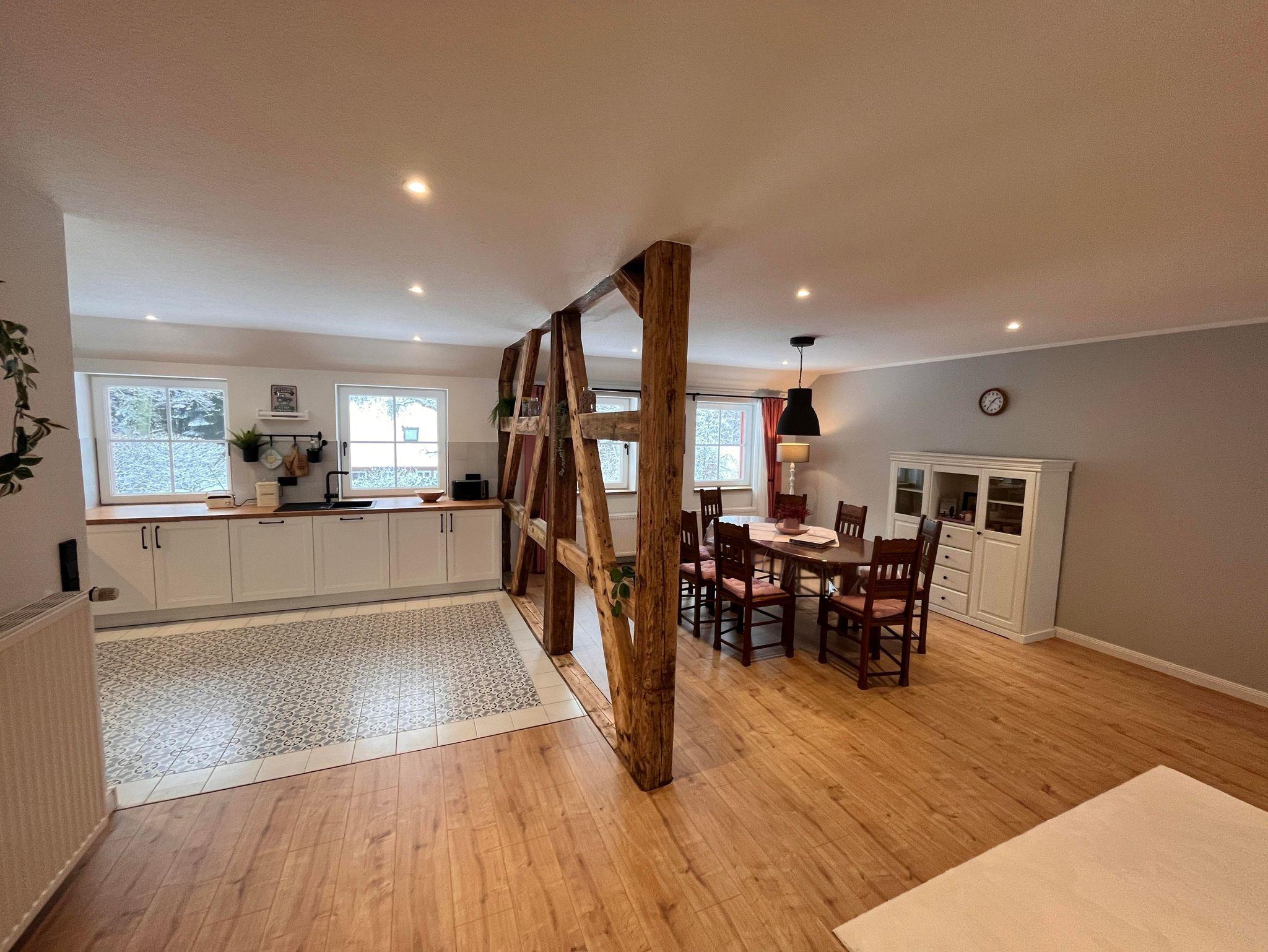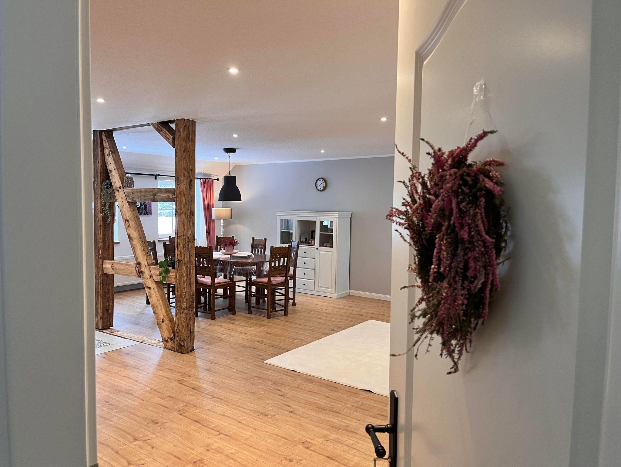 Die Wohnung ist im Obergeschoss des alten Fachwerkhauses über eine Treppe zu erreichen. Der große offene Wohn- und Essbereich in einem modernen Landhausstil, verleiht der Wohnung ein gemütliches Wohnambiente. Vier Schlafzimmer und zwei Bäder (eines davon mit Badewanne) runden die Wohnung ab.