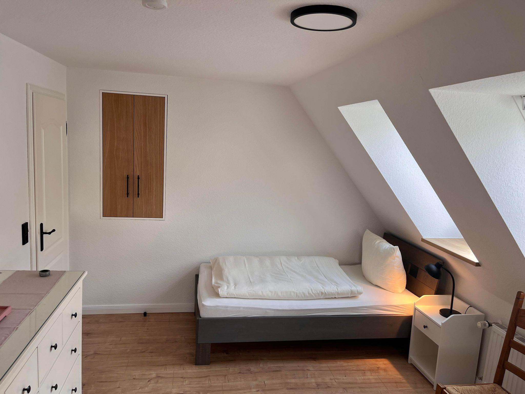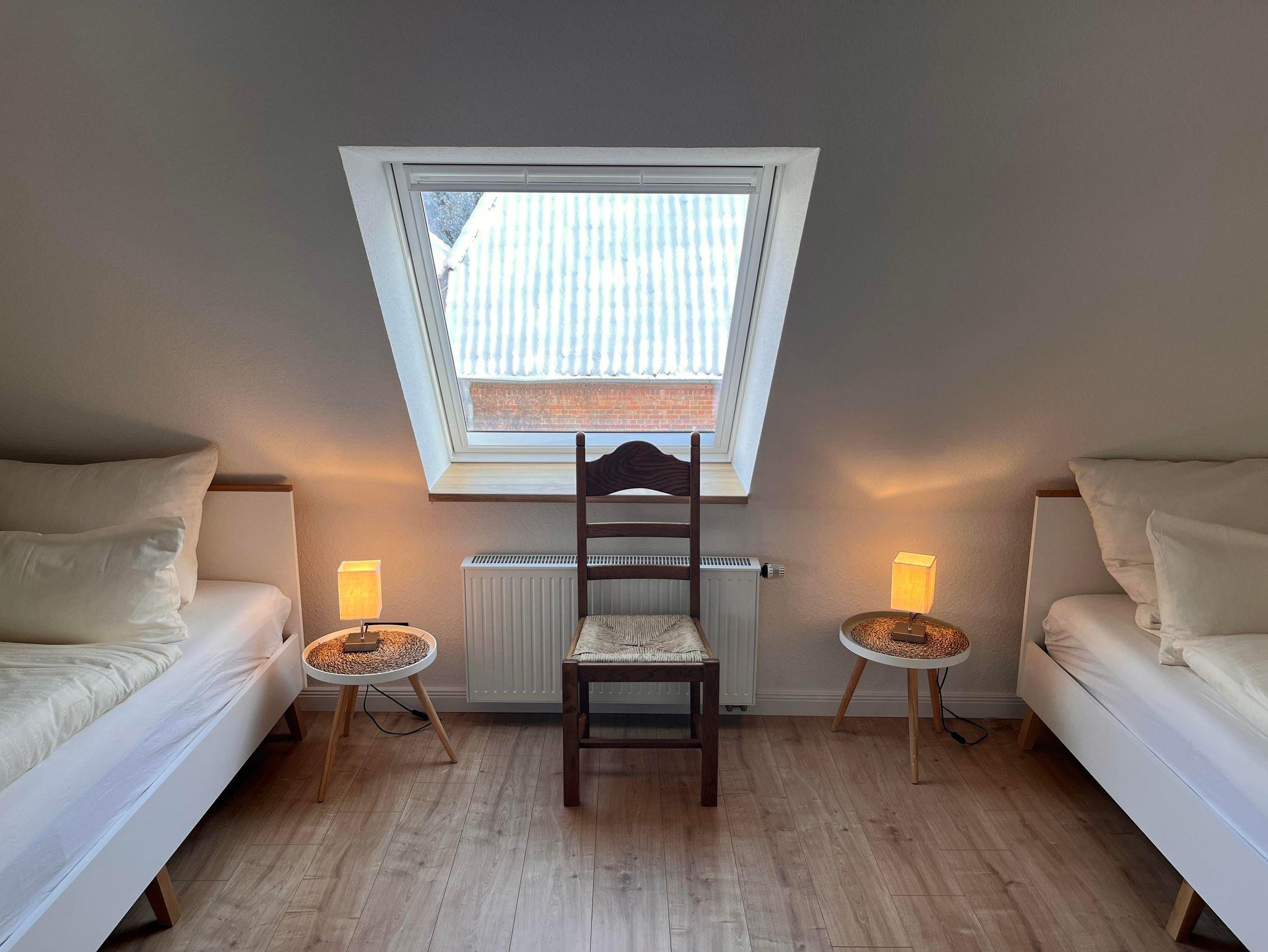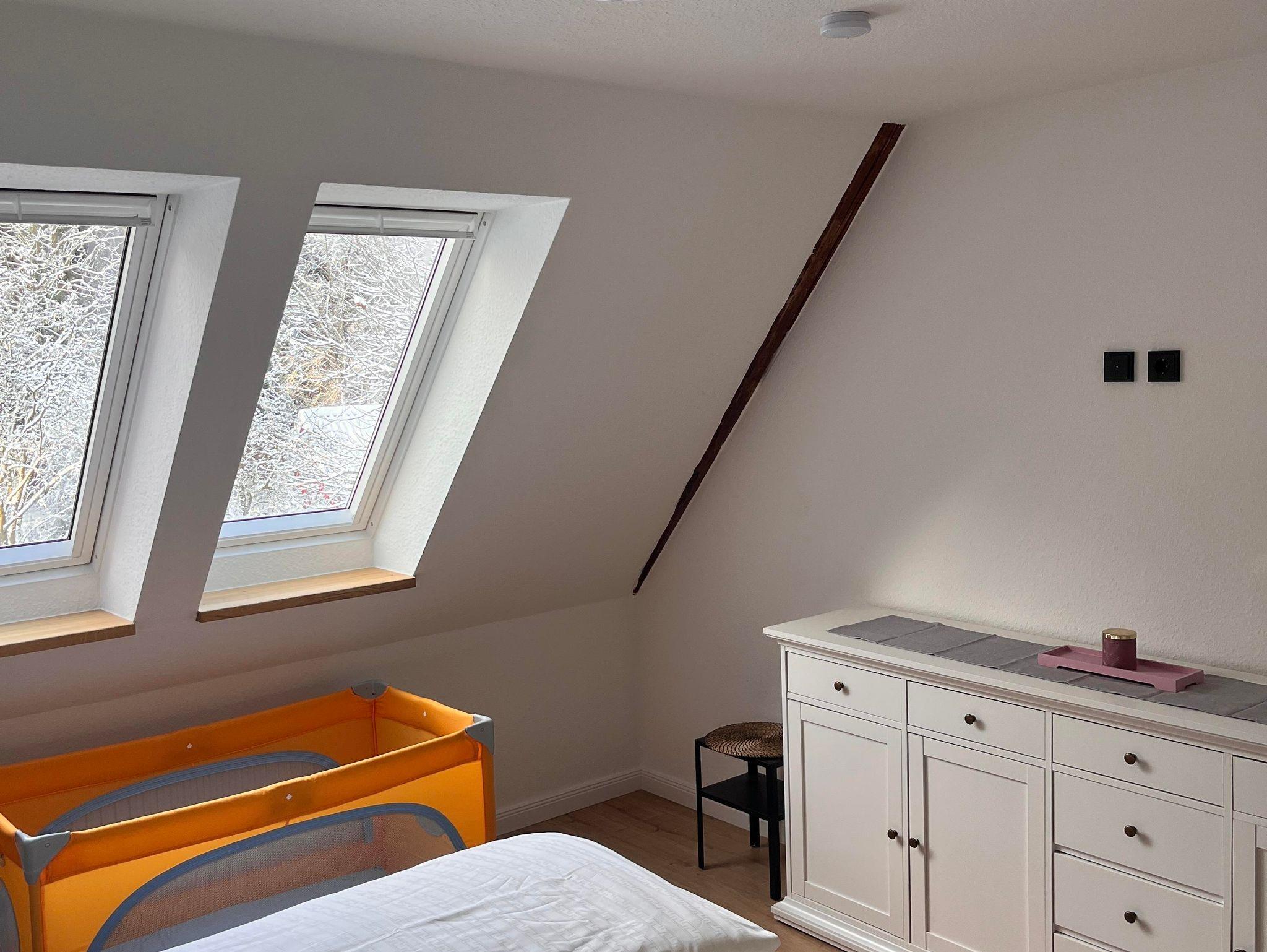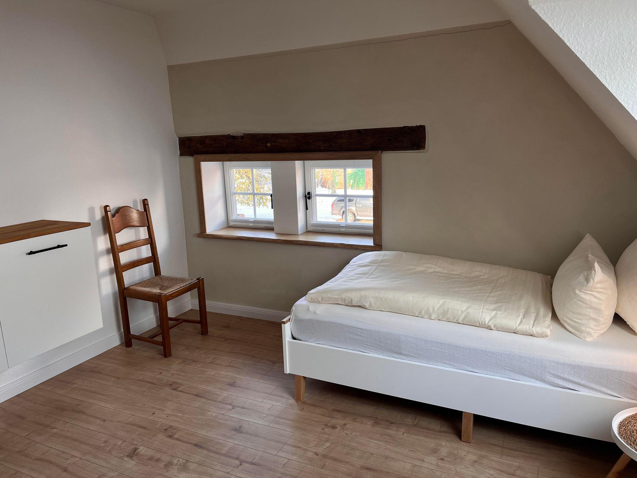 Die Wohnung ist im Obergeschoss des alten Fachwerkhauses über eine Treppe zu erreichen. Der große offene Wohn- und Essbereich in einem modernen Landhausstil, verleiht der Wohnung ein gemütliches Wohnambiente. Vier Schlafzimmer und zwei Bäder (eines davon mit Badewanne) runden die Wohnung ab.