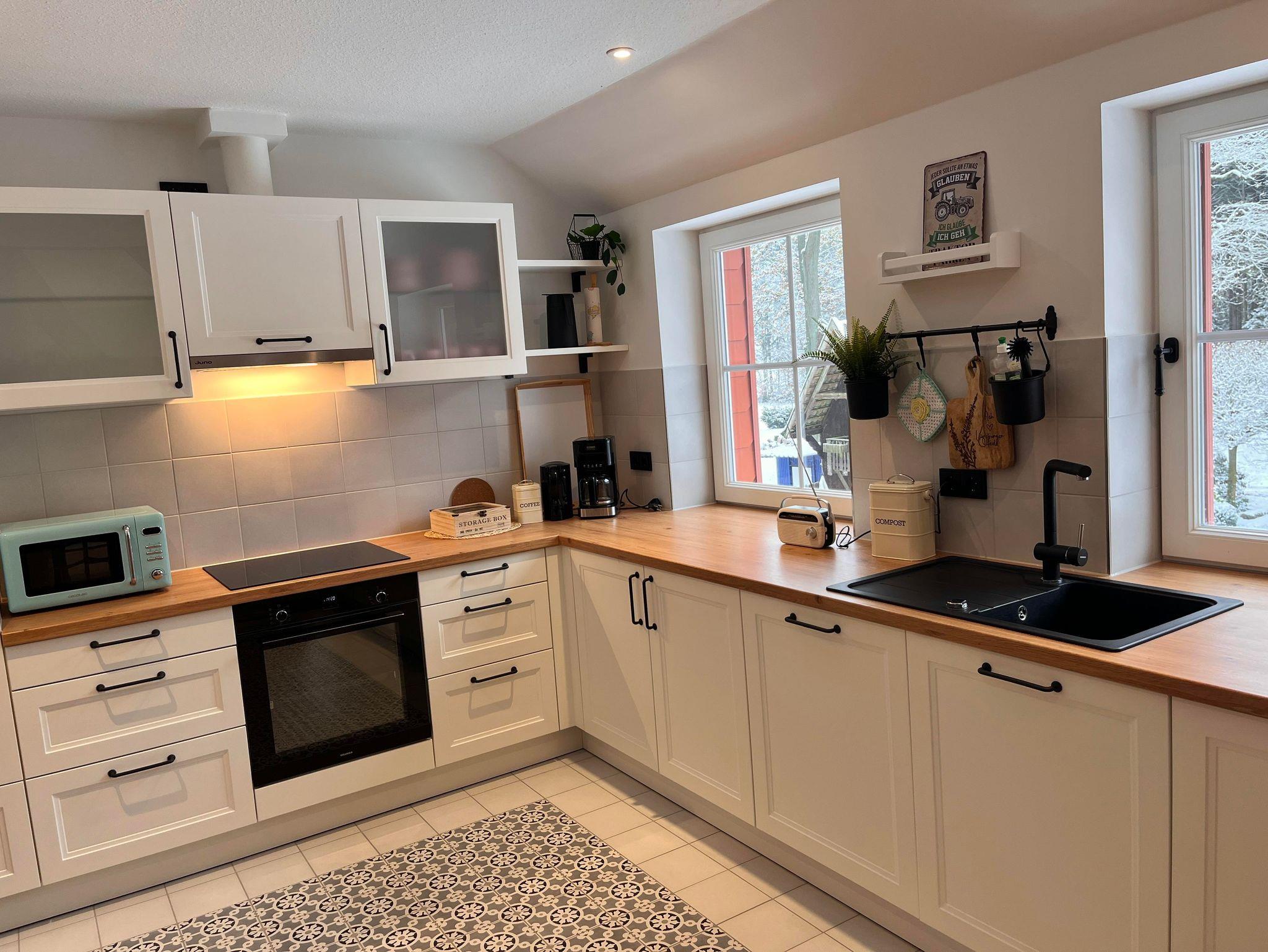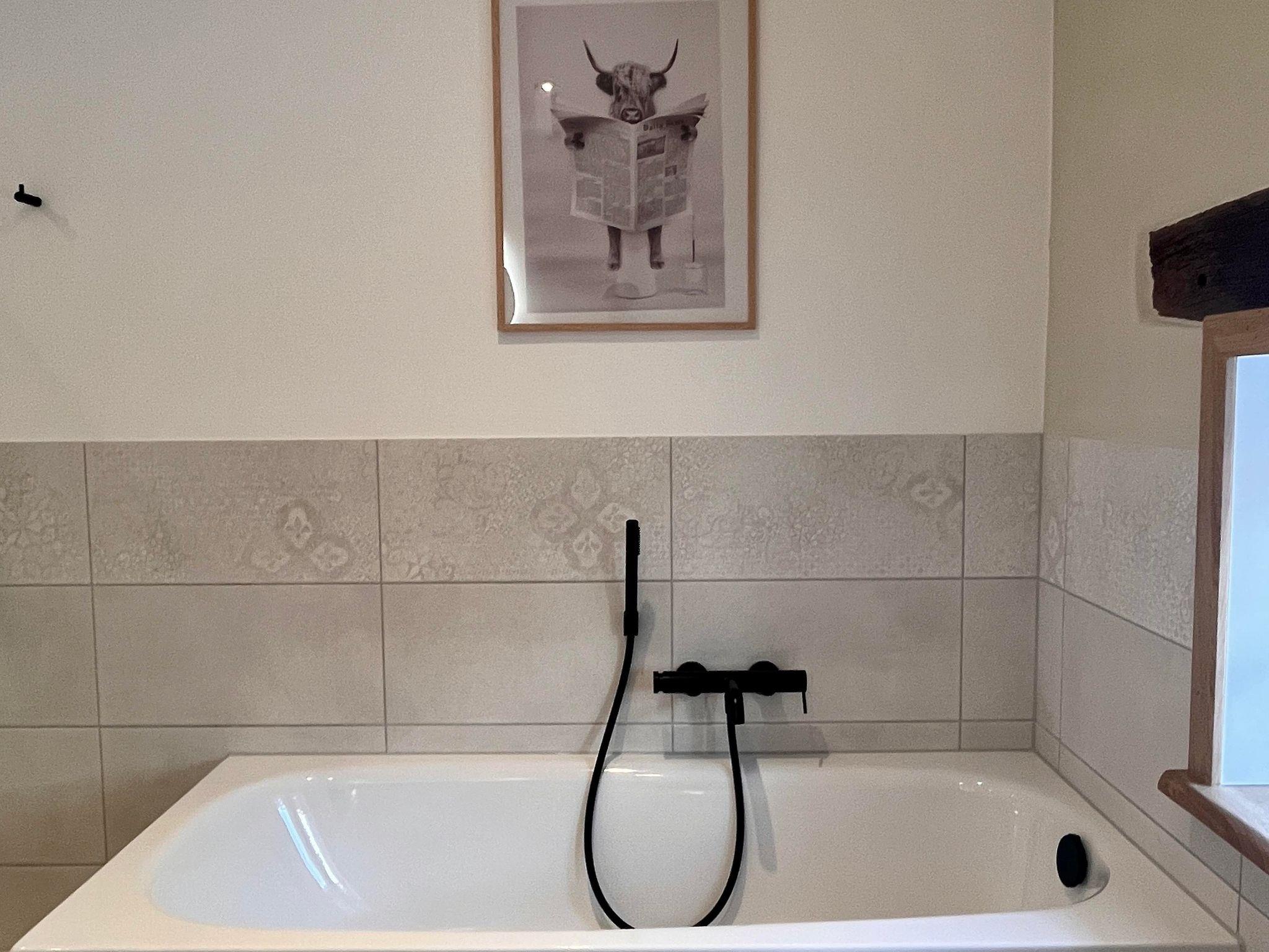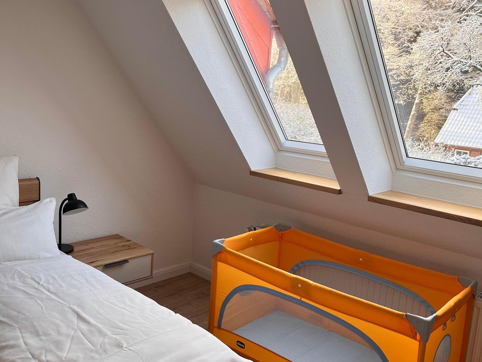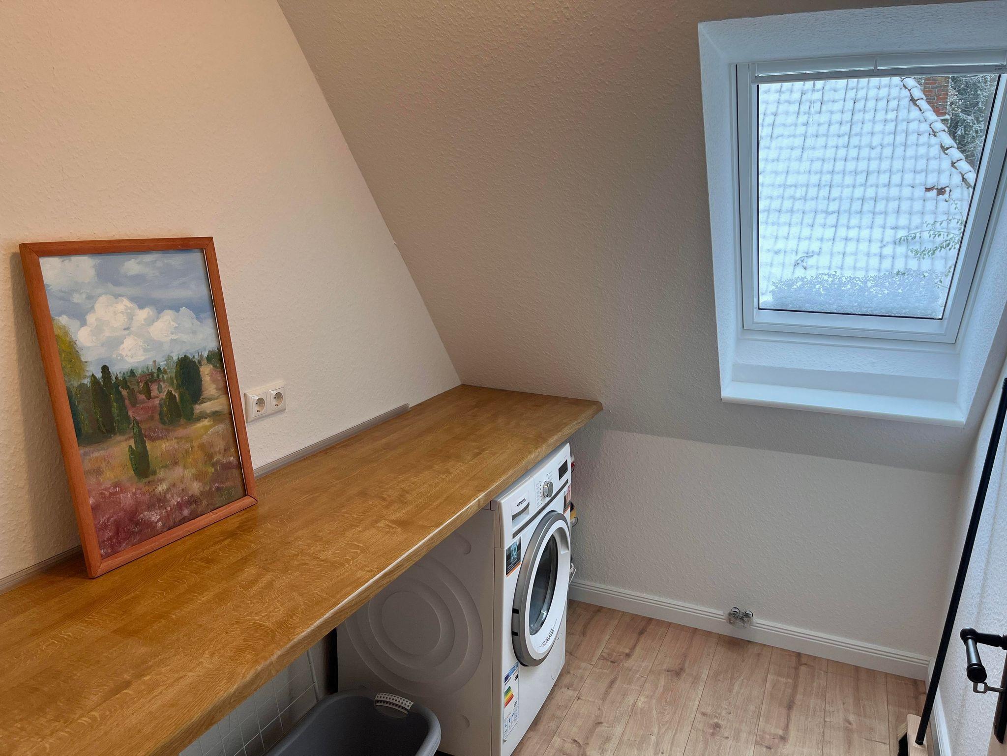 Die Wohnung ist im Obergeschoss des alten Fachwerkhauses über eine Treppe zu erreichen. Der große offene Wohn- und Essbereich in einem modernen Landhausstil, verleiht der Wohnung ein gemütliches Wohnambiente. Vier Schlafzimmer und zwei Bäder (eines davon mit Badewanne) runden die Wohnung ab.