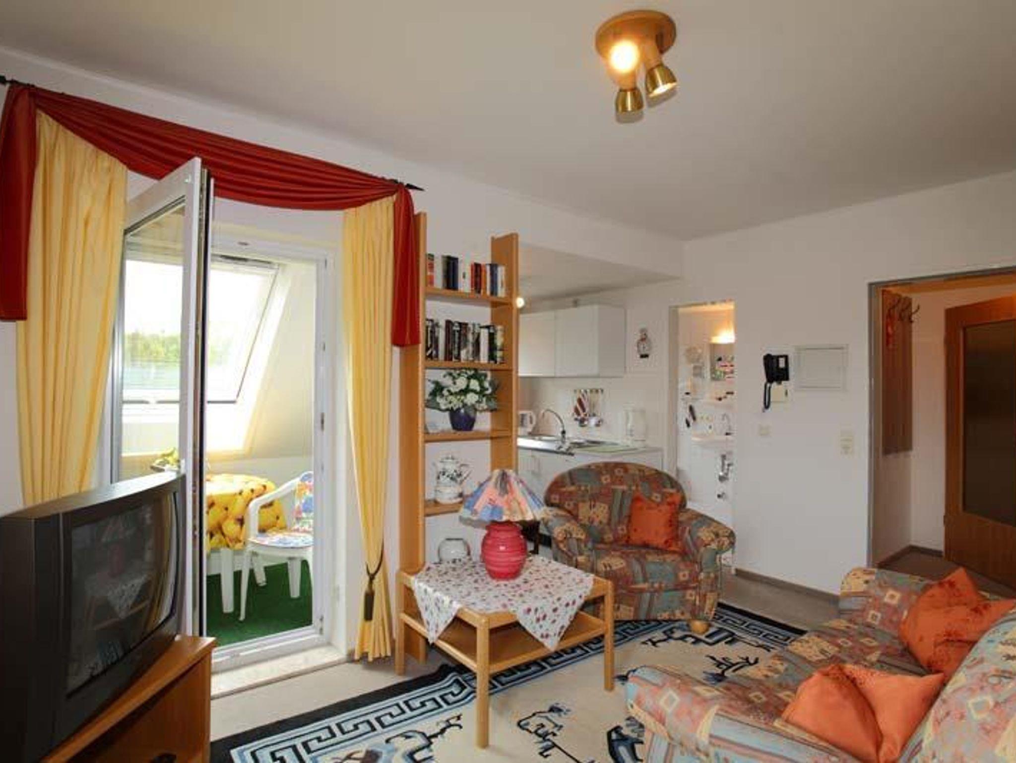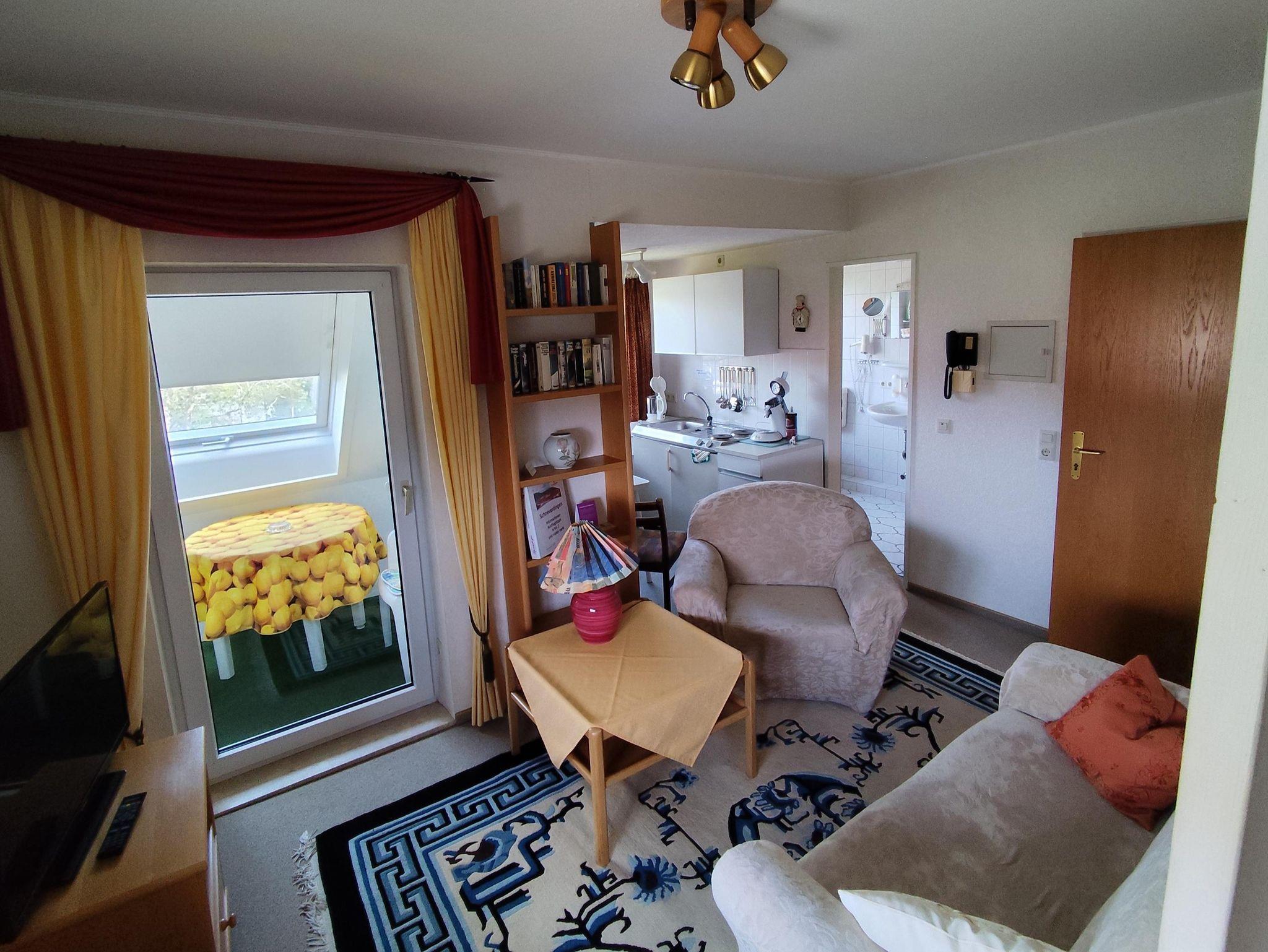 Ein Wohn-/Schlafraum mit 2 Betten, Wohn- und Schlafbereich getrennt durch Raumtrennwand, Sitzgruppe, Fernseher, Essplatz mit Balkon,Kochnische, Dusche, WC, Fön, Bademäntel, Safe.