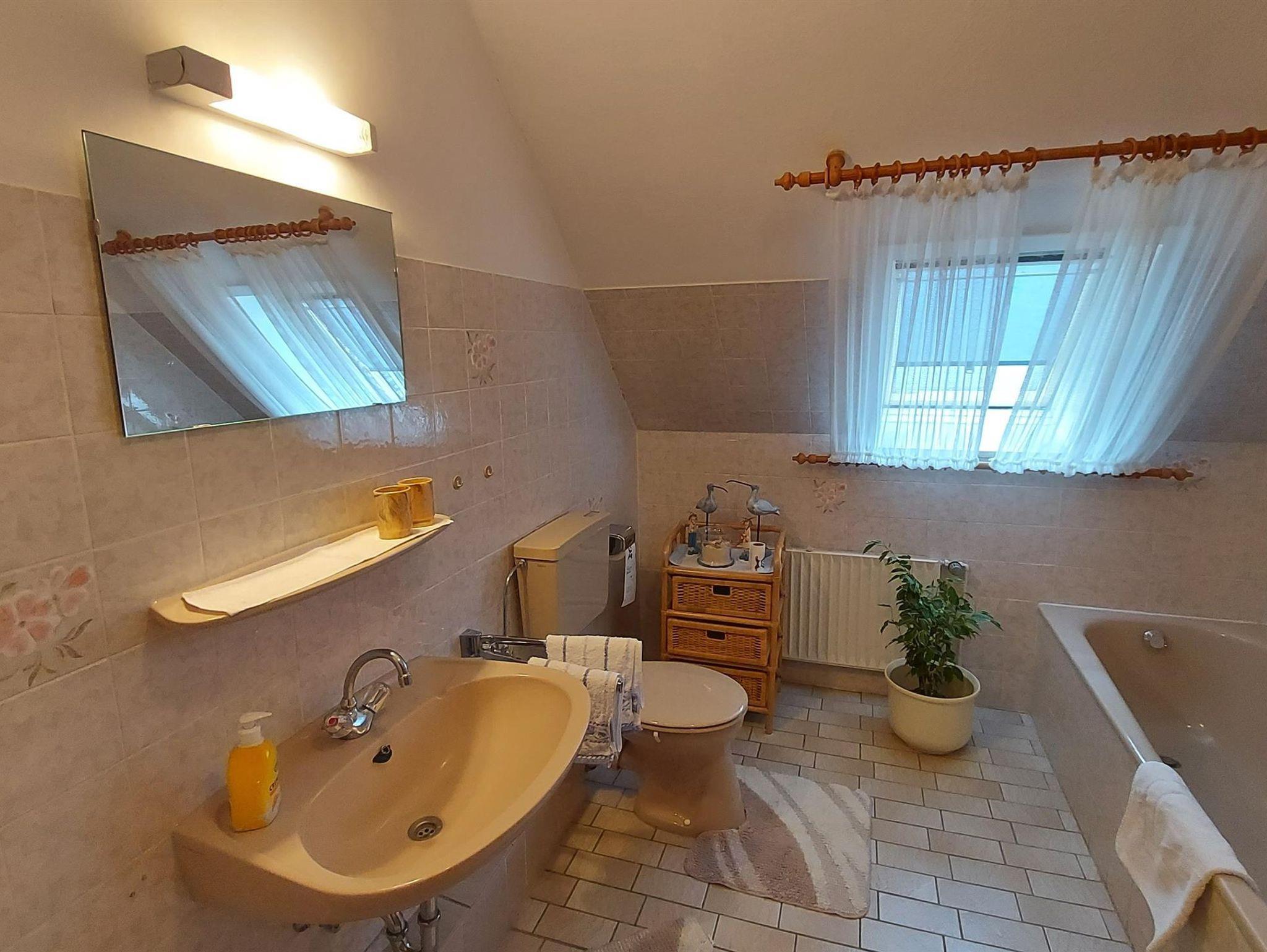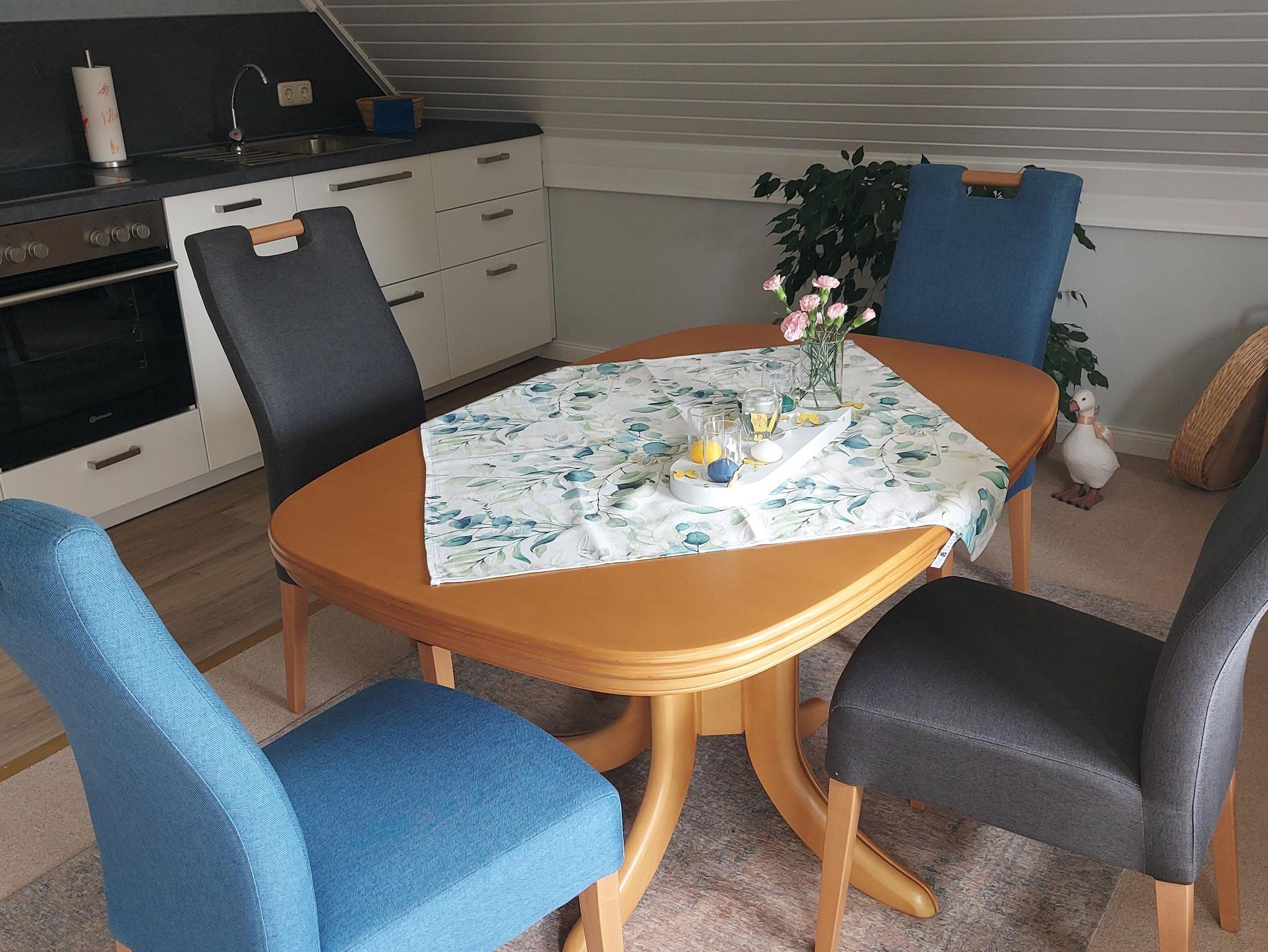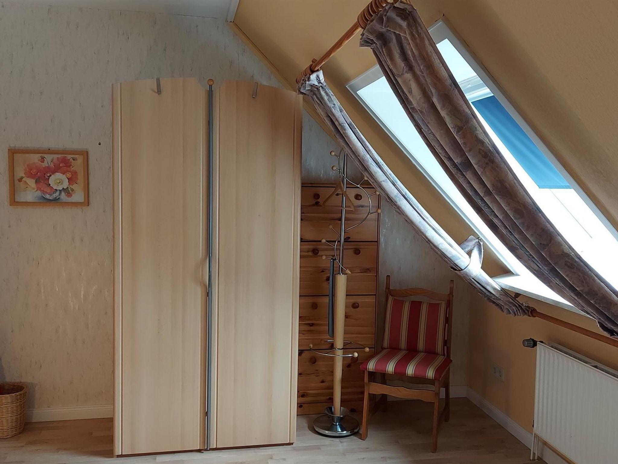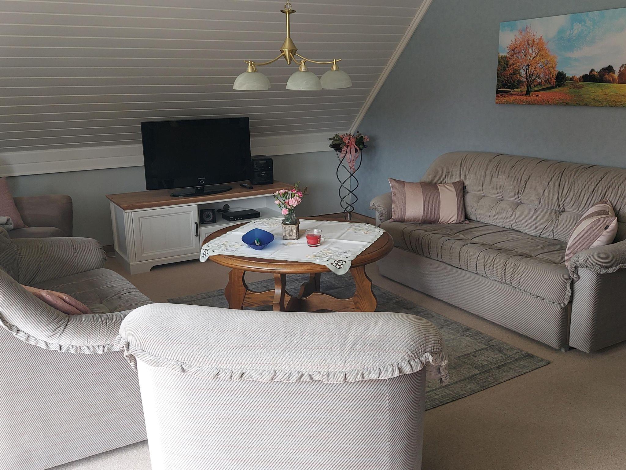 Die 60 qm große Wohnung befindet sich im Obergeschoss. Die Ferienwohnung verfügt über eine vollausgestattete Küche, ein gemütlich eingerichtetes Wohnzimmer mit zusätzlicher Schlafgelegenheit, ein Schlafzimmer mit Doppelbett sowie ein Bad mit Dusche, Badewanne und WC.