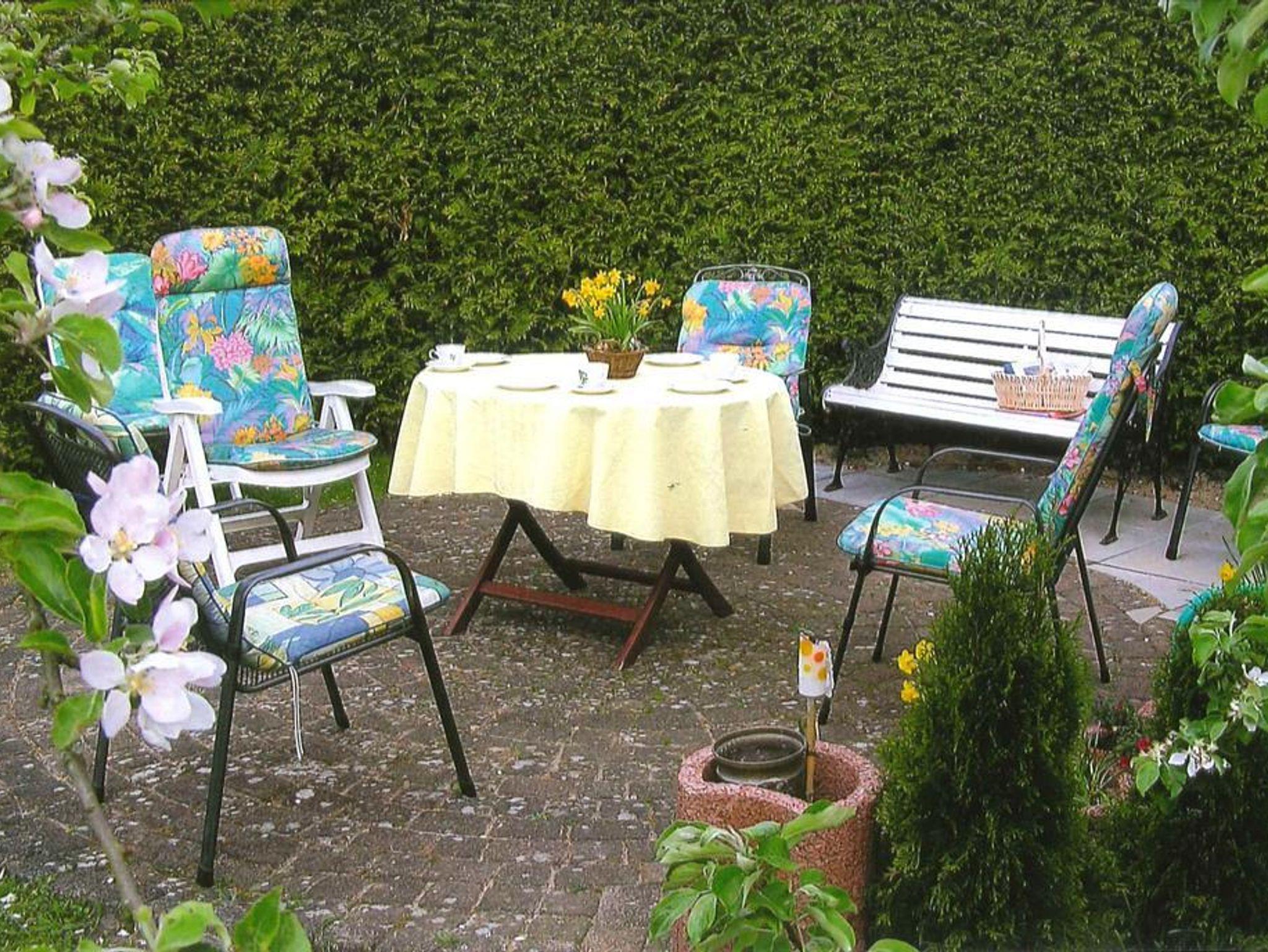 Eine Sitzecke mit Grillmöglichkeit im Garten steht den Gästen zur Verfügung.