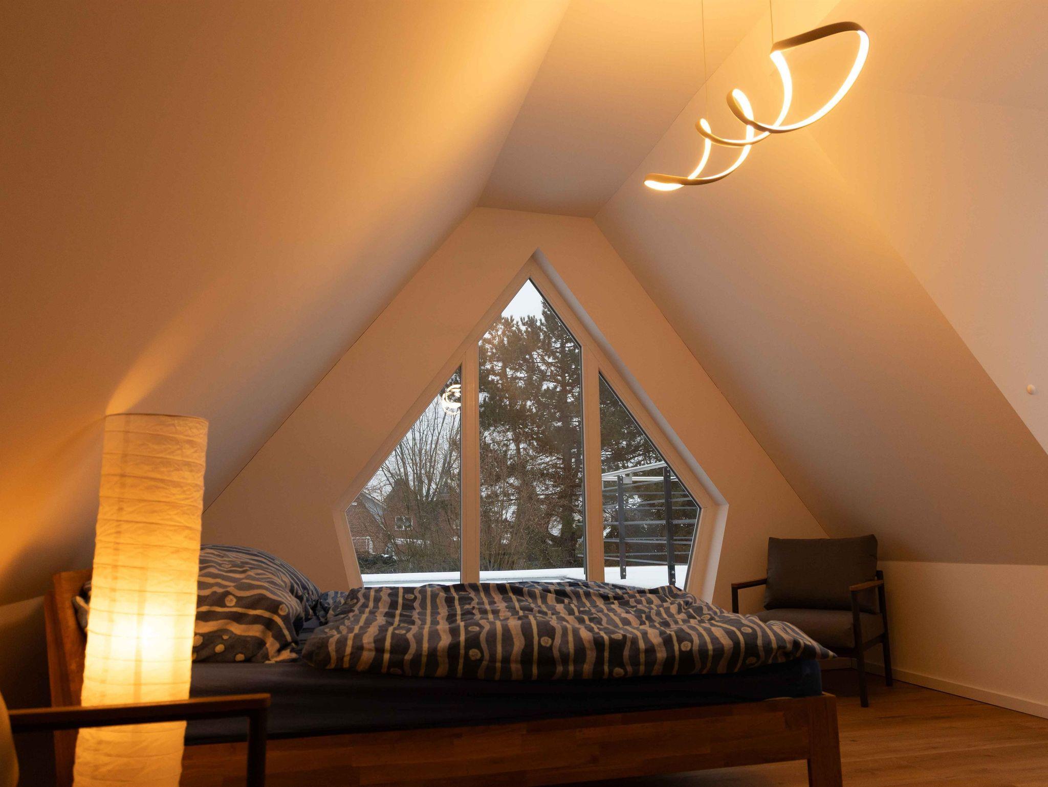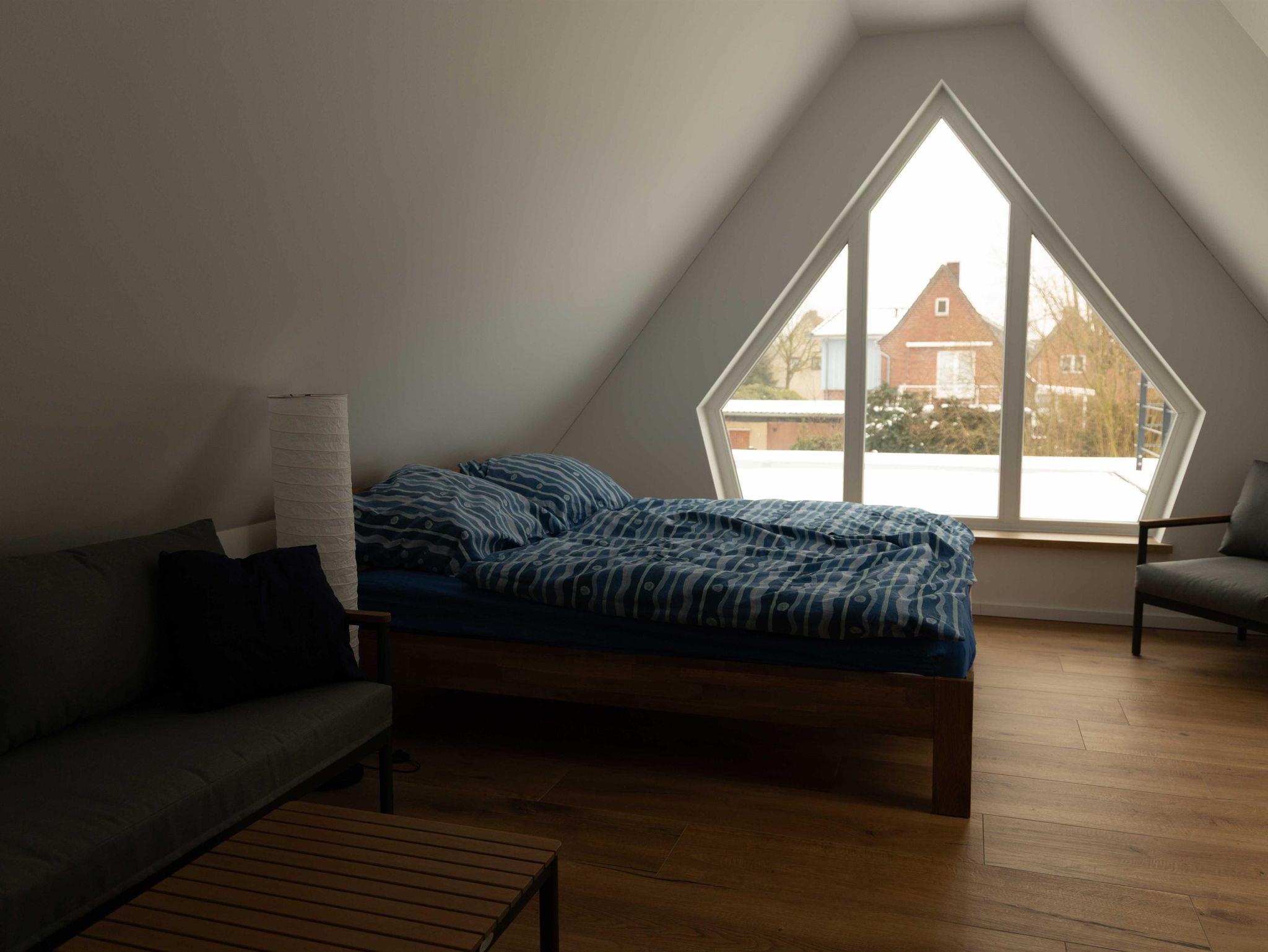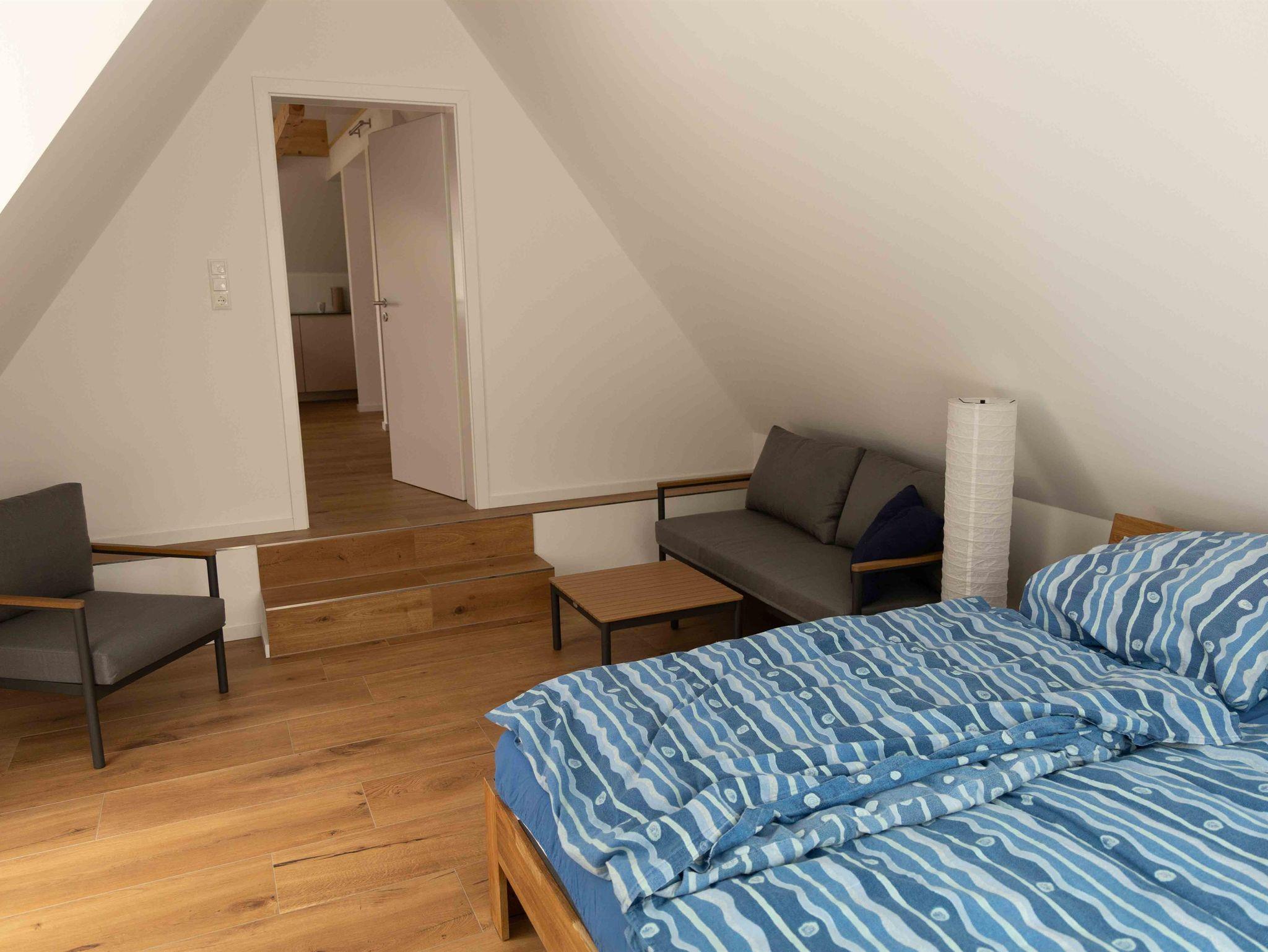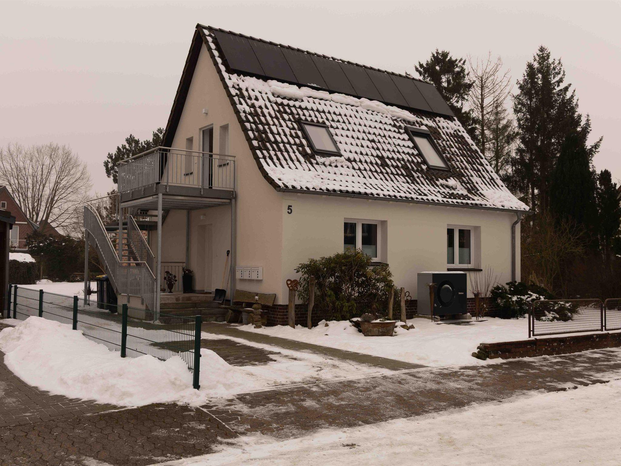 Die hell und modern eingerichtete Ferienwohnung im Obergeschoss ist über eine Außentreppe erreichbar. Die Dachterrasse lädt zum gemütlichen Verweilen und Entspannen ein. Die Ferienwohnung eignet sich hervorragend für Naturliebhaber und Fahrradfahrer. Eigene Fahrräder können sicher untergestellt werden.