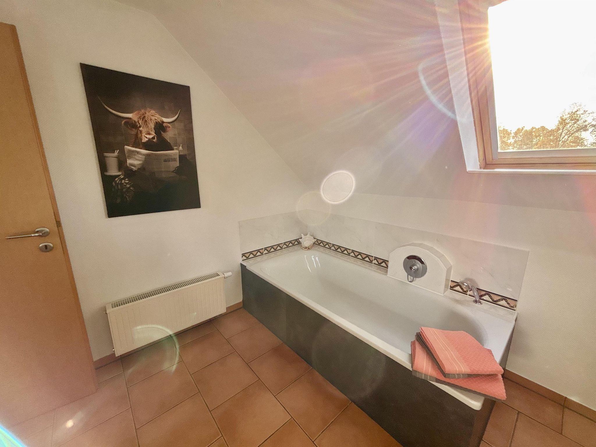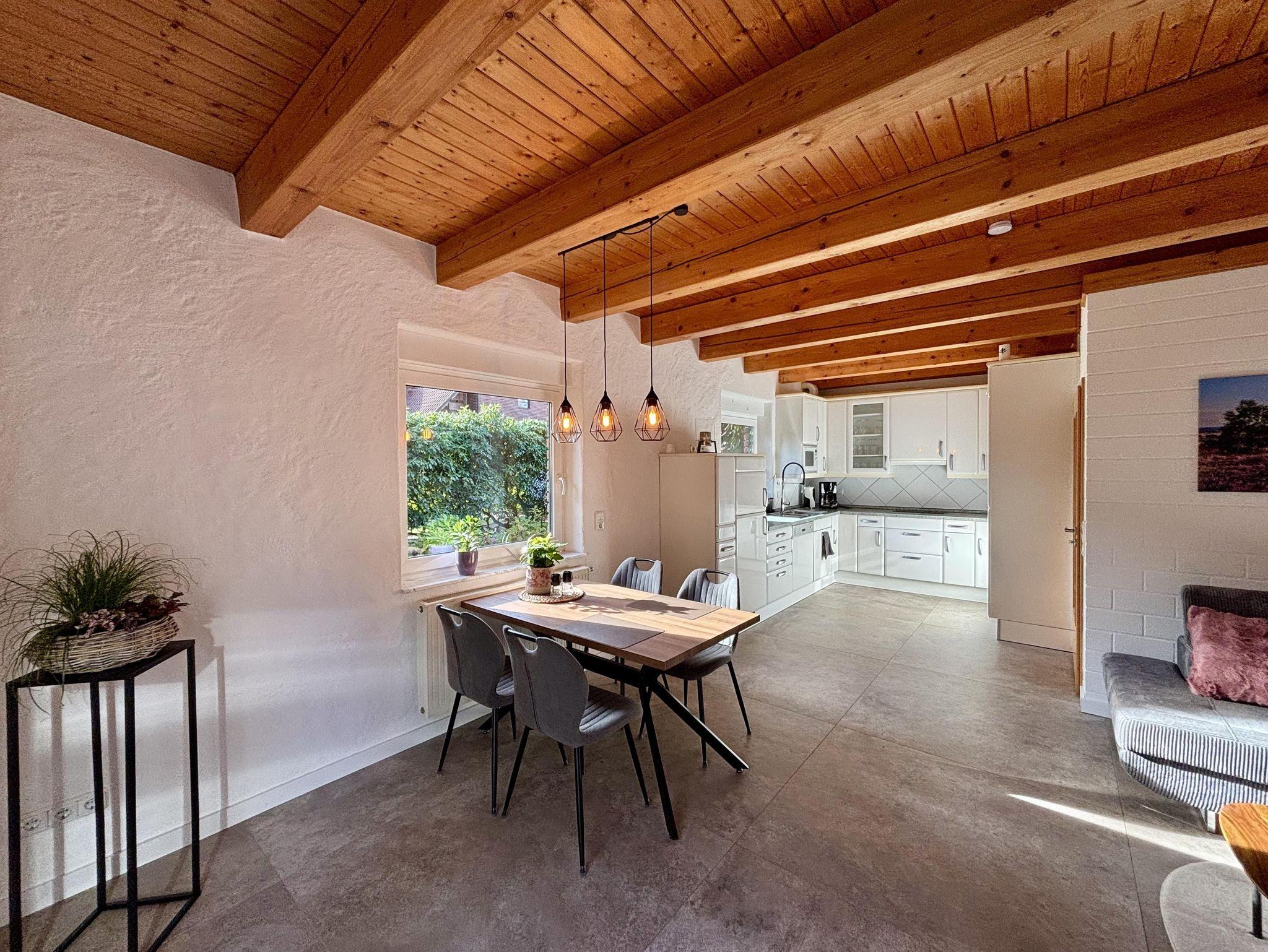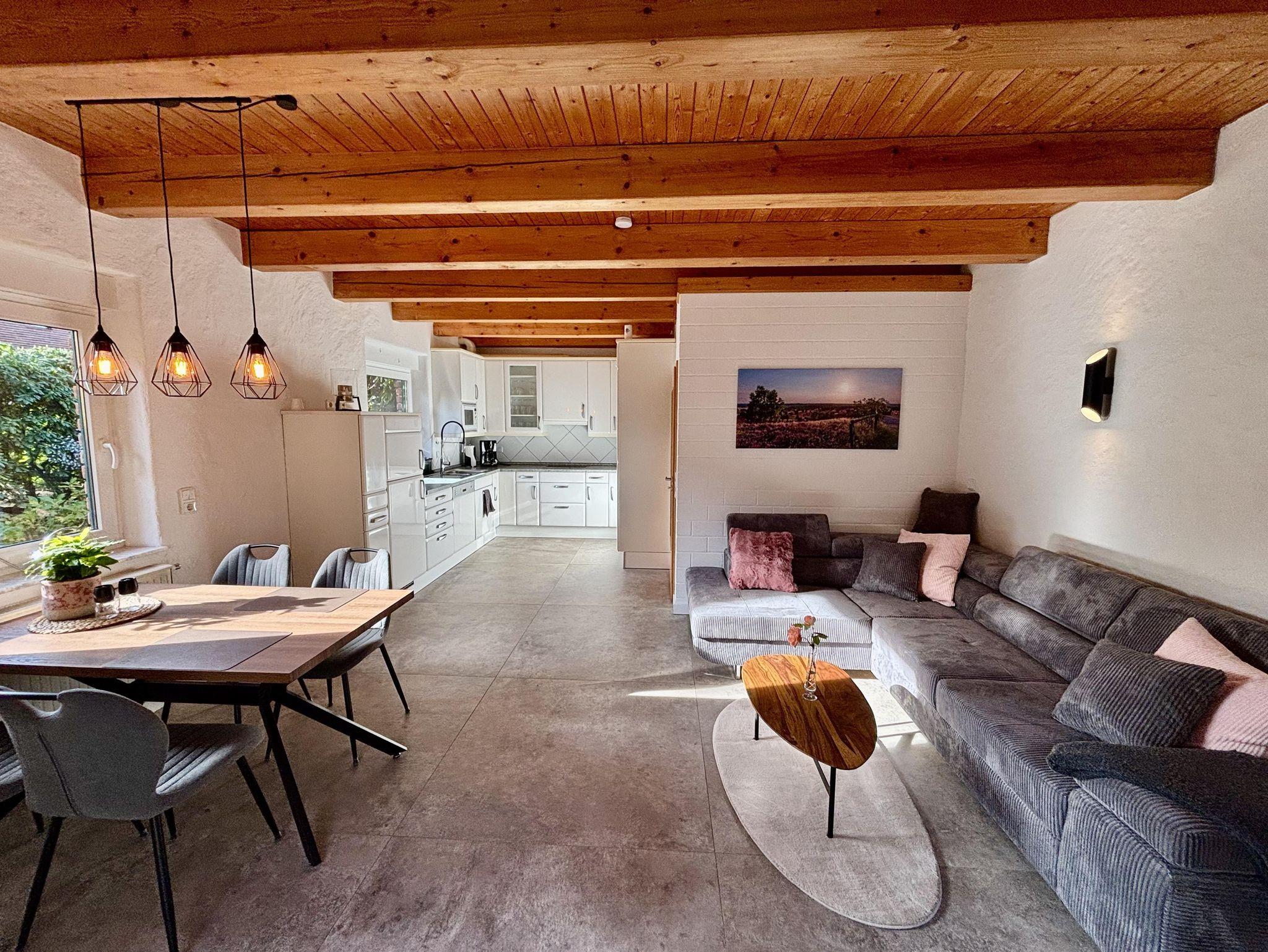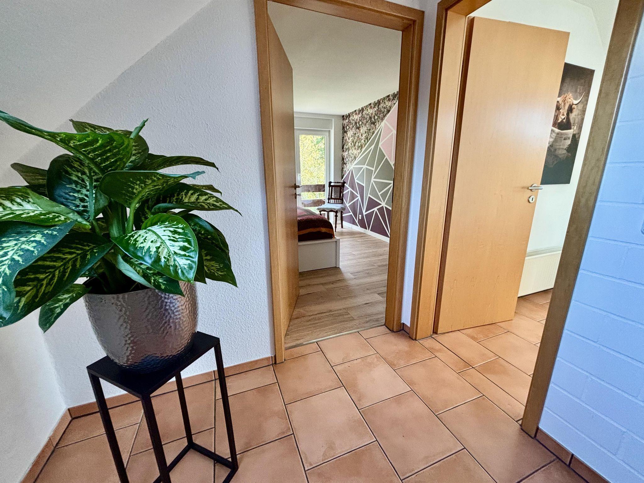 Die hell und modern eingerichtete Ferienwohnung verfügt im Erdgeschoss über eine komplett eingerichtete Wohnküche mit Essgelegenheit und ein Schlafsofa sowie ein Gäste WC und einen Flur, im Obergeschoss befindet sich das Schlafzimmer mit einem Doppelbett und das Vollbad mit Dusche, Badewanne und WC sowie ein Ankleidezimmer.