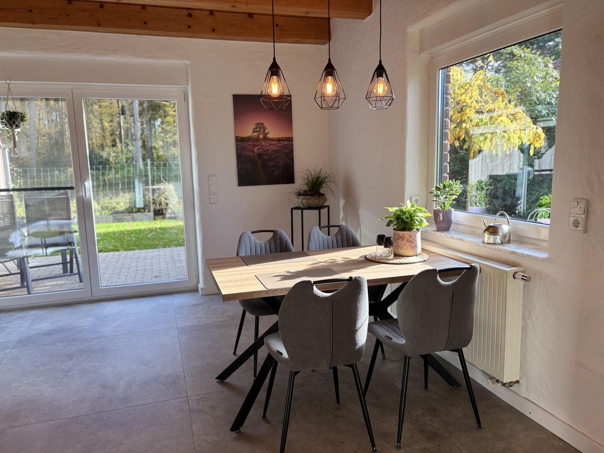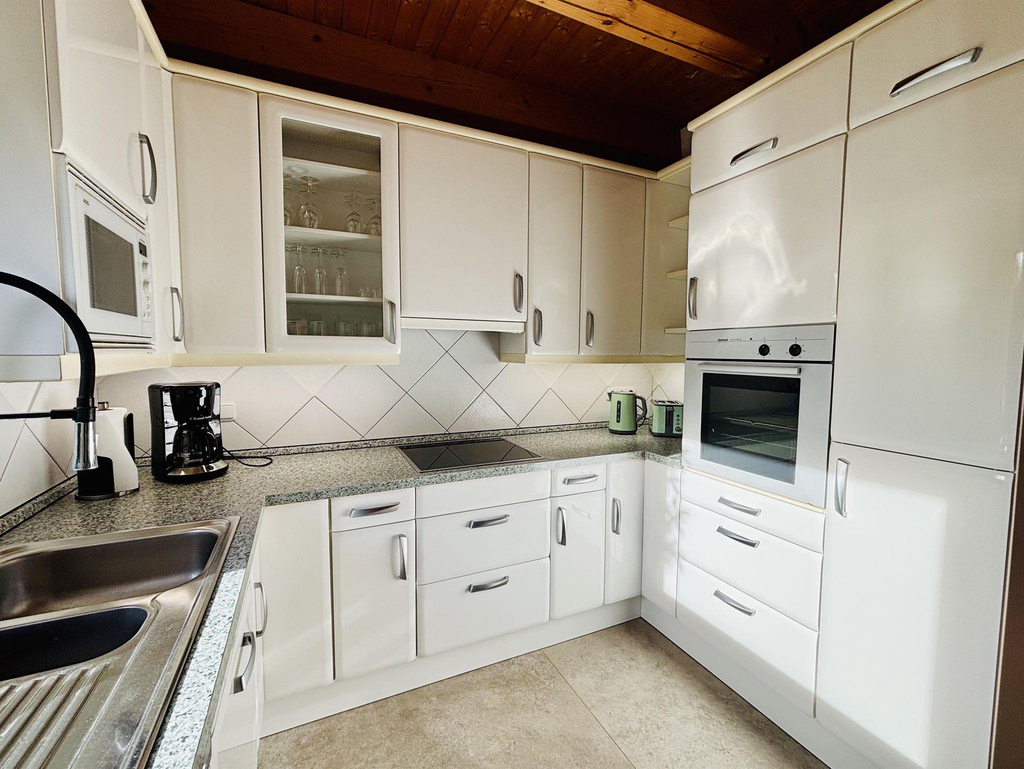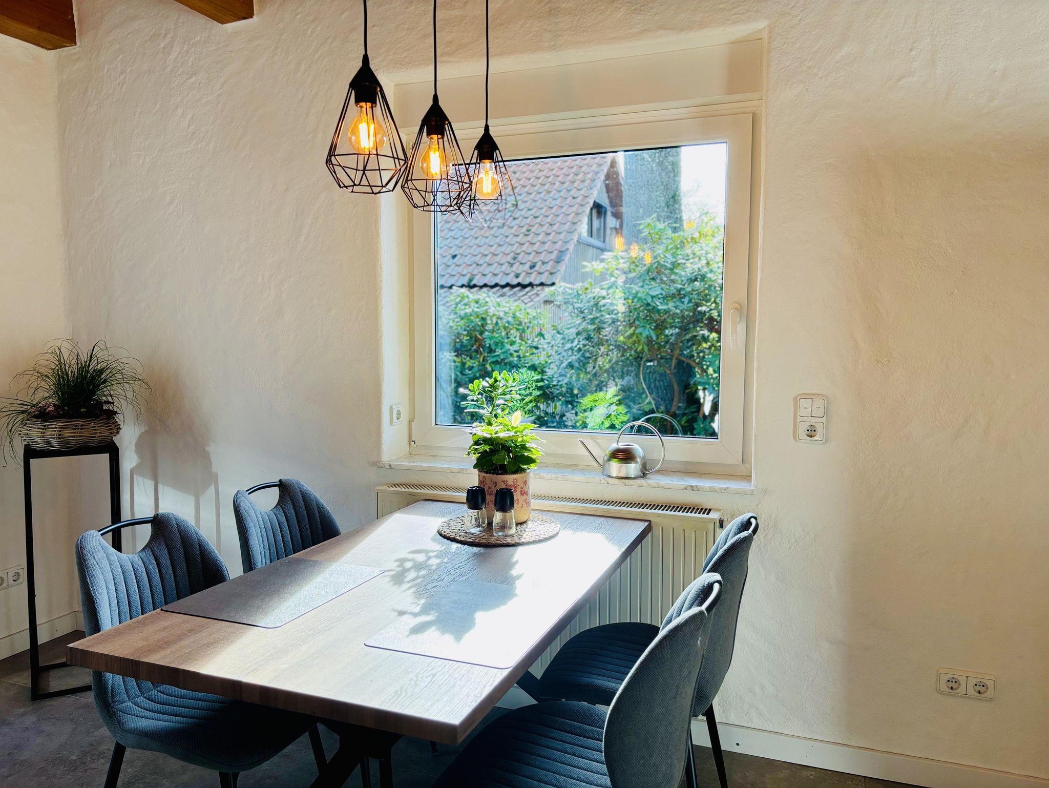 Die hell und modern eingerichtete Ferienwohnung verfügt im Erdgeschoss über eine komplett eingerichtete Wohnküche mit Essgelegenheit und ein Schlafsofa sowie ein Gäste WC und einen Flur, im Obergeschoss befindet sich das Schlafzimmer mit einem Doppelbett und das Vollbad mit Dusche, Badewanne und WC sowie ein Ankleidezimmer.