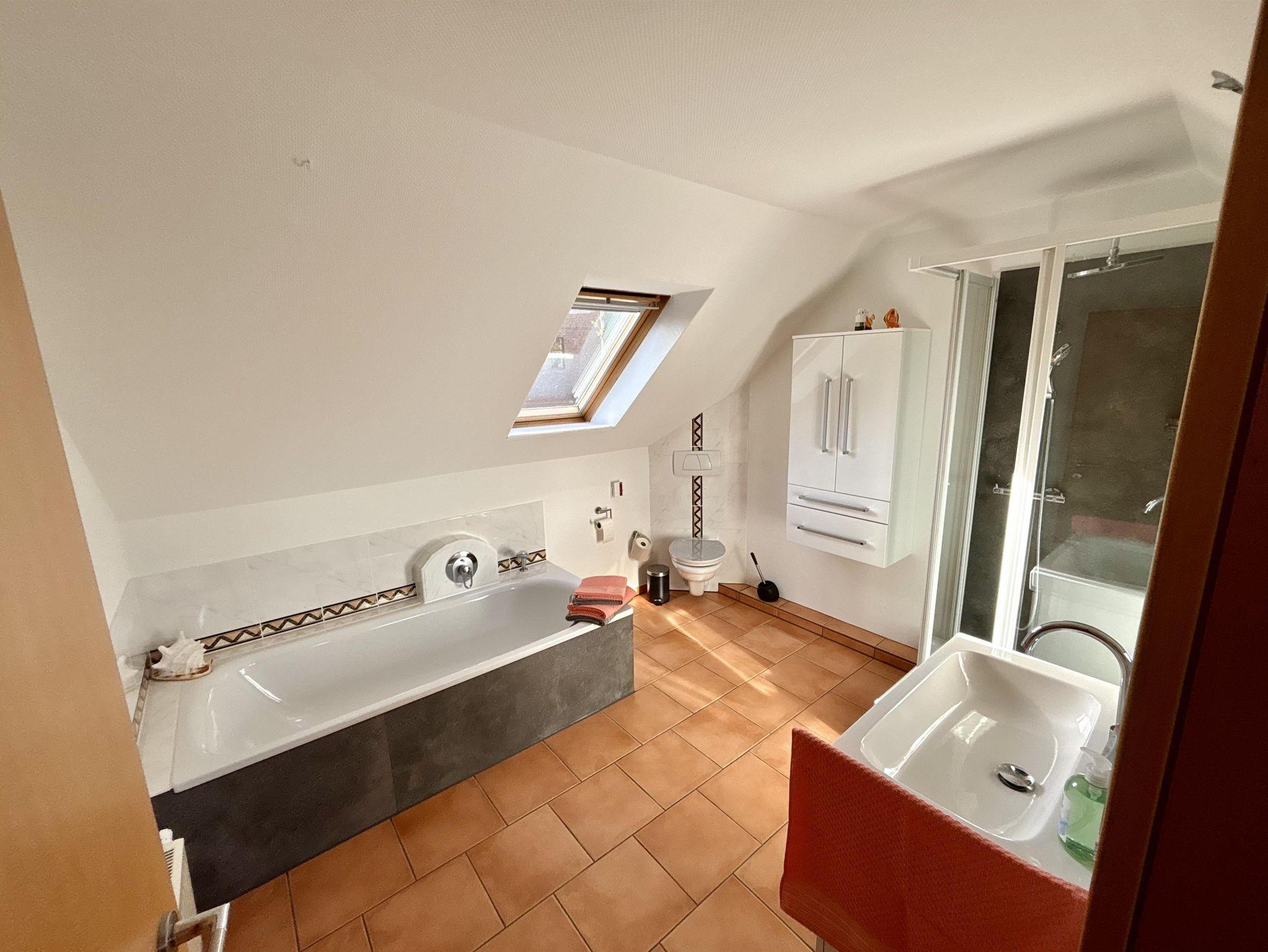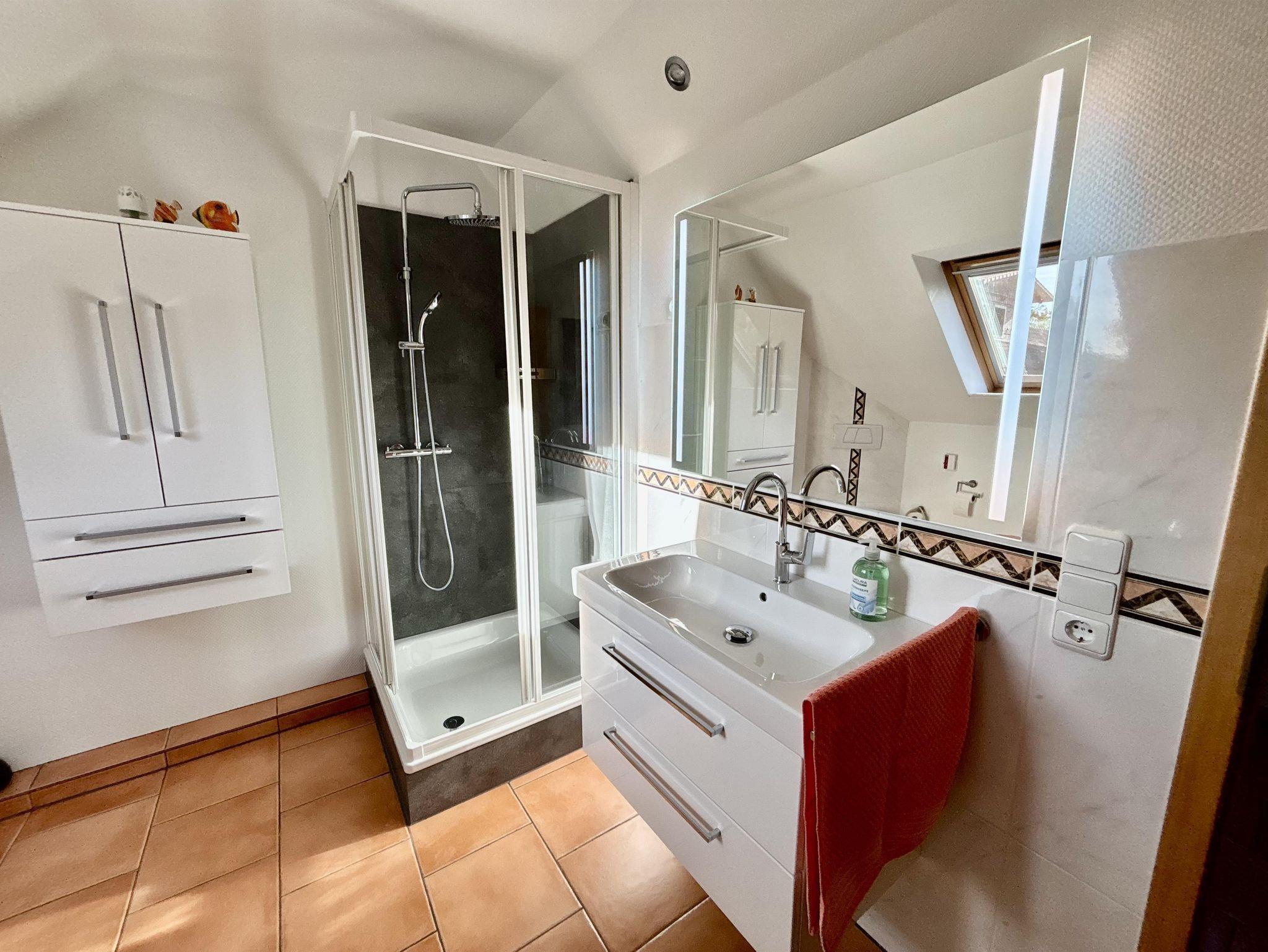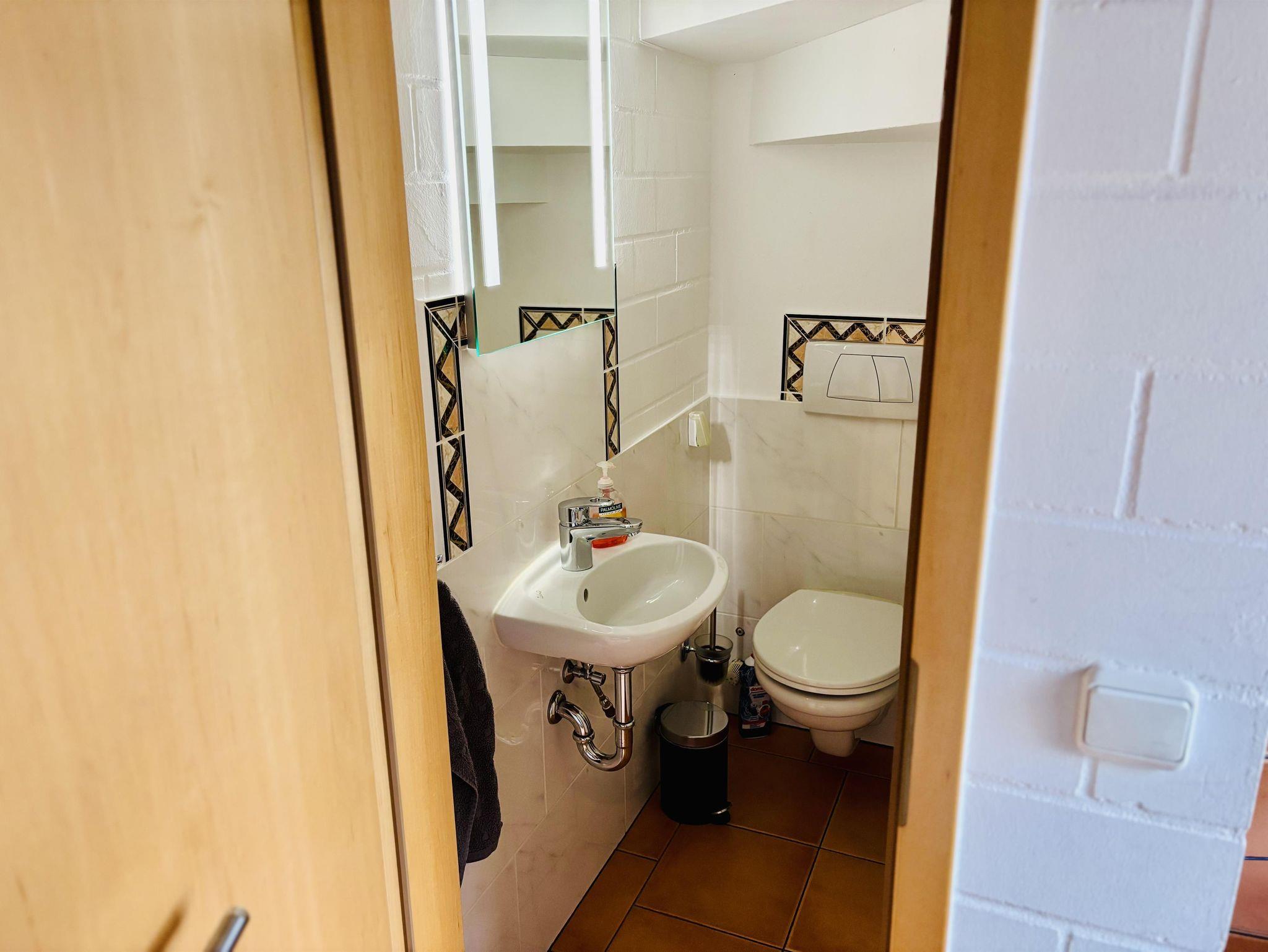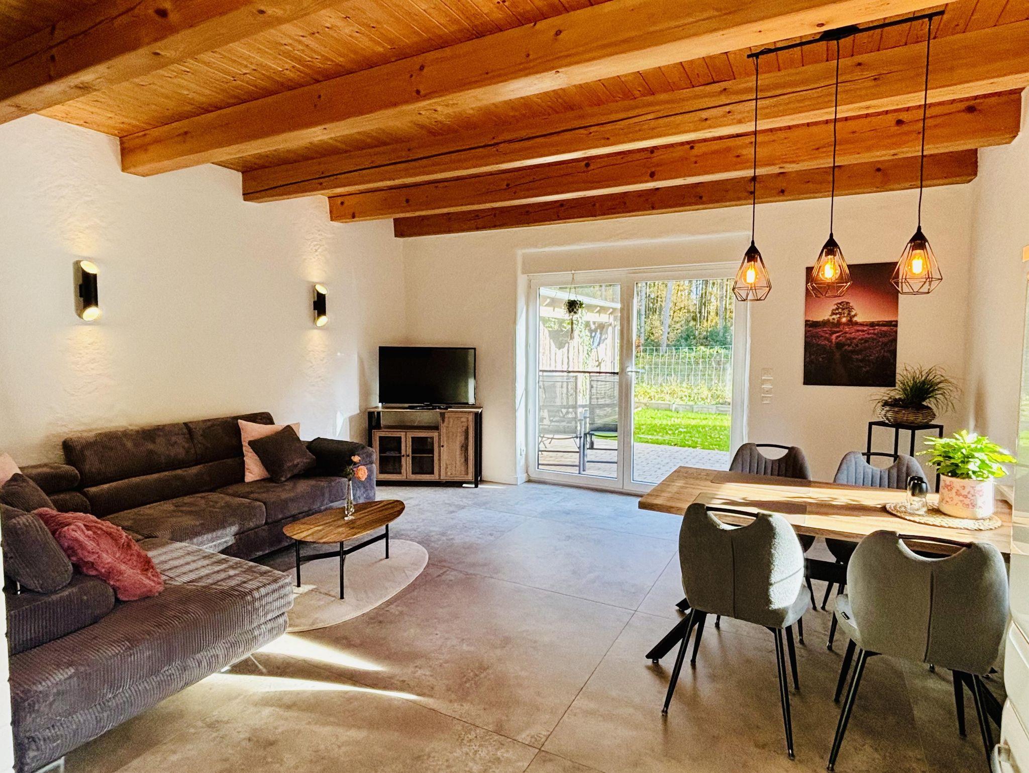 Die hell und modern eingerichtete Ferienwohnung verfügt im Erdgeschoss über eine komplett eingerichtete Wohnküche mit Essgelegenheit und ein Schlafsofa sowie ein Gäste WC und einen Flur, im Obergeschoss befindet sich das Schlafzimmer mit einem Doppelbett und das Vollbad mit Dusche, Badewanne und WC sowie ein Ankleidezimmer.