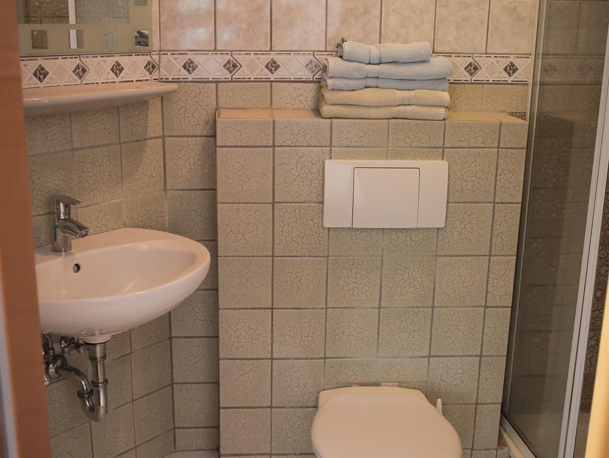 Doppelzimmer im Obergeschoss, Bad mit Dusche und WC, inklusive Frühstück.