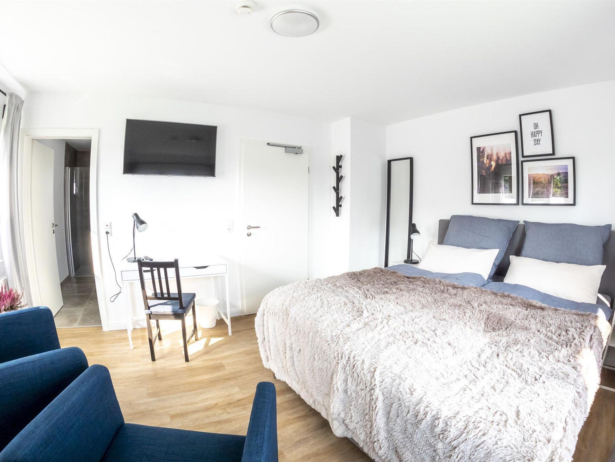 Dieses modern und liebevoll eingerichtete Zimmer befindet sich im Erdgeschoss der kleinen, charmanten Pension. Es verfügt über ein Boxspringbett, einen Schreibtisch, einen Flachbildschirm und ein separates Bad mit Dusche und WC.
