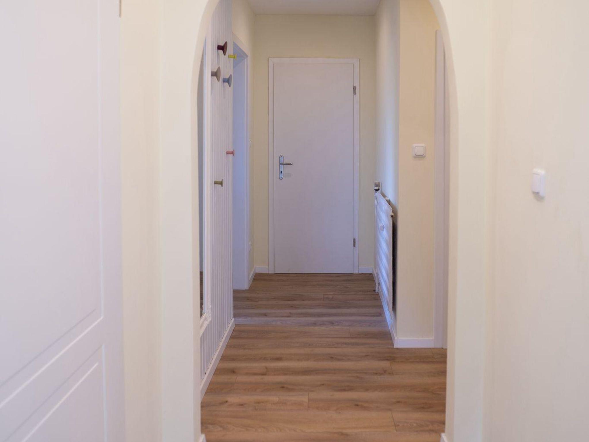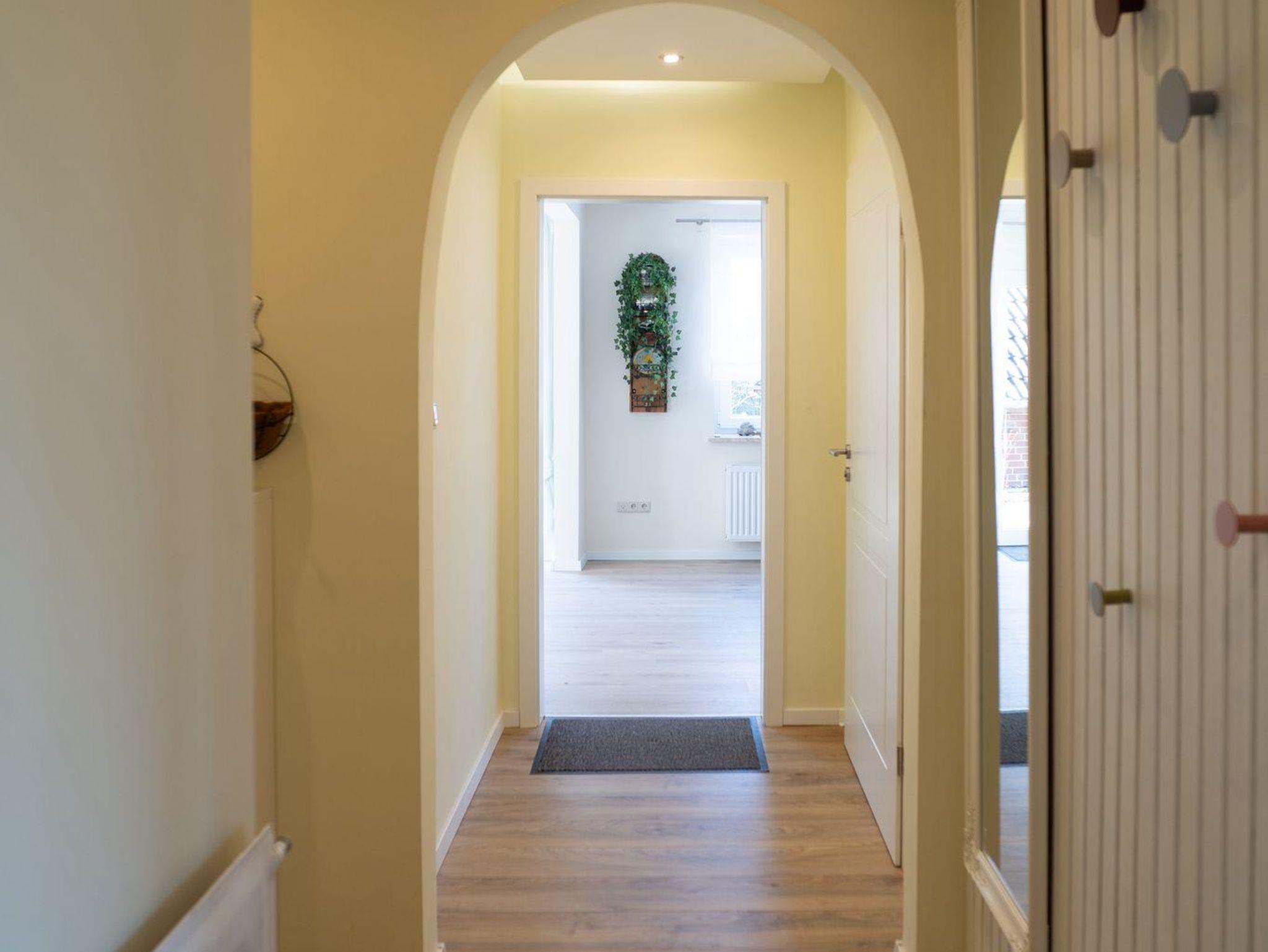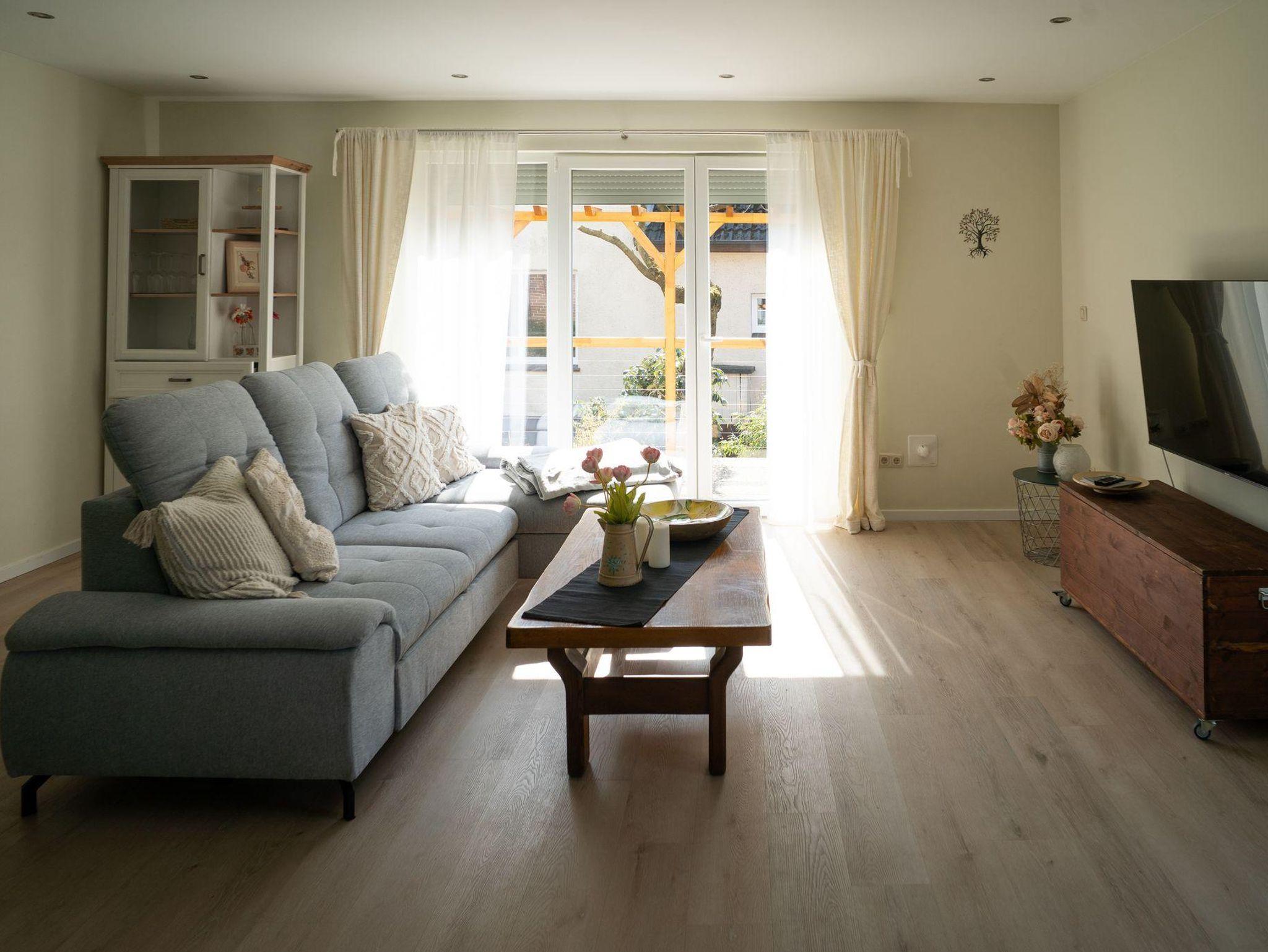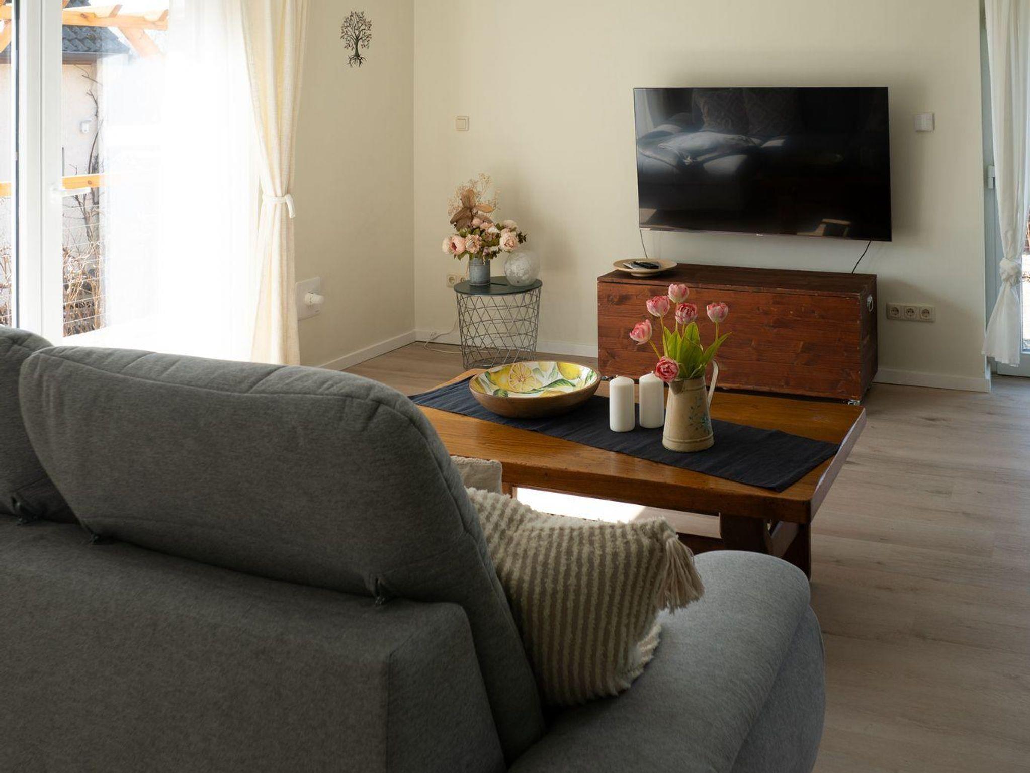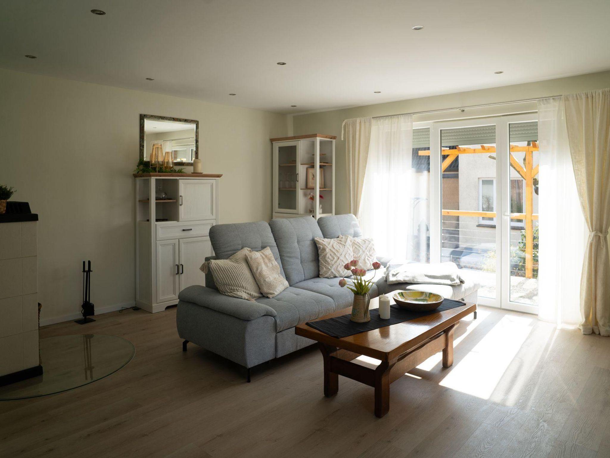 Hell und modern eingerichtete Ferienwohnung im Erdgeschoss. Die Ferienwohnung verfügt über eine Wohnküche mit vollausgestatteter Küchenzeile und Essgelegenheit, ein Schlafzimmer mit einem 1,80 m großen Boxspringbett und TV und ein Bad mit Dusche und WC welches barrierearm ist. Die großzügige Terrasse ist vom Wohnzimmer erreichbar. Im Bad und im Wohnzimmerbereich ist die Ferienwohnung mit einer Fußbodenheizung ausgestattet.