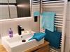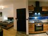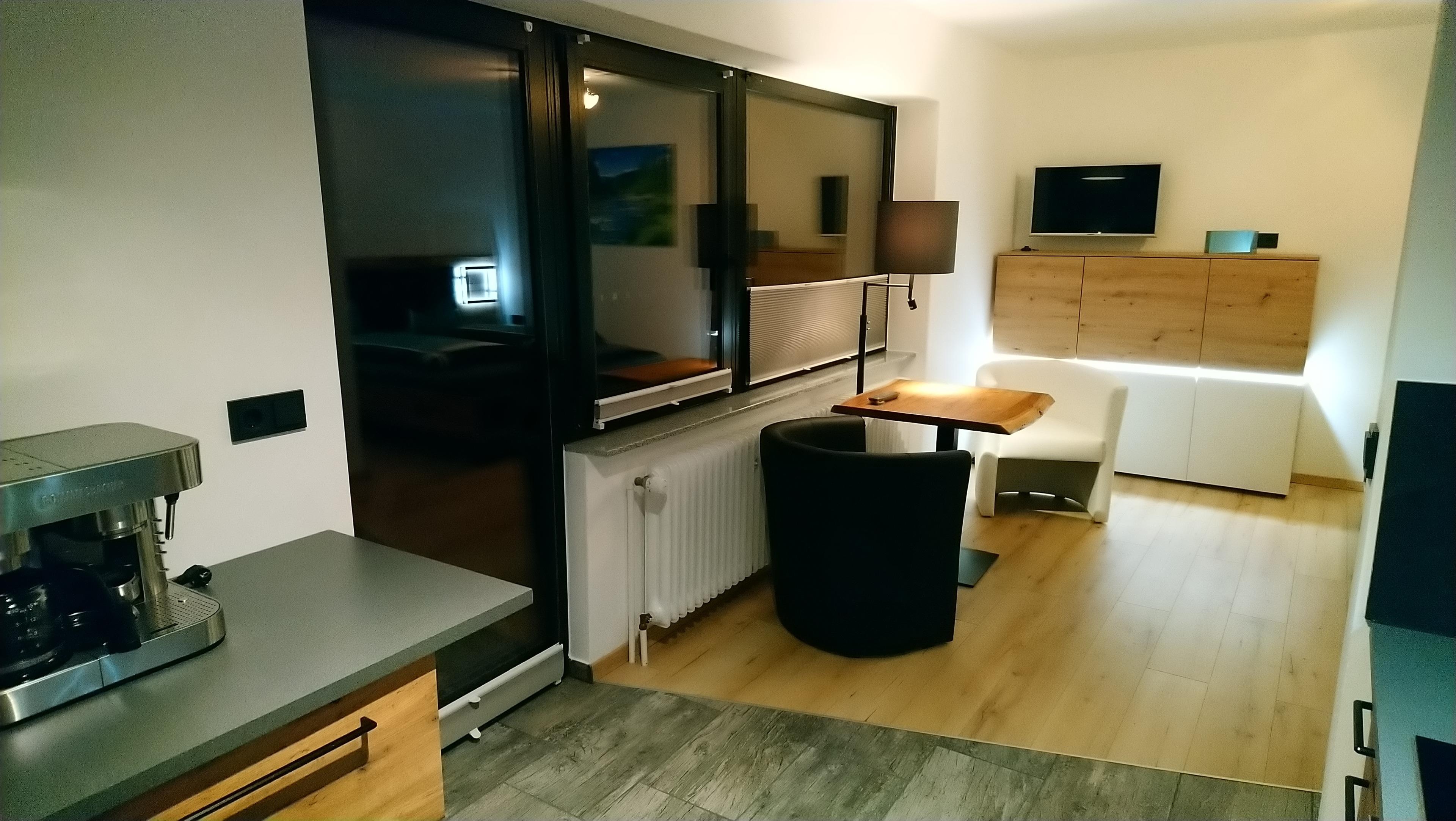 Modern eingerichtete Ferienwohnung mit einem Bad, Flur, Wohn/Schlafzimmer sowie offenem Küchen/Essbereich.