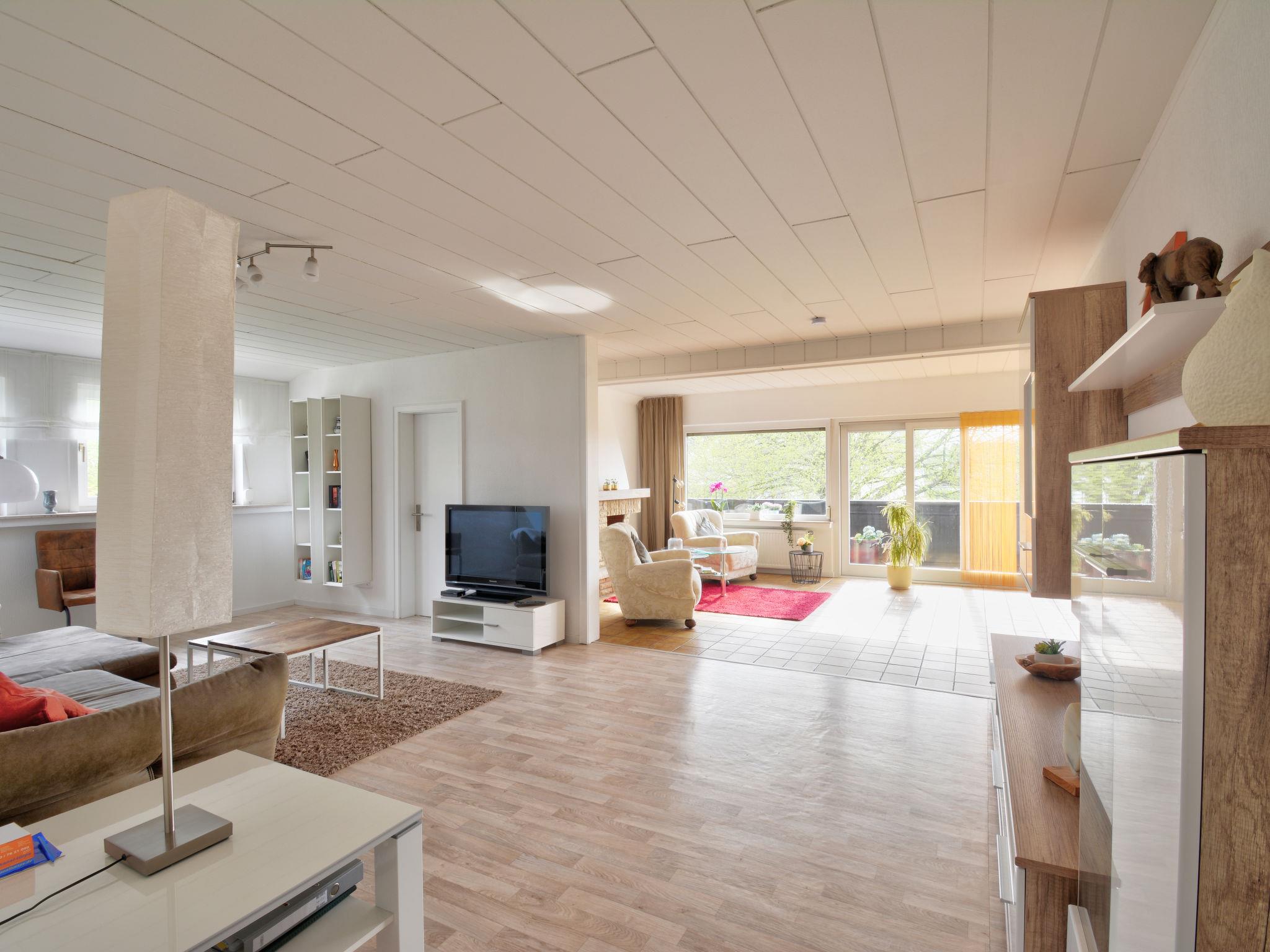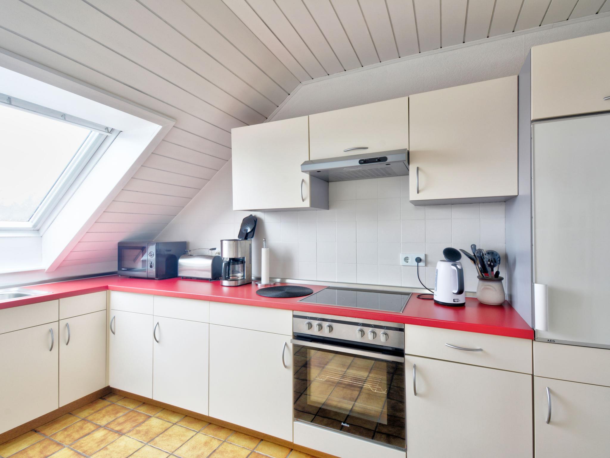 2-room apartment 90 m2, on the top floor. Cosy furnishings: living/sleeping room 51 m2 with 1 sofabed (90 cm, length 200 cm), 1 folding bed (90 cm, length 200 cm), dining nook and satellite TV (flat screen), CD-player. Exit to the balcony. 1 room 19 m2, with sloping ceilings with 1 double bed (180 cm, length 200 cm). Exit to the balcony. Kitchen (oven, dishwasher, 4 ceramic glass hob hotplates, microwave, electric coffee machine). Bath/shower/bidet/WC. Underfloor heating. 2 balconies 10 m2. Balcony furniture, box-room. View of the garden and the resort. Facilities: iron, children's high chair (extra), hair dryer. Internet (WiFi, free). Please note: non-smokers only. Smoke alarm, fire extinguisher. Decorative fireplace. The two balconies are covered.