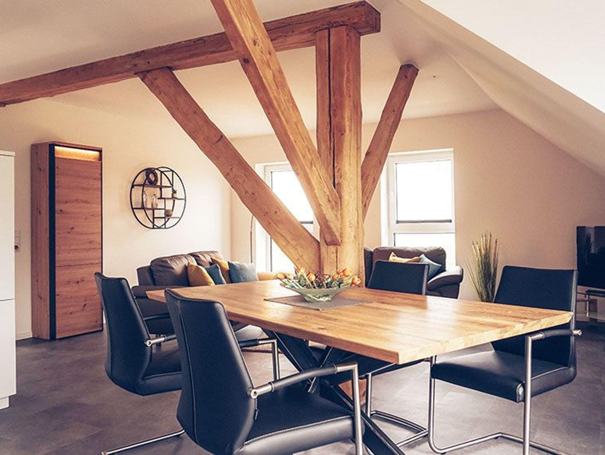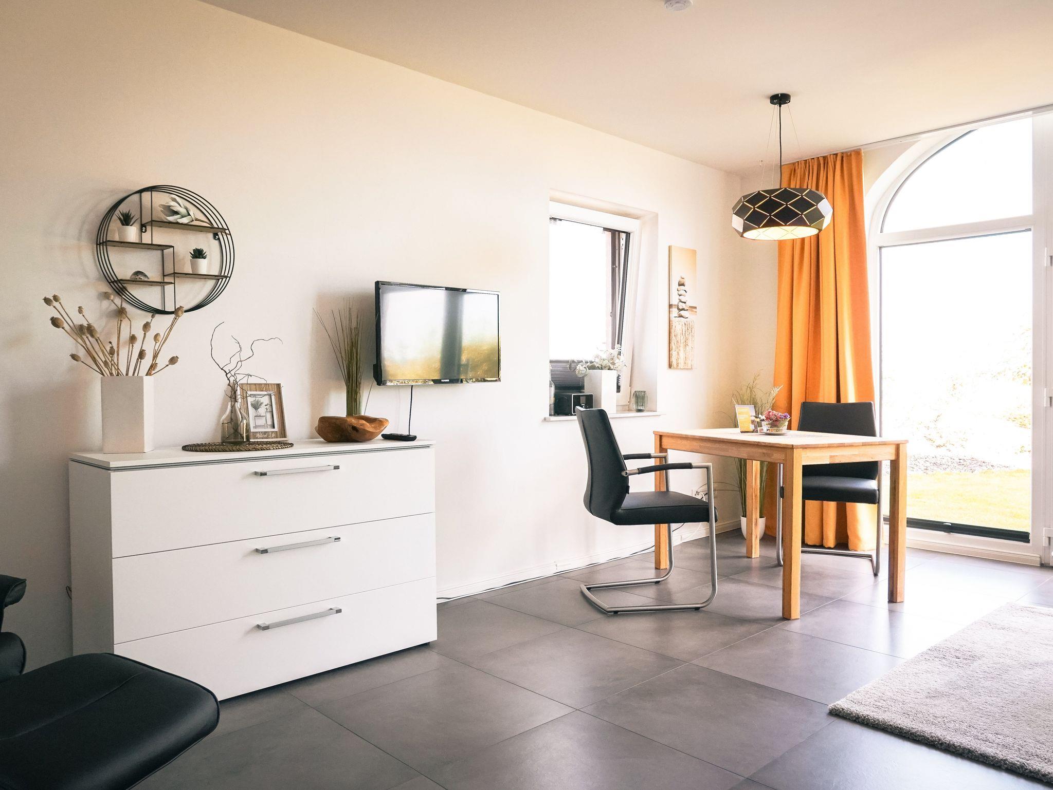 Wohnung 6 bietet Ihnen einen gemütlichen Wohn-Schlaf-Essbereich mit Blick in die Wiesen. Die große Dielentür wurde durch ein bodentiefes Fenster ersetzt, welches für viel Licht sorgt. Die Wohnung bietet bis zu zwei Personen Platz. Hier schlafen Sie auf einer hochwertigen und bequemen Schlafcouch.