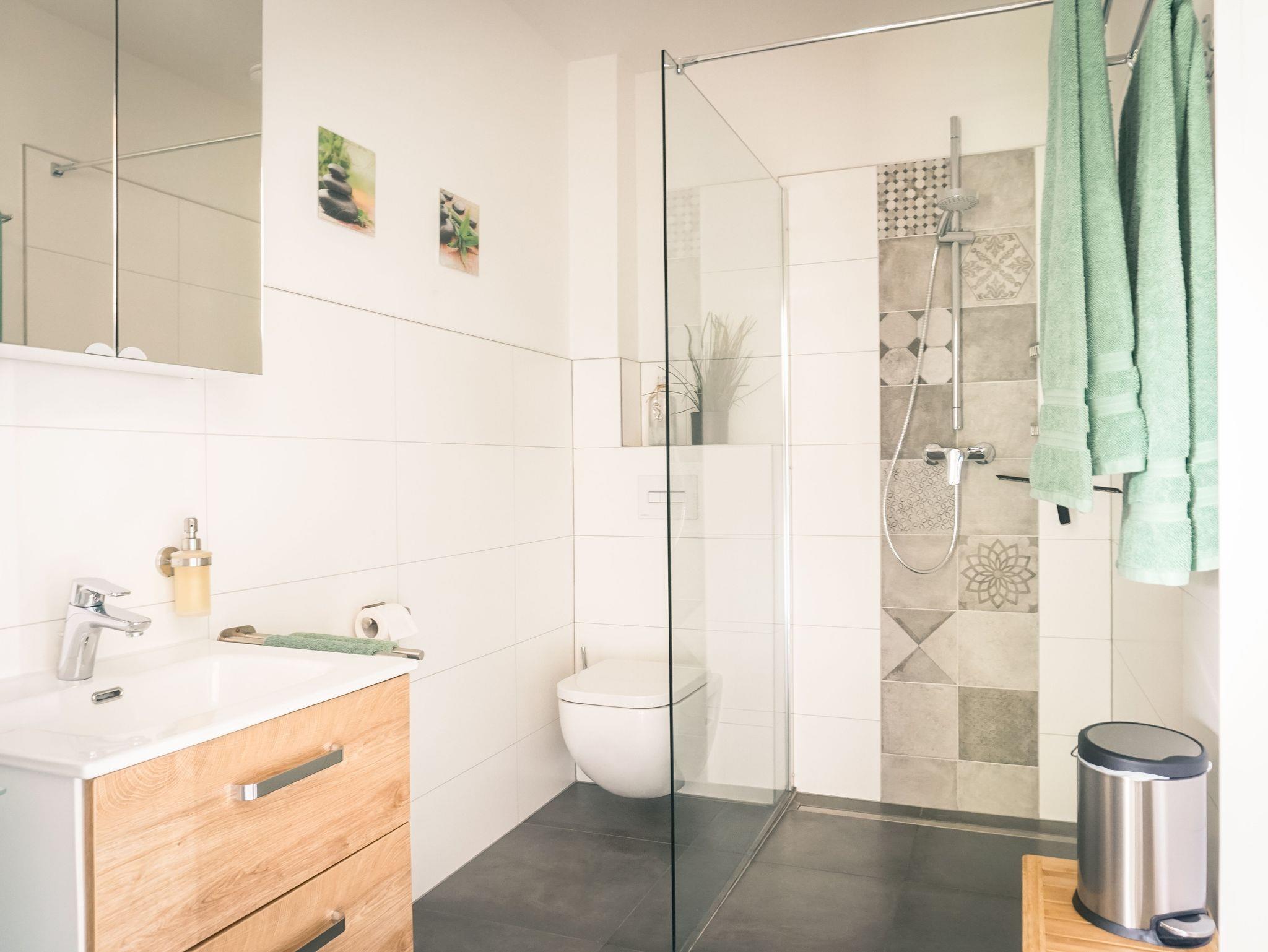 Modern und komfortabel. So präsentiert sich Wohnung Nr. 5 im Obergeschoss. Auch hier genießen Sie alle Vorzüge unserer großzügigen Wohnungen. Auf insgesamt 70m² finden Sie hier Ruhe und Entspannung. Der 40m² große Wohn- und Essbereich lädt mit gemütlichen Möbeln und der vollausgestatteten Küche zum Kochen und verweilen ein.