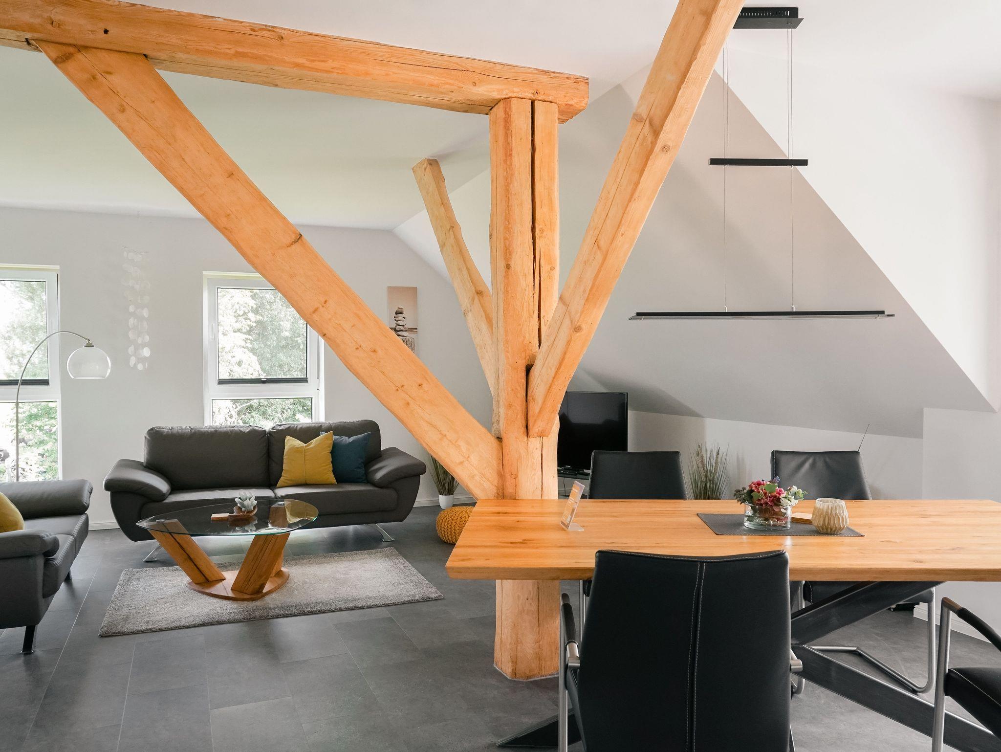 Besonderes Flair entsteht auch hier durch das offene Gebälk des alten Bauernhauses, welches optische Akzente setzt und zur gemütlichen Atmosphäre der Wohnung beiträgt. Bis zu 4 Personen können in dieser Wohnung den Urlaub genießen. Hierfür steht neben einem Schlafzimmer mit einem Doppelbett noch ein kleines Zimmer mit zwei Einzelbetten zur Verfügung. Ebenfalls gehört zu dieser Wohnung auch ein Balkon der Ihnen z. B. in den Abendstunden einen herrlichen Rückzugsort mit Blick auf die Weser bietet.