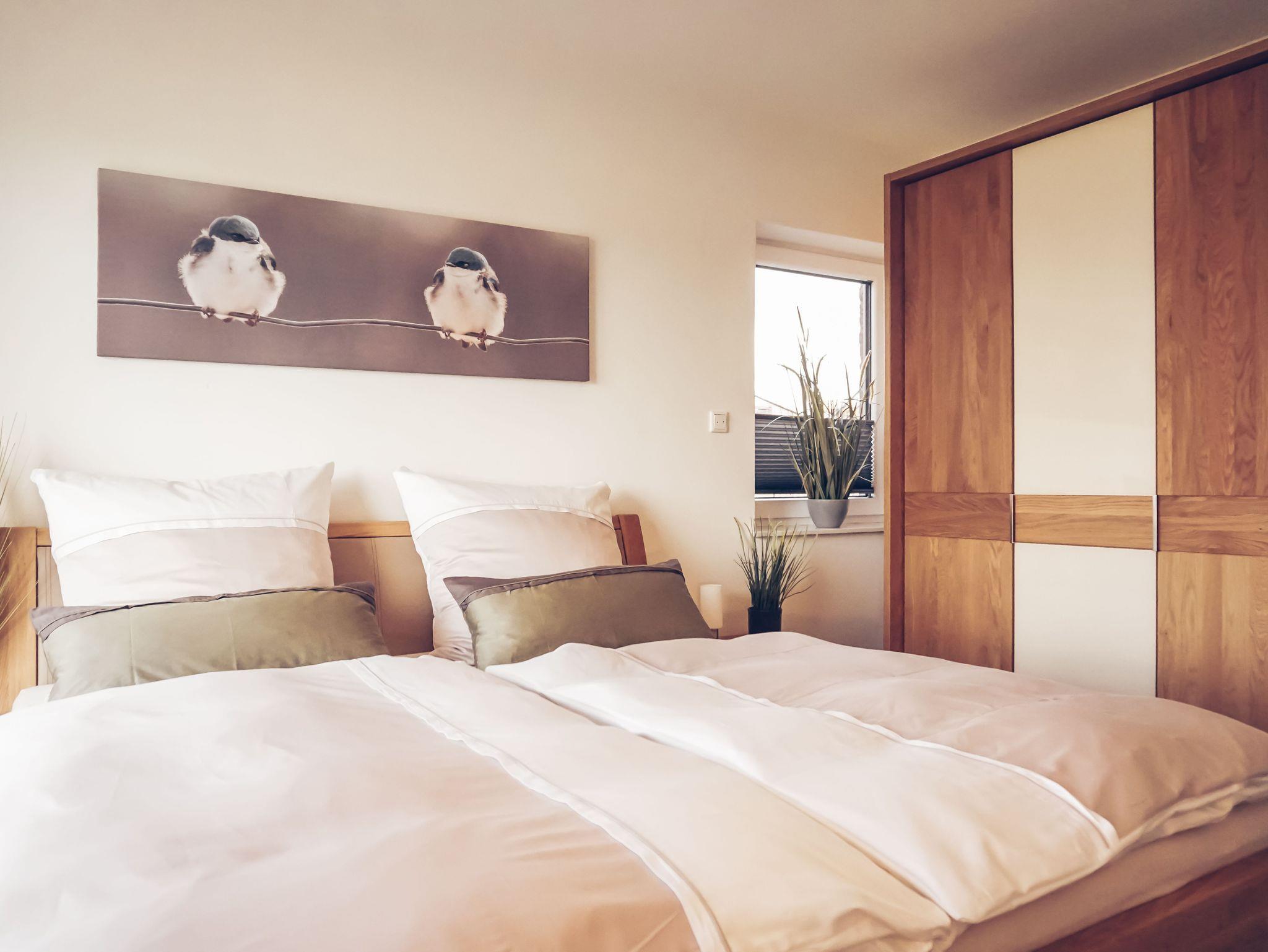 Auf 70m² Gesamtwohnfläche finden Sie ebenfalls zwei Schlafzimmer, eines davon ist mit einem großzügigem Doppelbett ausgestattet, aus dem Sie einen direkten Blick auf die Weser genießen können, so macht Schiffe beobachten noch mehr Spaß! Zusätzlich gibt es ein kleines Zimmer mit zwei Einzelbetten.