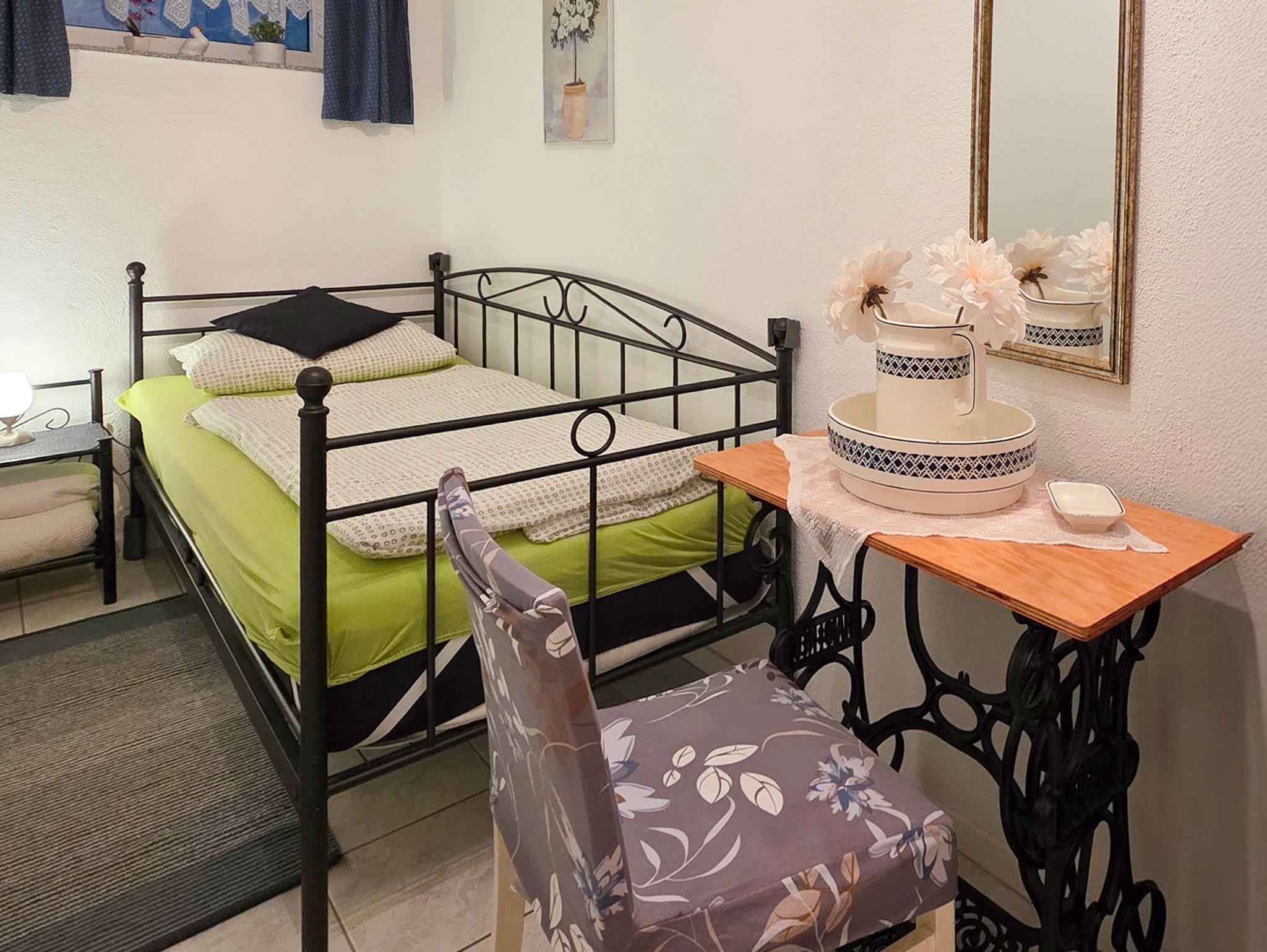 Im romantischen Schlafzimmer mit Doppelbett können sie ruhige Nächte verbringen. Das Bett ist bei ihrer Ankunft fertig bezogen, Bettwäsche ist inklusive. 2 Nachtkonsolen und 1 Sideboard befinden sich dort. Ein Babybett kann zugestellt werden.