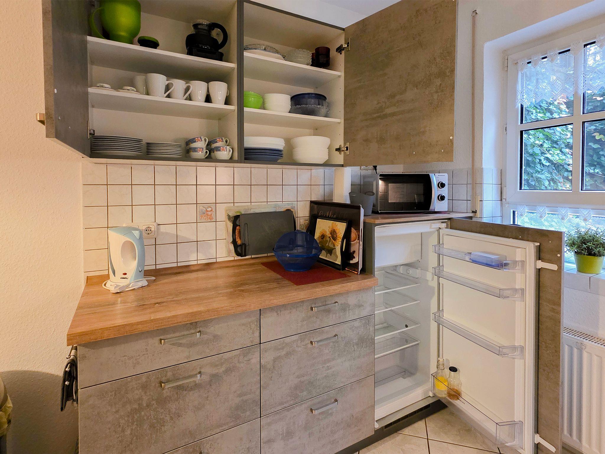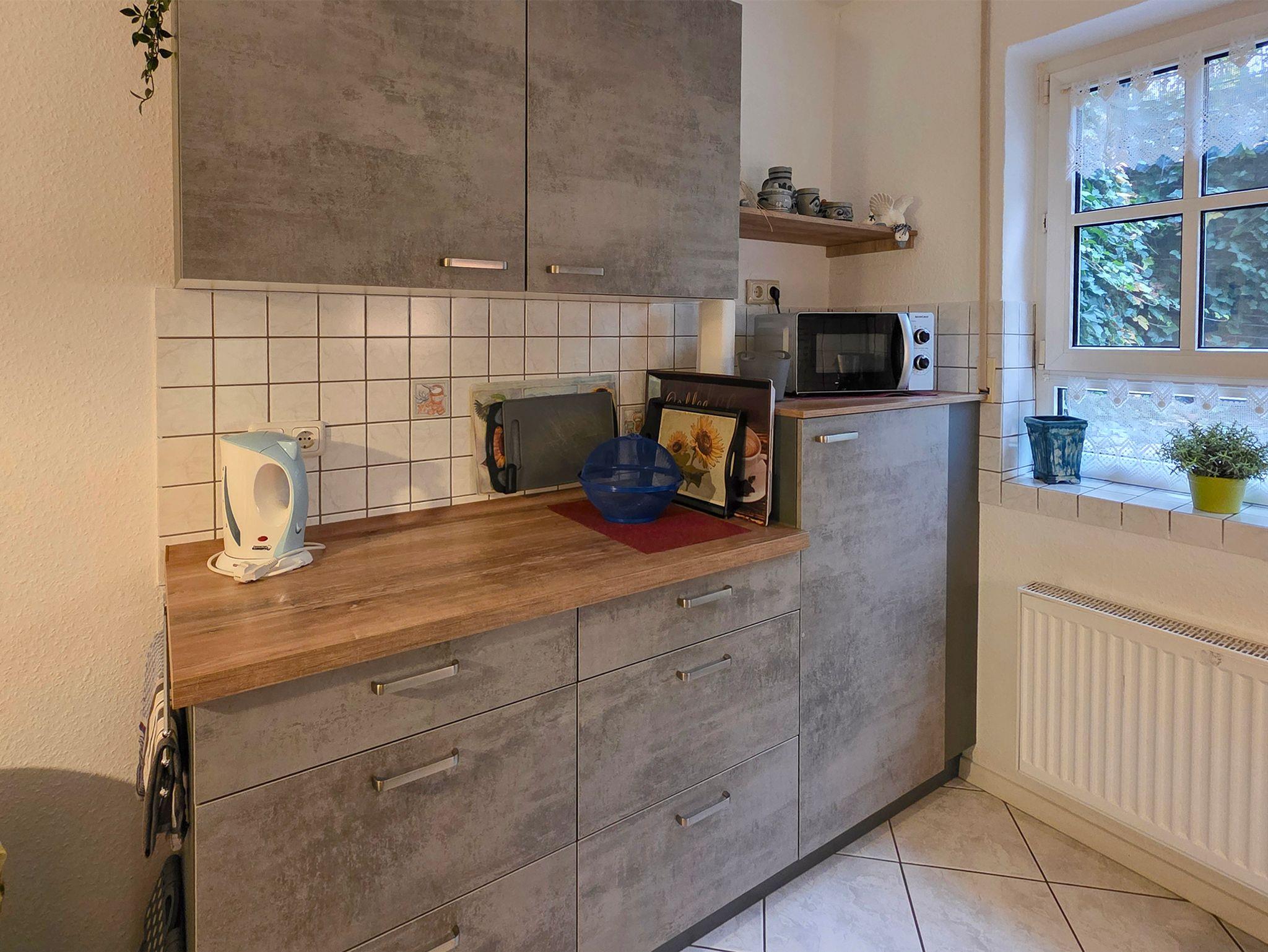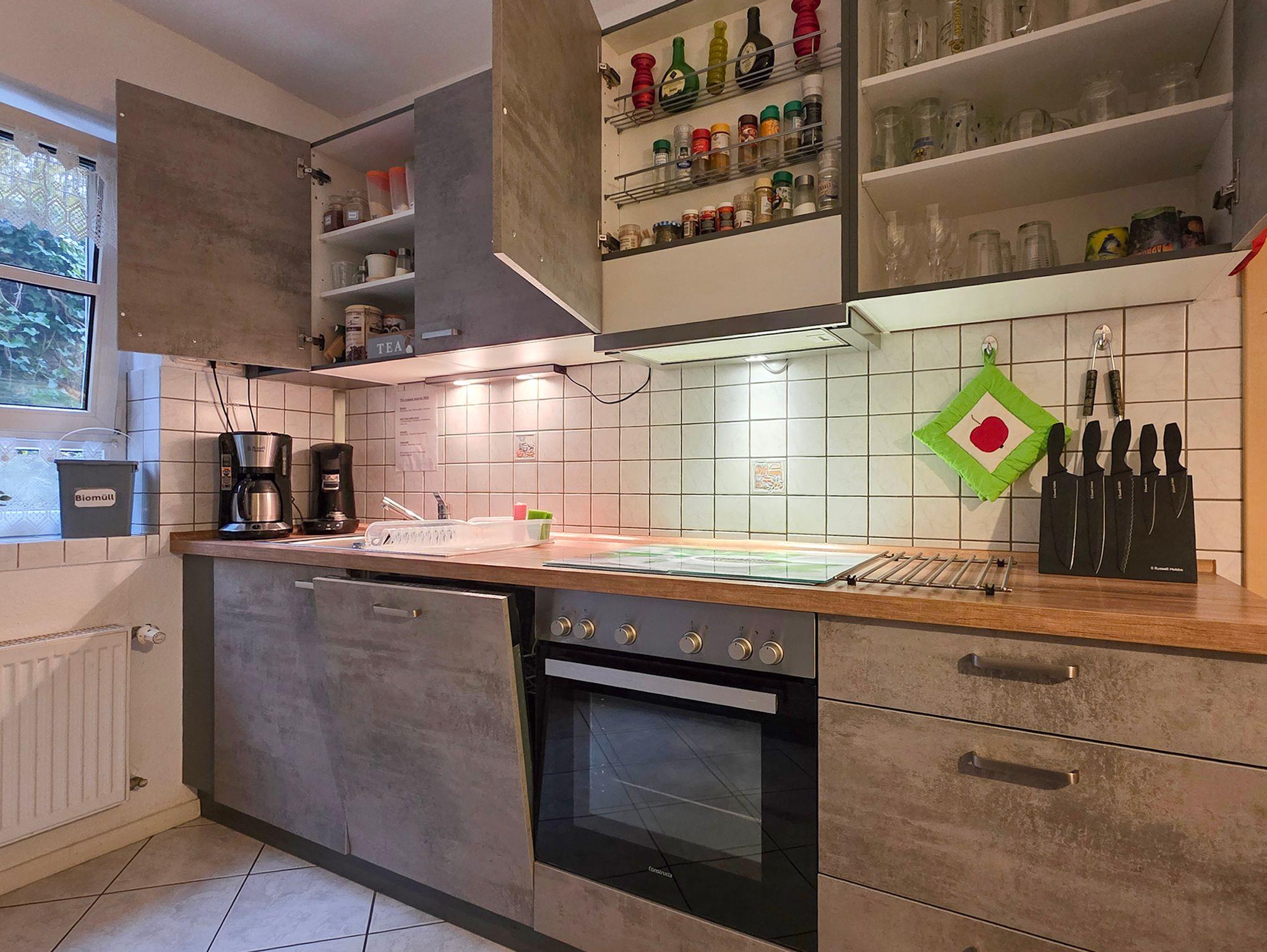 Die geräumige Küche mit großem Esstisch, Eckbank und Stühlen ist gemütlich eingerichtet. Ein Hochstuhl für ein Kleinkind kann gestellt werden.In der Küche befindet sich: Elektroherd mit Backofen, Mikrowelle, Spülmaschine, Kühlschrank mit Gefrierfach, Wasserkocher, Kaffeemaschine, Kaffeepadmaschine, Toaster, Eierkocher, Mixer, Küchenwaage, Kuchenform sowie div. Geschirr ist ebenfalls reichlich vorhanden.In den Schränken ein kleiner Vorrat an Gewürzen usw. In der Küche befindet sich ein Radio. Tischwäsche wird gestellt.