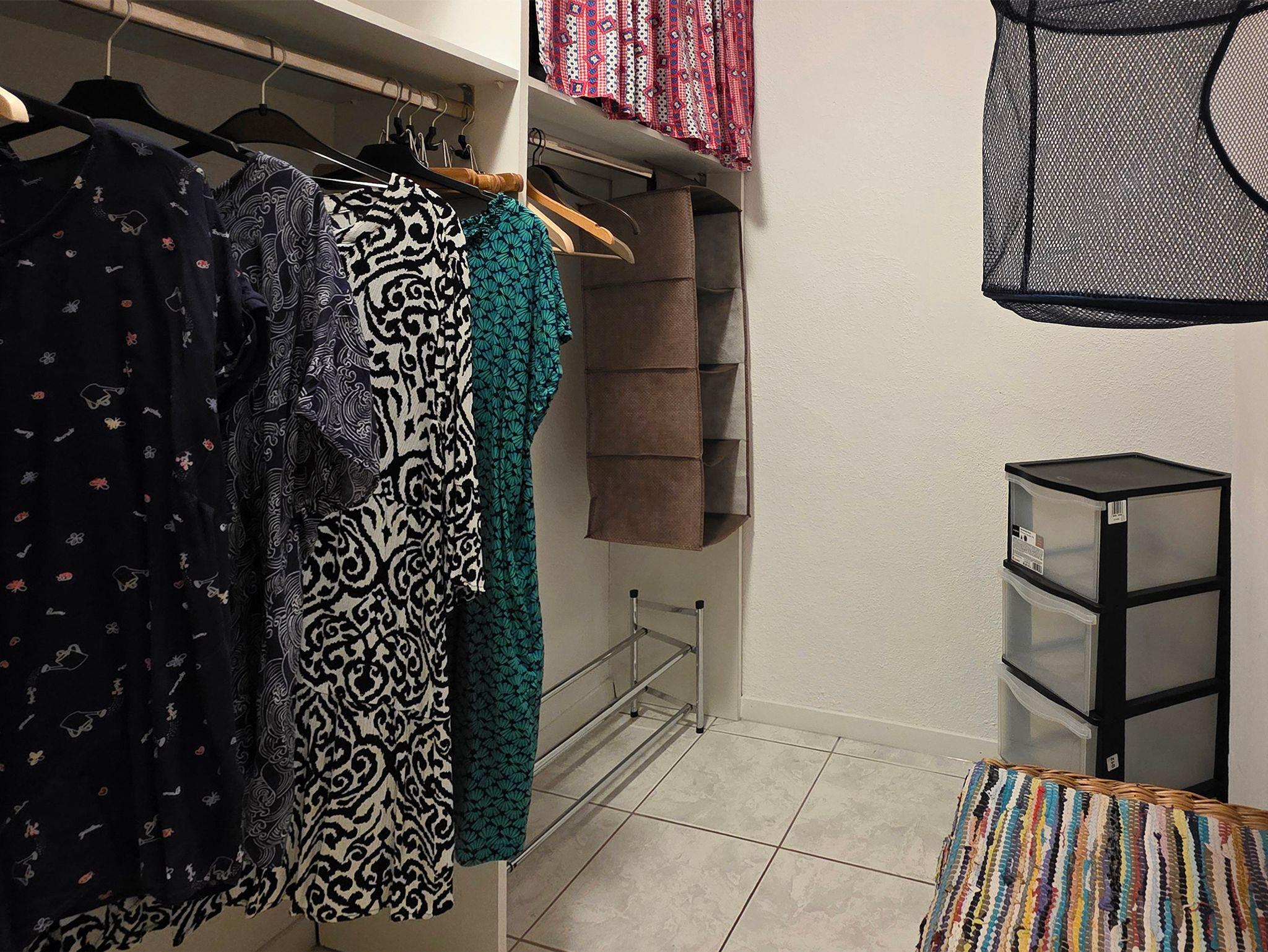 Schräg gegenüber steht ihnen ein begehbarer, geräumiger Kleiderschrank zur Verfügung.