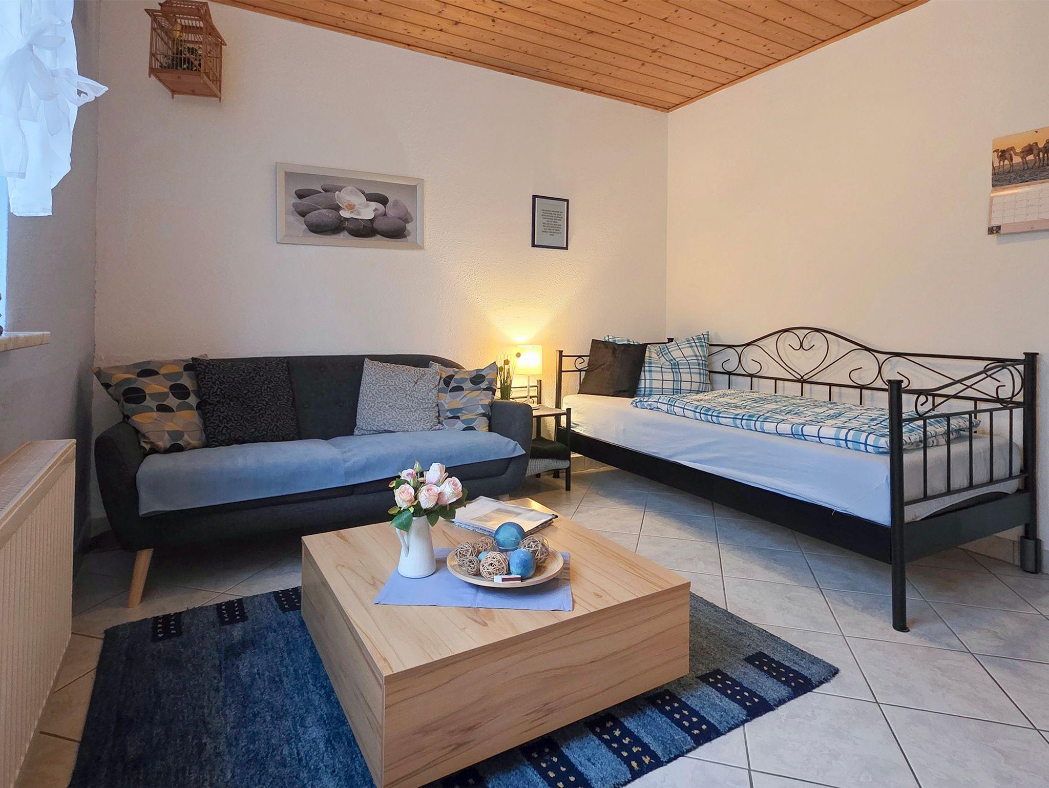 Das gemütliche Wohnzimmer lädt zum verweilen ein. Hier befindet sich ein Sofa und ein bequemes Einzelbett (90x200cm), ein Couchtisch, eine Schrankwand mit TV und Stereoanlage. Hier können Sie Ihren Urlaubstag gemütlich ausklingen lassen. Für die Freizeitplanung liegen Prospekte mit Ausflugsmöglichkeiten bereit.Gerne beraten wir Sie hierzu und geben Ihnen Tips. Ebenso ein paar Bücher und diverse Spiele.