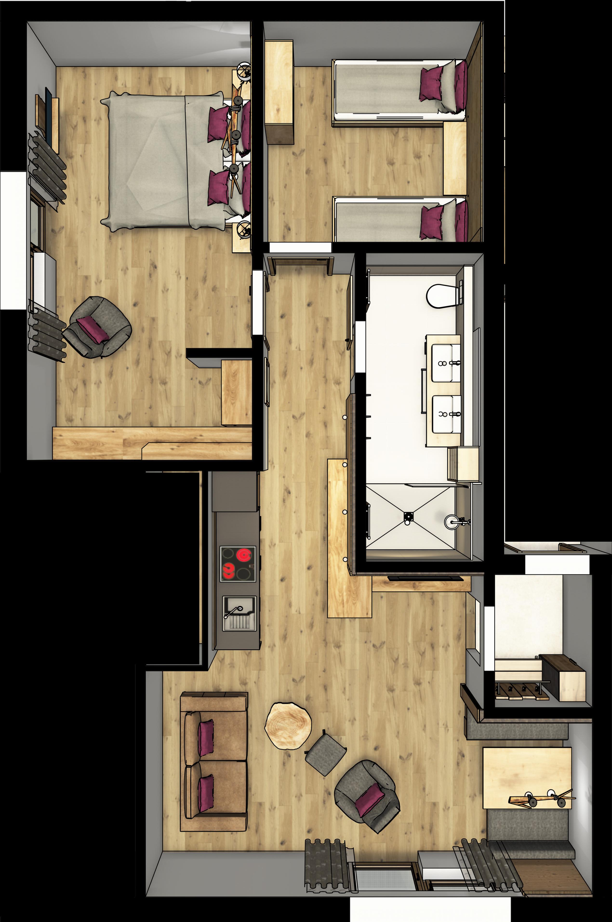 Ein offen gestalteter Wohn-Essbereich mit Sitzbänken, ein gemütliches Ecksofa und ein modernes Badezimmer mit Doppelwaschtisch und begehbarer Dusche ergänzen sich zu absolutem Wohngenuss. Ein Schlafzimmer mit Boxspringbett, das zweite mit zwei getrennt stehenden Betten.