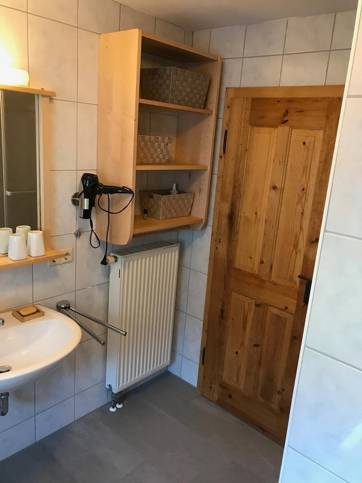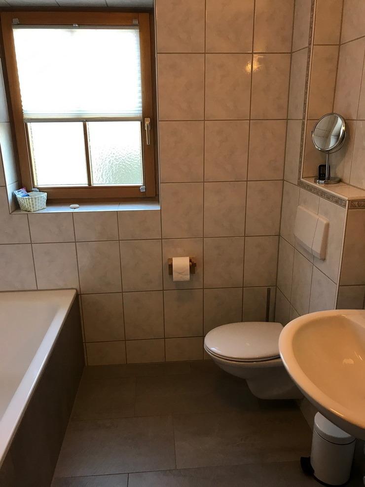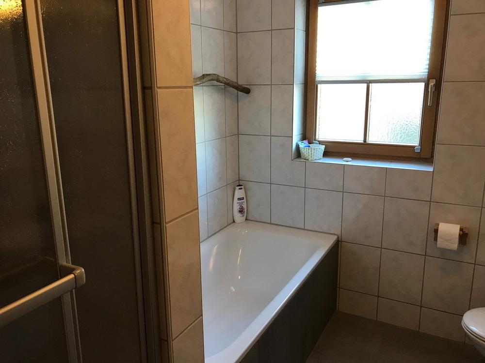 In dem Tageslichtbad befindet sich eine Badewanne, Dusche, Waschbecken, WC und ein Föhn.