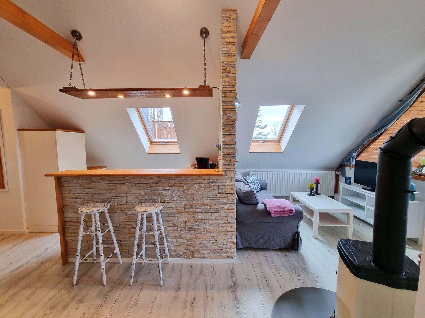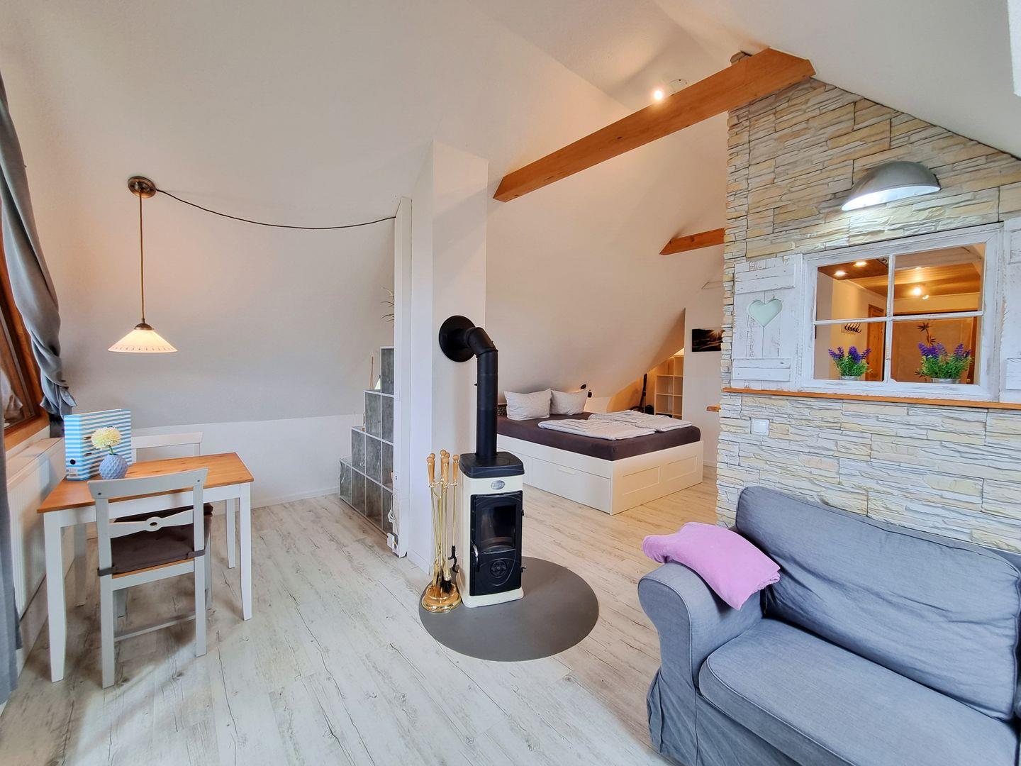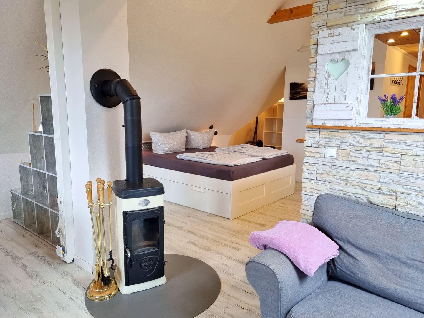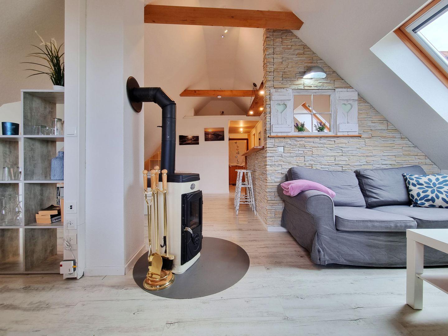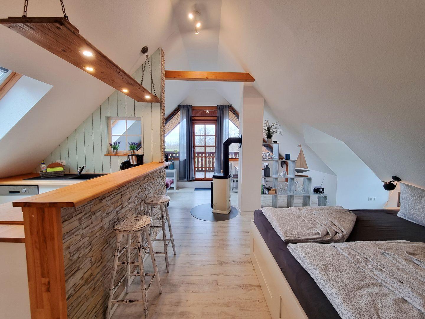 Die moderne Ferienwohnung besticht durch einen offenen Schnitt, in dem Wohnbereich, Küche und Schlafzimmer vereint werden. Viele Fenster sorgen für reichlich Tageslicht in dem schönen Appartement. Dusche und WC sind in getrennten Räumen angelegt. Über den Wohnbereich geht es raus auf den wettergeschützten Balkon, mit Weitblick über grüne Felder, der an guten Tagen sogar einen fernen Meerblick zu bieten hat. Ein Kaminofen sorgt für wohlige Wärme.