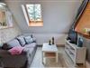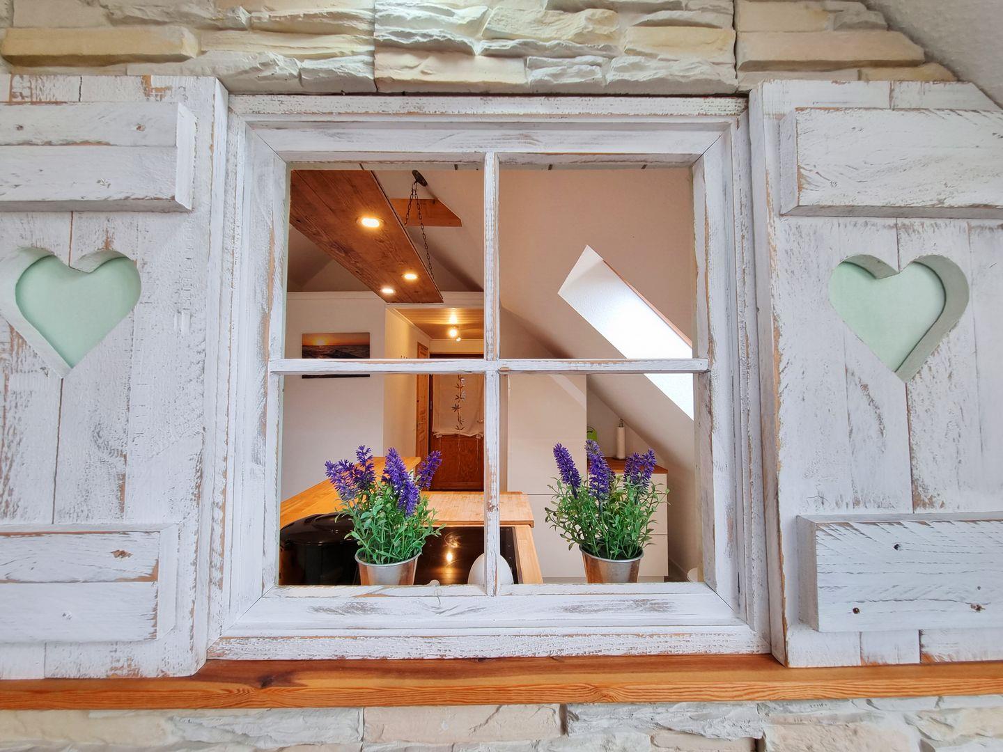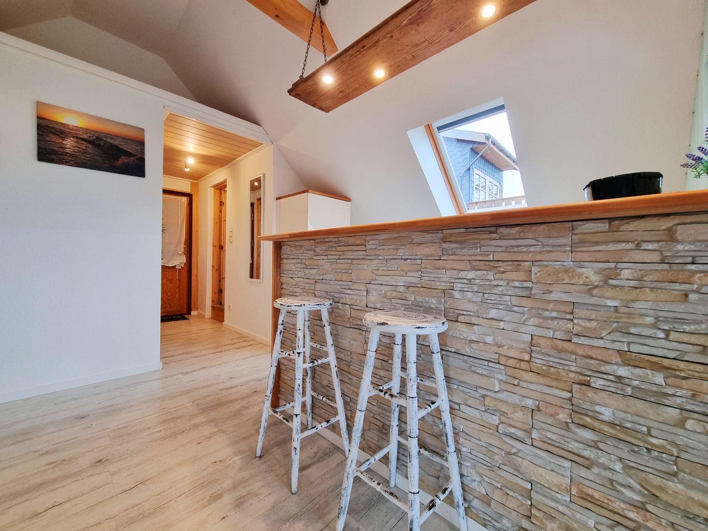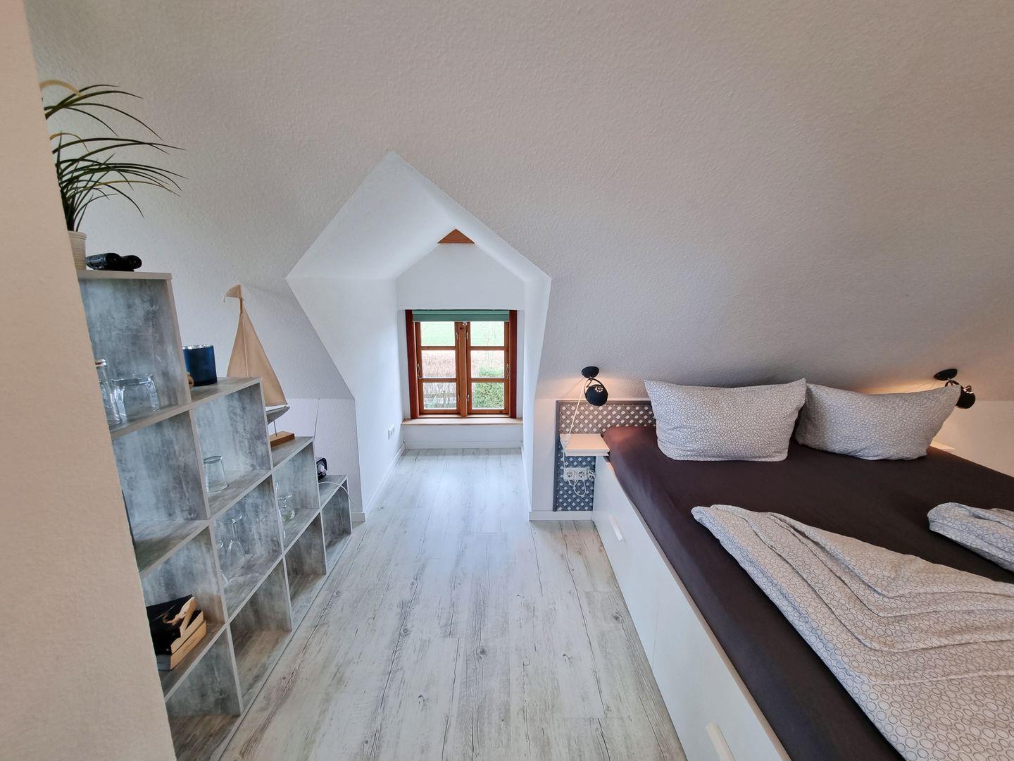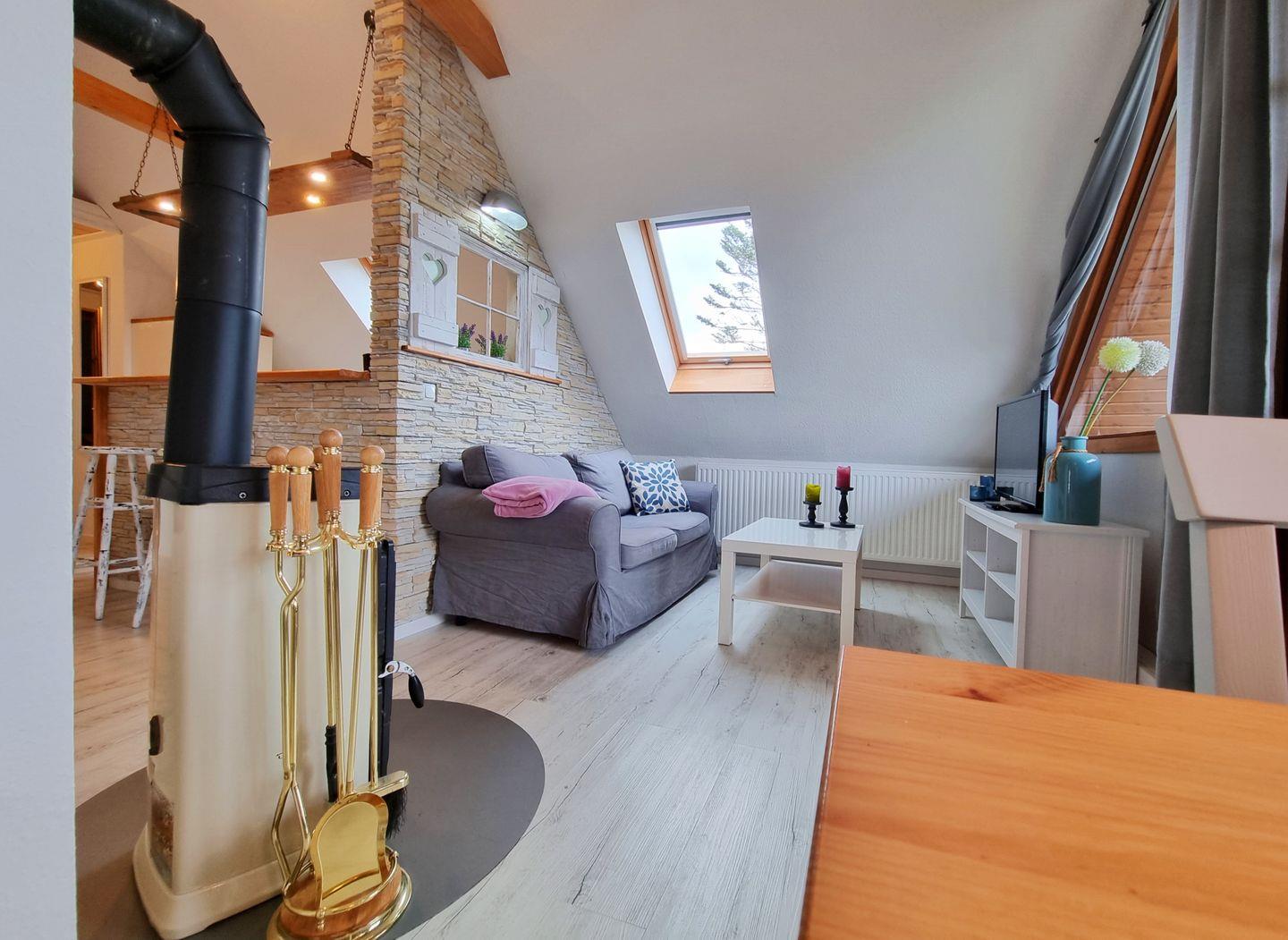 Die moderne Ferienwohnung besticht durch einen offenen Schnitt, in dem Wohnbereich, Küche und Schlafzimmer vereint werden. Viele Fenster sorgen für reichlich Tageslicht in dem schönen Appartement. Dusche und WC sind in getrennten Räumen angelegt. Über den Wohnbereich geht es raus auf den wettergeschützten Balkon, mit Weitblick über grüne Felder, der an guten Tagen sogar einen fernen Meerblick zu bieten hat. Ein Kaminofen sorgt für wohlige Wärme.